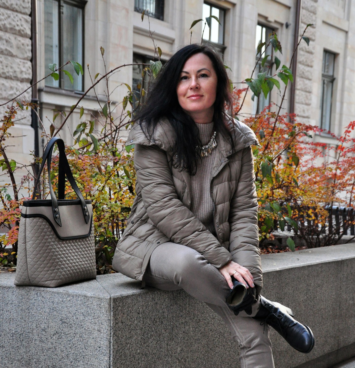 spodnie – Oui   sweter – Oui   kurtka – Oui   torba – Goshico   naszyjnik – Tatami   okulary – Brylove