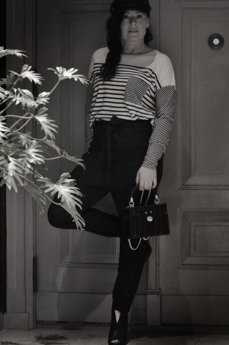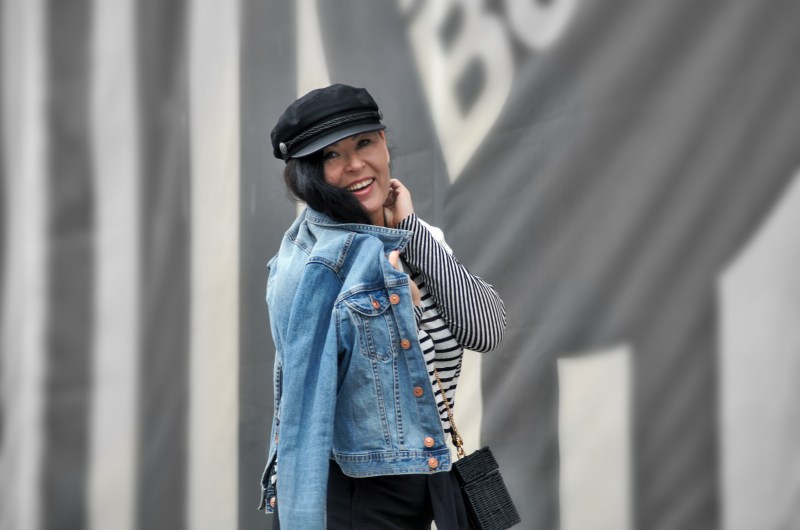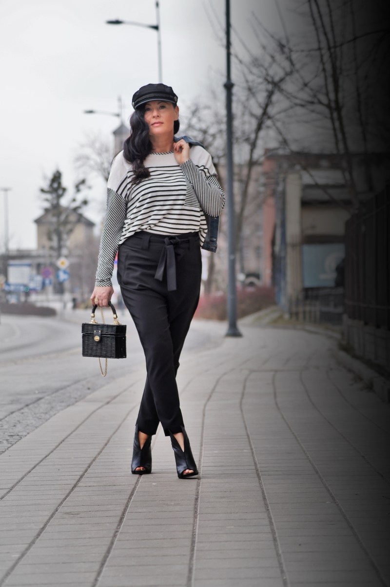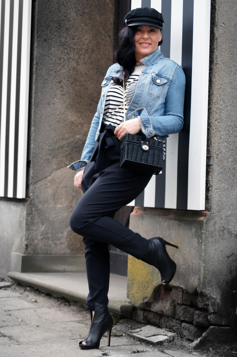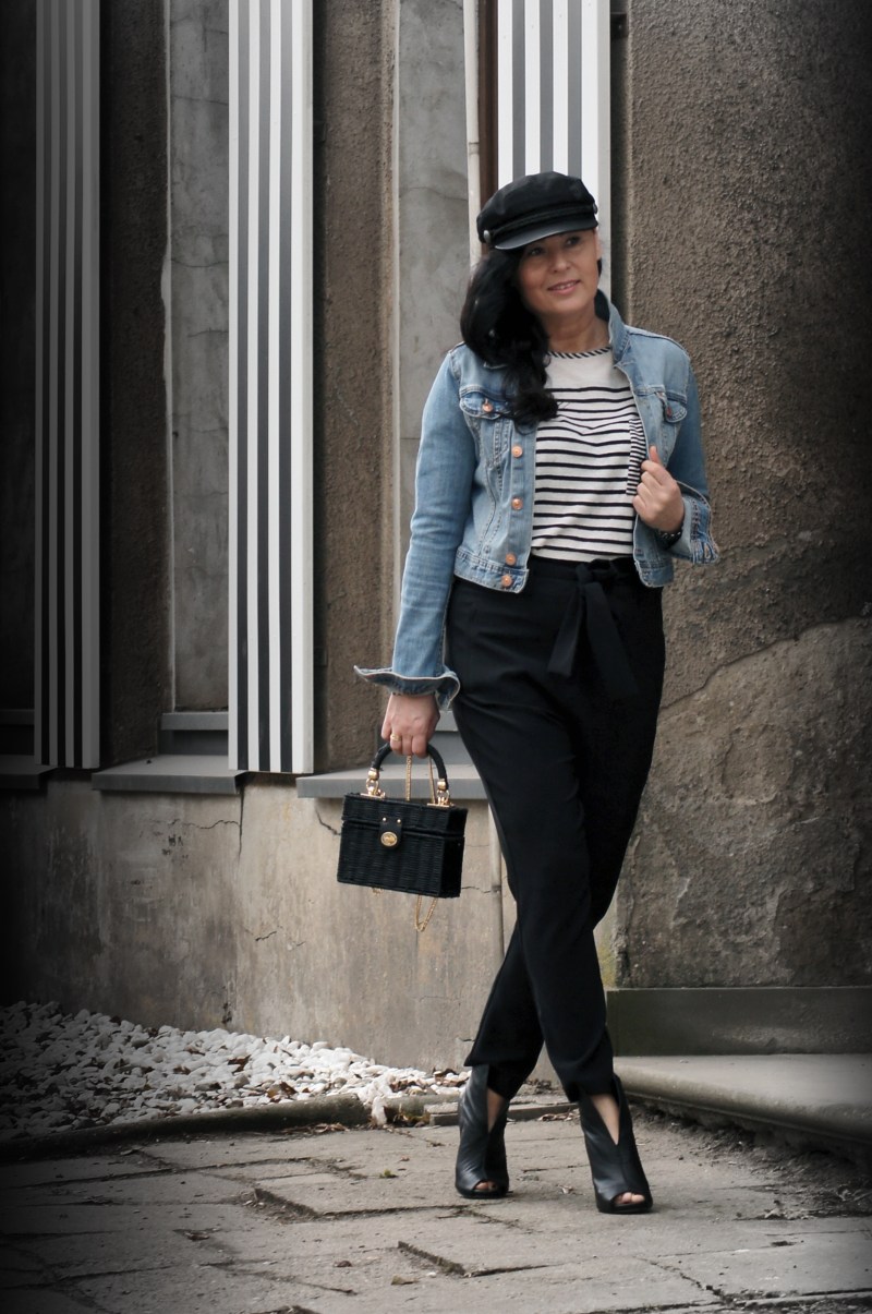 Denimowa kurtka i koszyk to nic innego jak uwielbiany prze ze mnie styl Jane Birkin. Ta klasyczna kurtka to teraz must have. Obowiązkowym elementem wiosennych stylizacji będzie także koszyk. Ja wybrałam czarny kuferek na złotym łańcuszku. Wykorzystam go z pewnością, do letnich stylizacji w stylu boho. Wiklina, świetnie pasuje do stylu marynistycznego, dlatego dziś prezentuje czarne spodnie, wiązane w talii na kokardę, zestawione z obszerną bluzką w paski. Z dodatków wybrałam kaszkiet, który podobnie jak denim ma swój wielki powrót oraz bardzo kobiece botki z wyciętymi noskami.
