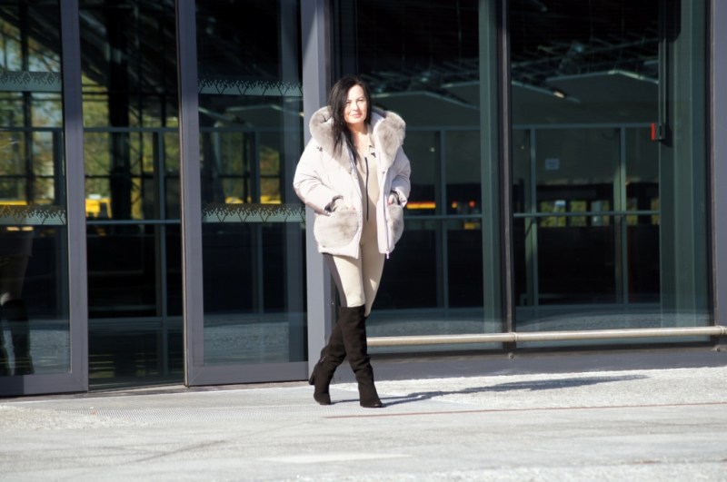 Dzisiejsza stylizacja składa się jedynie z trzech rzeczy: kombinezonu, butów i kurtki. To szybki zestaw w  który  nie włożyłam wiele wysiłku, a wygląda efektownie.  Mam dziś na sobie kolejny z moich kombinezonów. Ma on sportowy charakter, czarne wykończenia, jak lampasy i pagony na beżowym kombinezonie świetnie pasujące do czarnych, zamszowych kozaków.  Ostatnim elementem jest puchowa kurtka z futrzanymi wykończeniami, która cudownie otula w chłodne poranki.