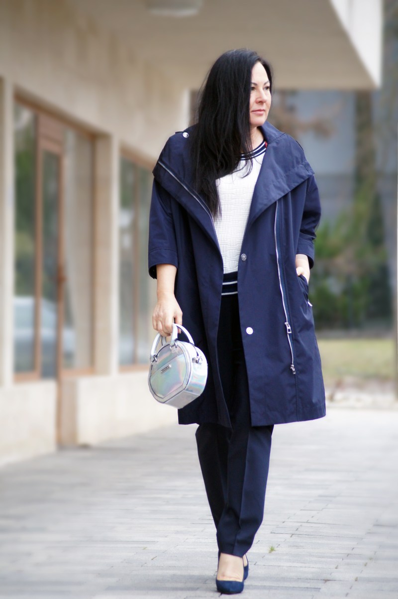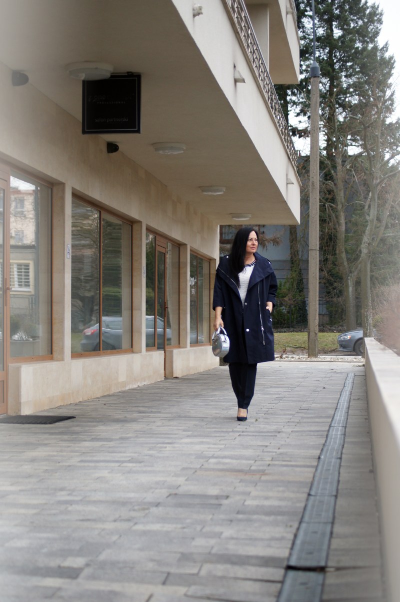 Dzisiejsza stylizacja to granatowy płaszcz z kapturem, granatowe spodnie i bluzka z dzianiny w stylu lat sześćdziesiątych. Dodatki to zamszowe czółenka na wysokim słupku, metaliczny kuferek oraz ażurowy pierścionek.