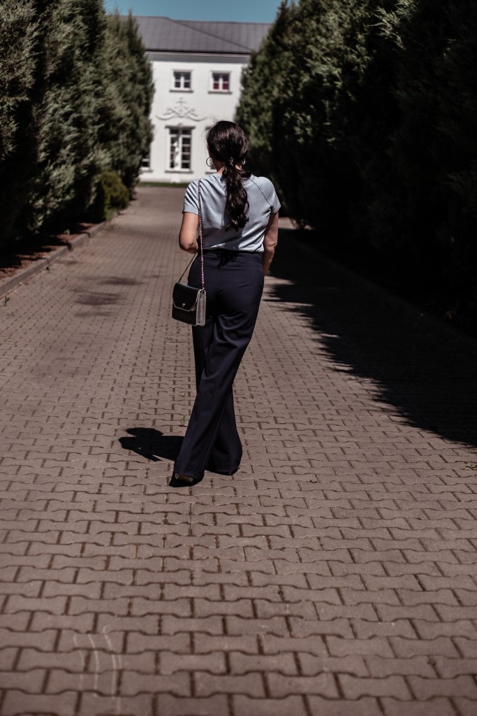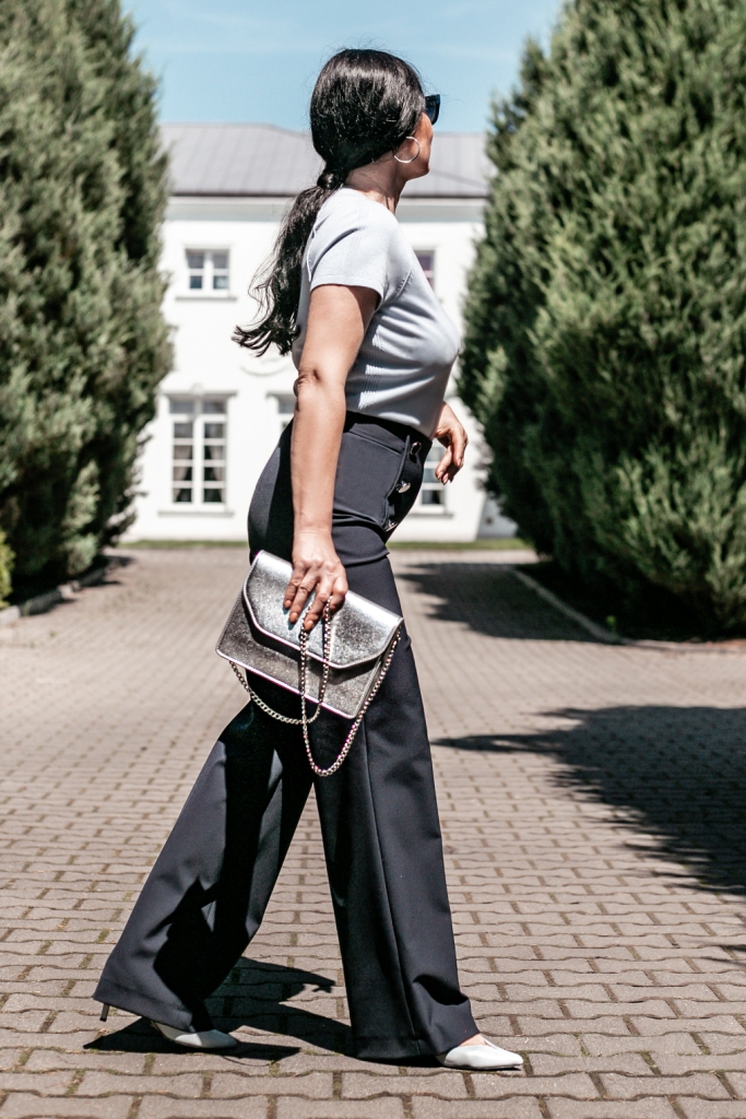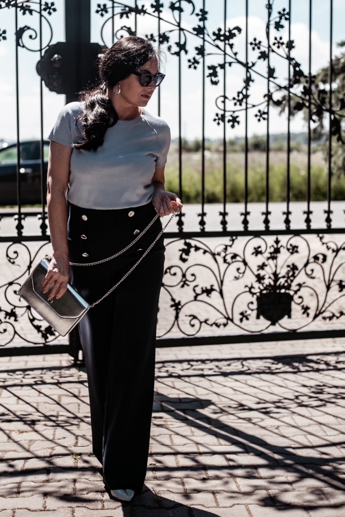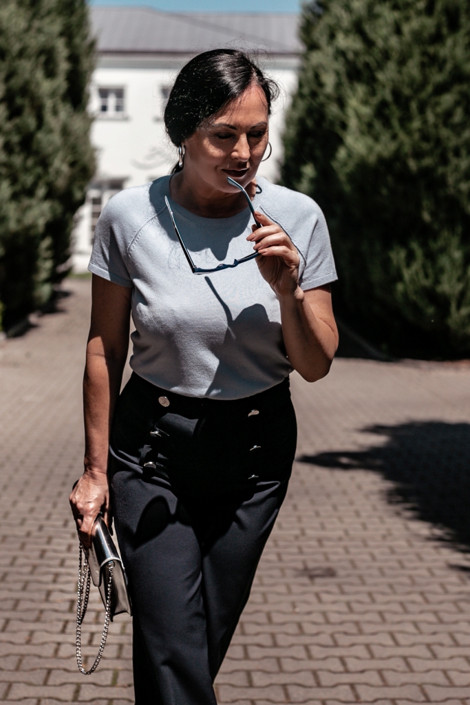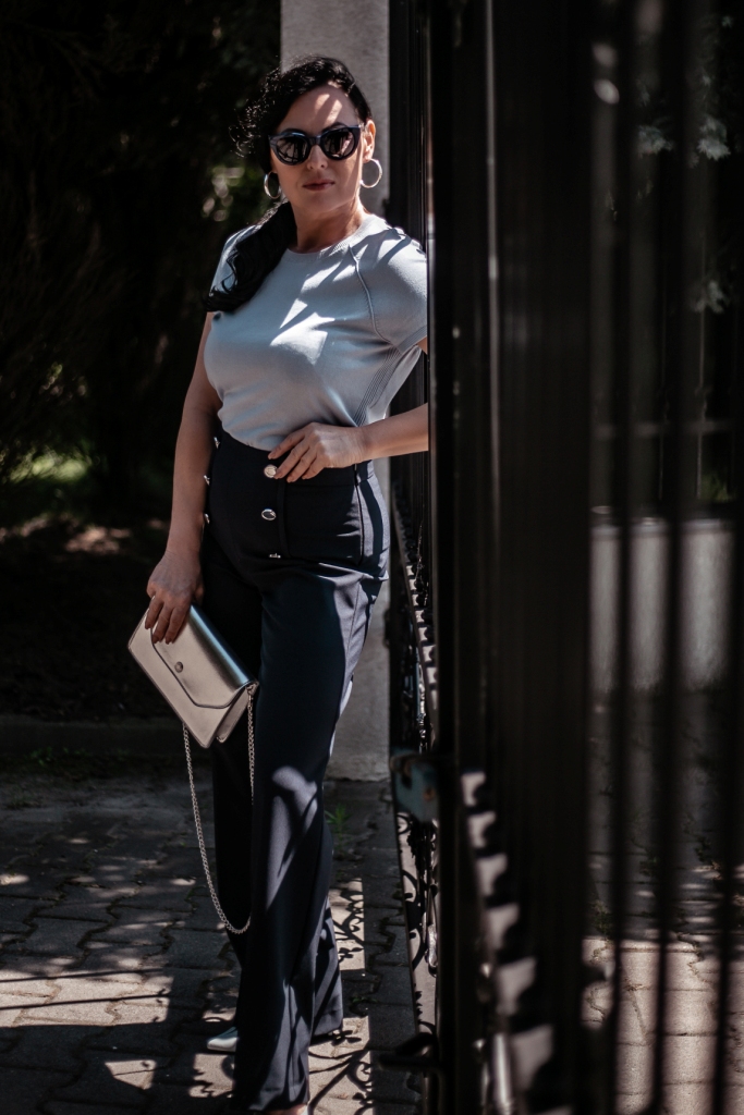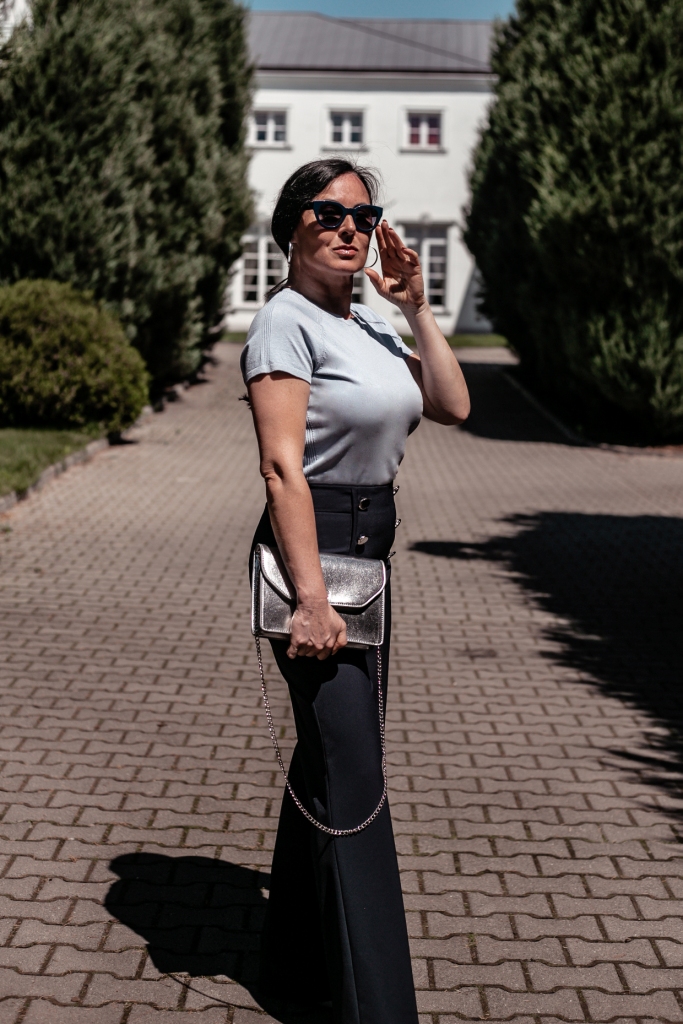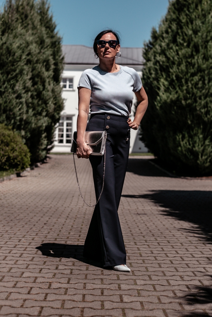 Uwielbiam stylizację w wersji ,,total look”. Jeśli nie potrafimy stworzyć takiego zestawu, to najlepiej zdecydować się na kombinezon, sama mam ich kilka. Dziś jednak postanowiłam wykorzystać w stylizacji różne odcienie koloru niebieskiego i różne faktury materiałów. Spodnie, które wybrałam to granatowe dzwony. Ich wysoki stan jest podkreślony dwoma rzędami srebrnych guzików, to właśnie przez nie zdecydowałam się na srebrną torebkę. Przy moim niskim wzroście zawsze przydaje się dodatkowe wydłużenie nogi. Skórzane czółenka z eleganckim wykrojem V z przezroczystą wstawką z pleksi, wysmukliły nogę. Na górę włożyłam dzianinową, błękitną bluzkę z krótkim rękawkiem, którą włożyłam w spodnie. Dodatki to srebrne kolczyki w kształcie kół i okulary przeciwsłoneczne w granatowej oprawie.