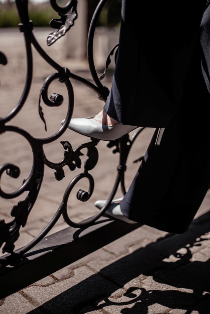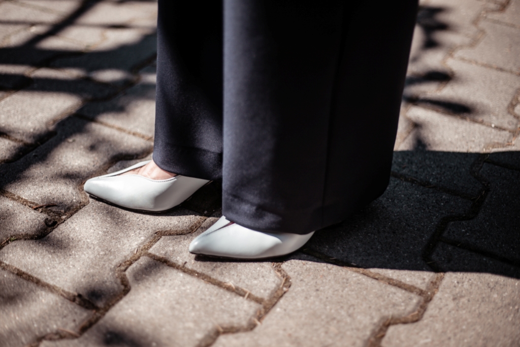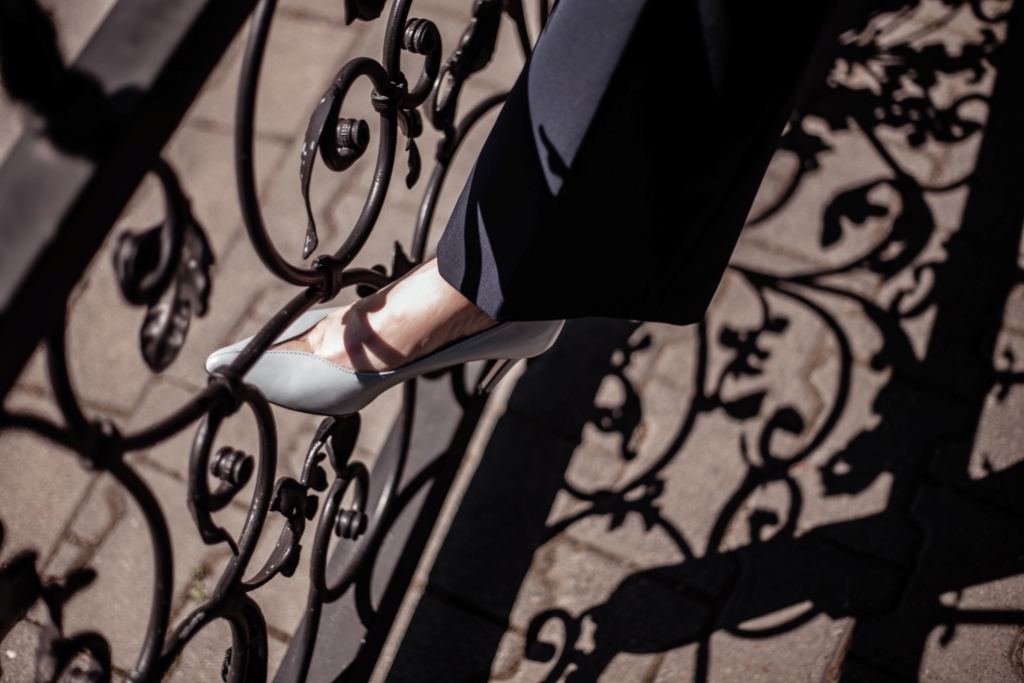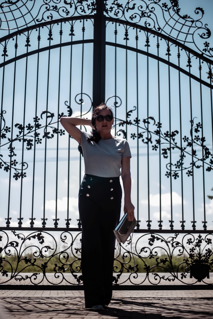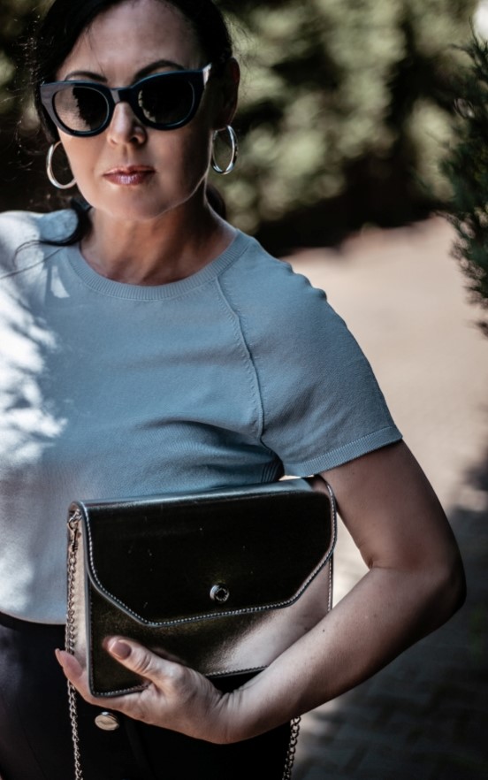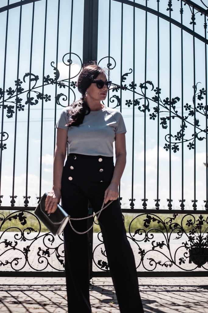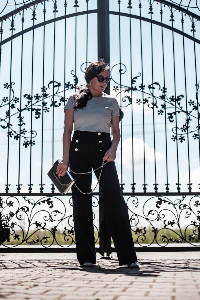 Uwielbiam stylizację w wersji ,,total look”. Jeśli nie potrafimy stworzyć takiego zestawu, to najlepiej zdecydować się na kombinezon, sama mam ich kilka. Dziś jednak postanowiłam wykorzystać w stylizacji różne odcienie koloru niebieskiego i różne faktury materiałów. Spodnie, które wybrałam to granatowe dzwony. Ich wysoki stan jest podkreślony dwoma rzędami srebrnych guzików, to właśnie przez nie zdecydowałam się na srebrną torebkę. Przy moim niskim wzroście zawsze przydaje się dodatkowe wydłużenie nogi. Skórzane czółenka z eleganckim wykrojem V z przezroczystą wstawką z pleksi, wysmukliły nogę. Na górę włożyłam dzianinową, błękitną bluzkę z krótkim rękawkiem, którą włożyłam w spodnie. Dodatki to srebrne kolczyki w kształcie kół i okulary przeciwsłoneczne w granatowej oprawie.