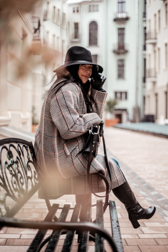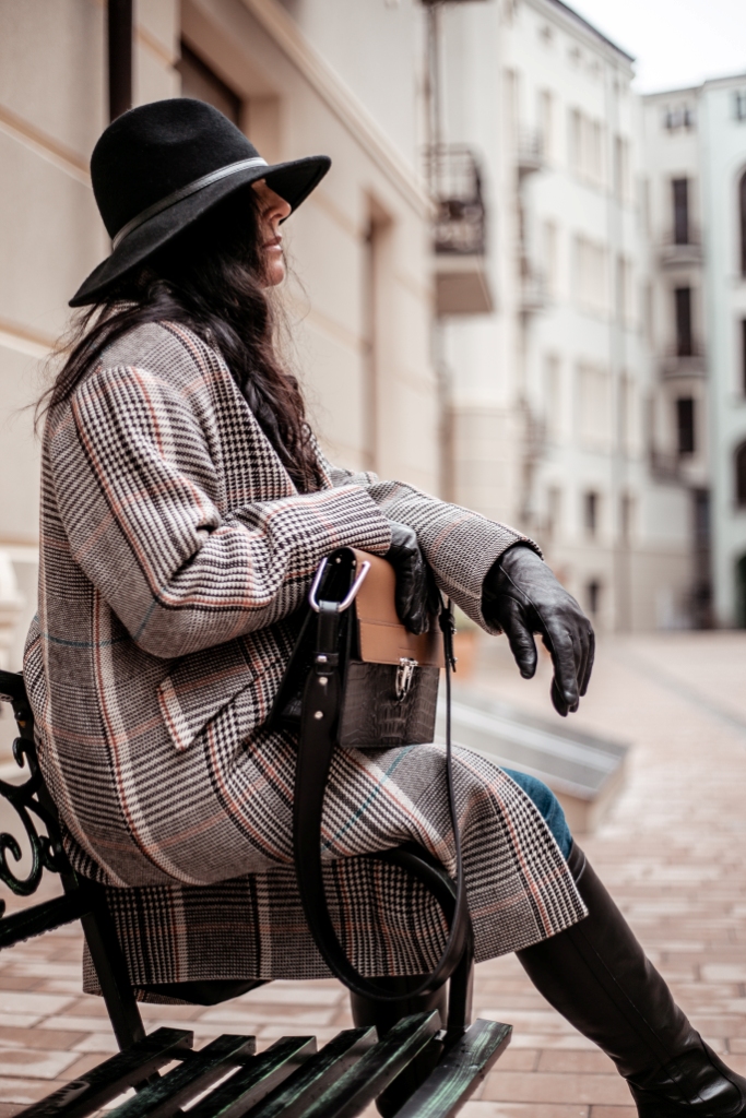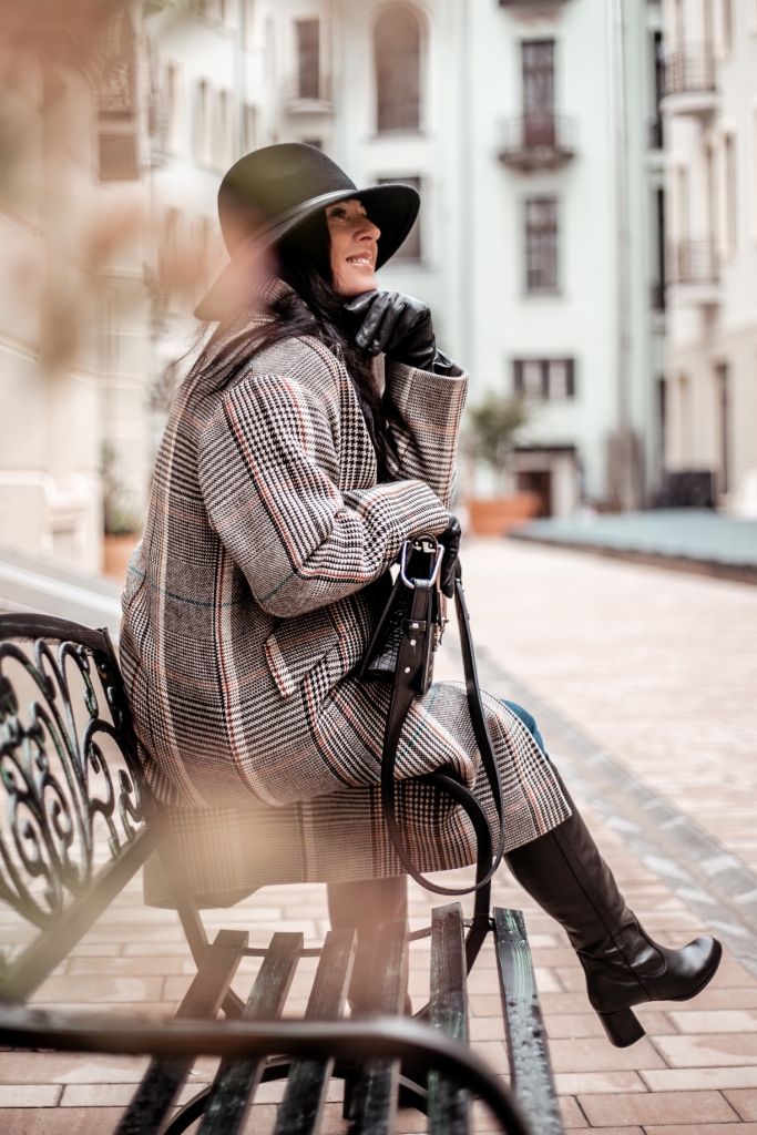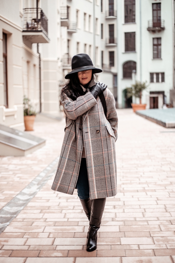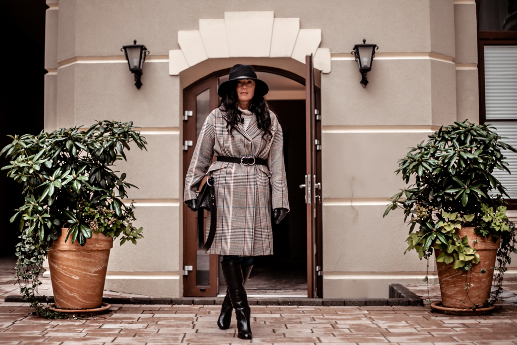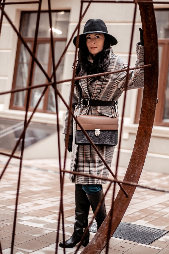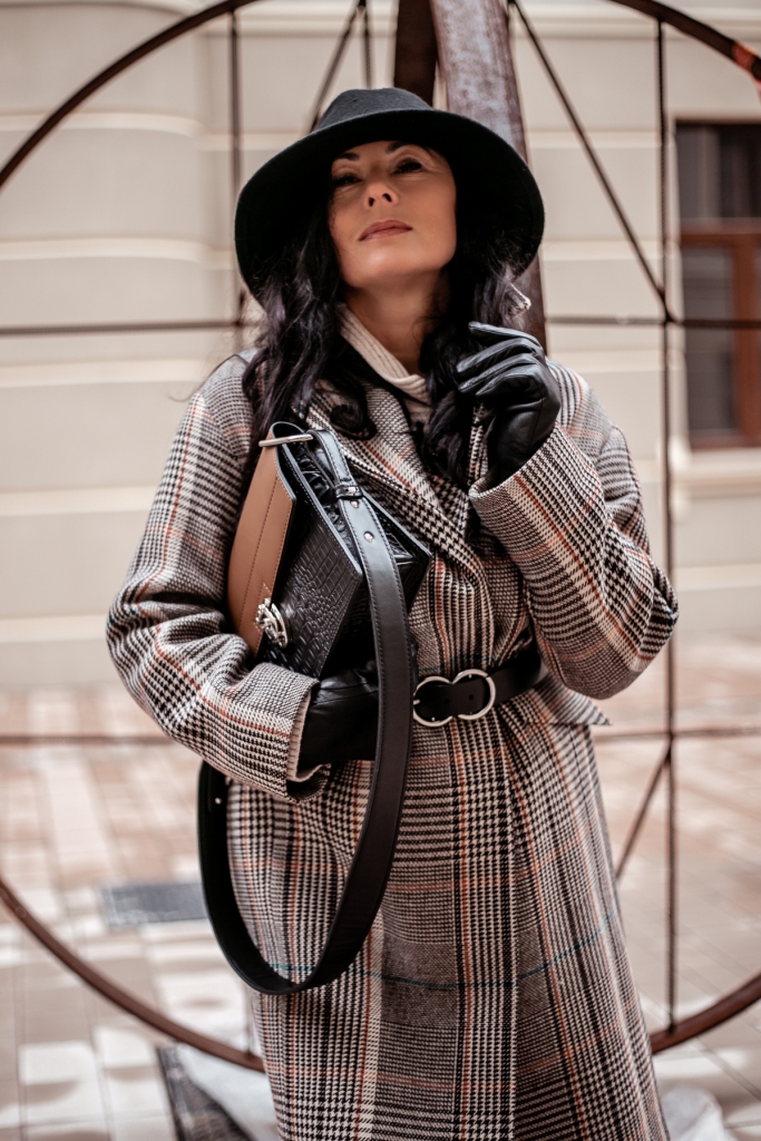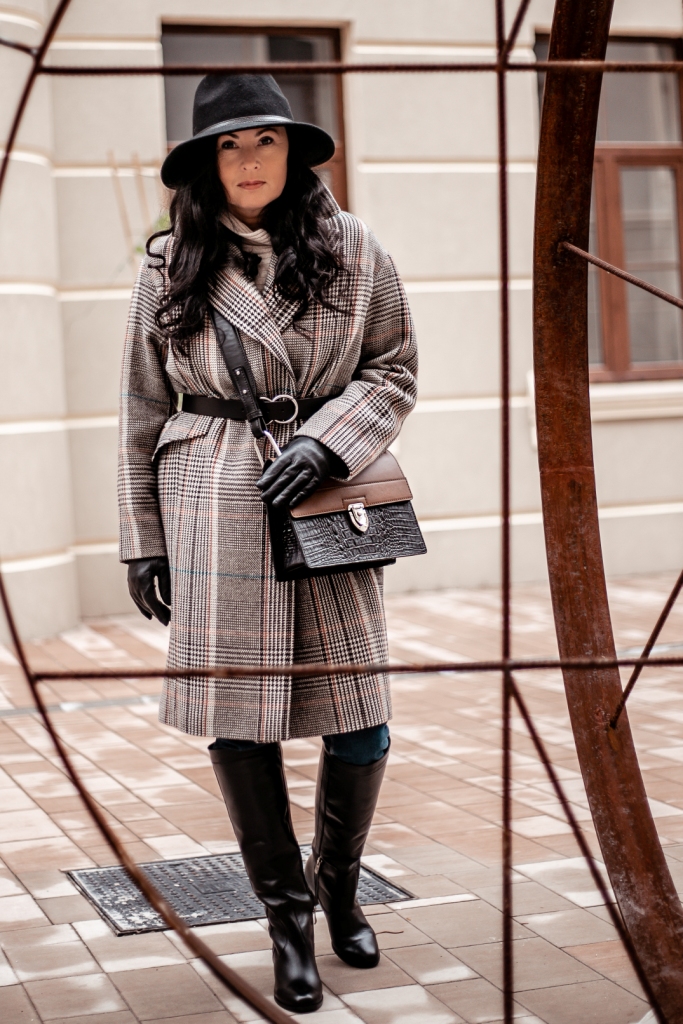 Widok kraty w kolekcjach jesiennych już nikogo nie dziwi, a może jednak? Z kratą jest jak z kolorami, każda z nas ma swoją ulubioną. W tym sezonie możemy ją nosić od stóp do głów. Dziś pokażę wam płaszcz o poszerzonych ramionach. Na wybiegach można zauważyć duże, kraciaste marynarki spięte w talii paskiem. Ja wykorzystałam pasek przy płaszczu. Włożyłam pod niego sweter i jeansy w kolorach, które można odnaleźć w kracie. W dodatkach postawiłam na czerń. Kozaki o ponadczasowym fasonie, kapelusz, rękawiczki i wspomniany pasek. Czarno – brązowa torba ze srebrnym zamkiem pięknie uzupełnia całą stylizację.