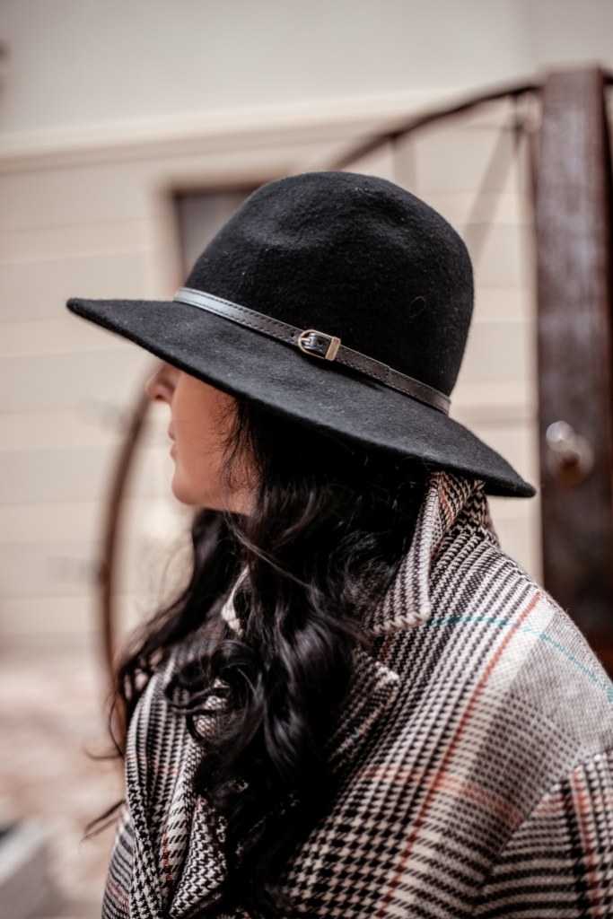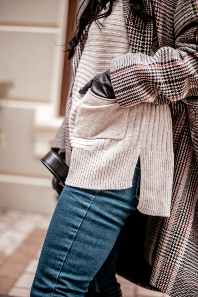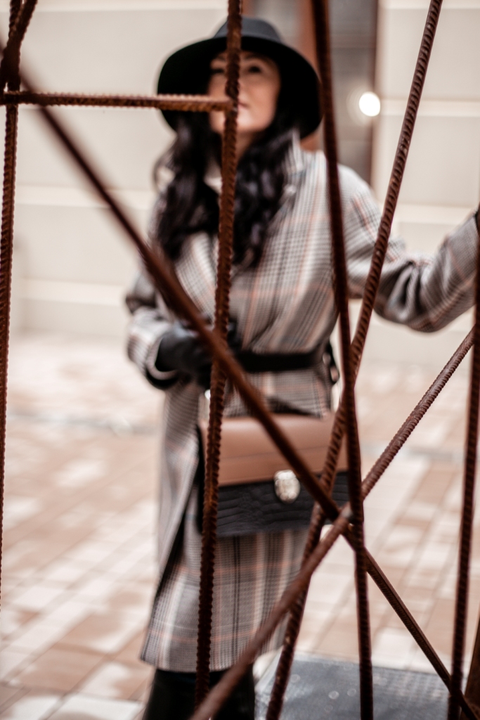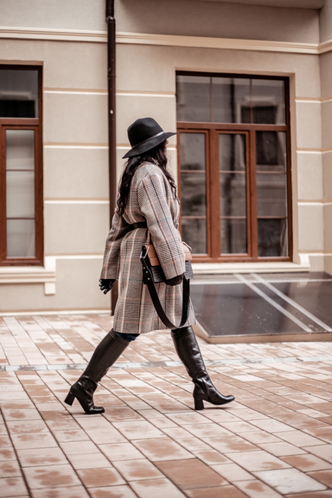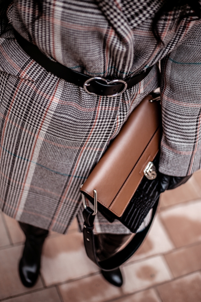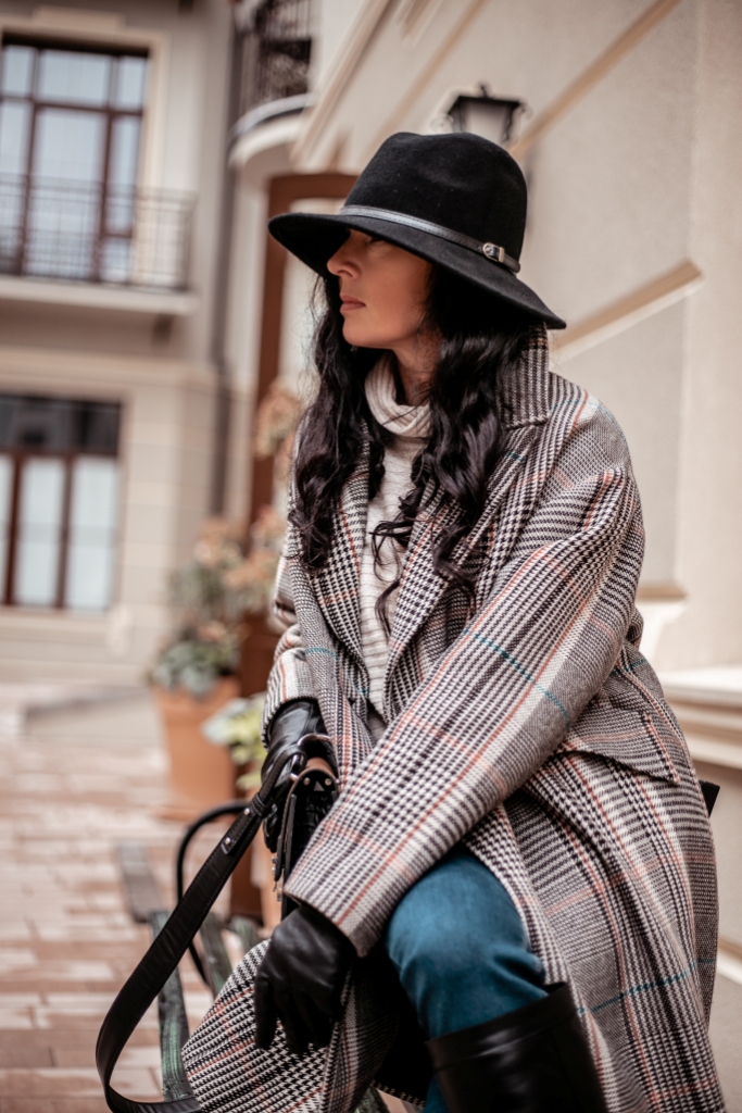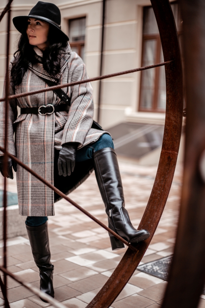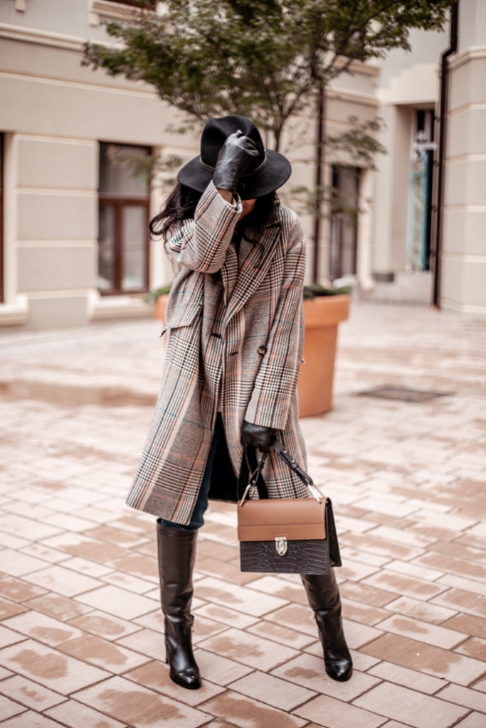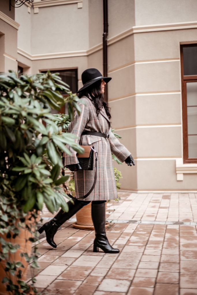 Widok kraty w kolekcjach jesiennych już nikogo nie dziwi, a może jednak? Z kratą jest jak z kolorami, każda z nas ma swoją ulubioną. W tym sezonie możemy ją nosić od stóp do głów. Dziś pokażę wam płaszcz o poszerzonych ramionach. Na wybiegach można zauważyć duże, kraciaste marynarki spięte w talii paskiem. Ja wykorzystałam pasek przy płaszczu. Włożyłam pod niego sweter i jeansy w kolorach, które można odnaleźć w kracie. W dodatkach postawiłam na czerń. Kozaki o ponadczasowym fasonie, kapelusz, rękawiczki i wspomniany pasek. Czarno – brązowa torba ze srebrnym zamkiem pięknie uzupełnia całą stylizację.