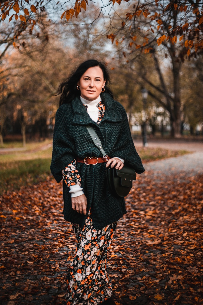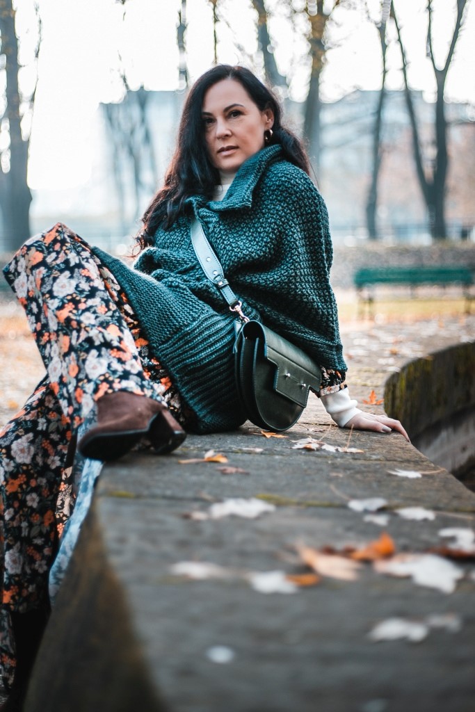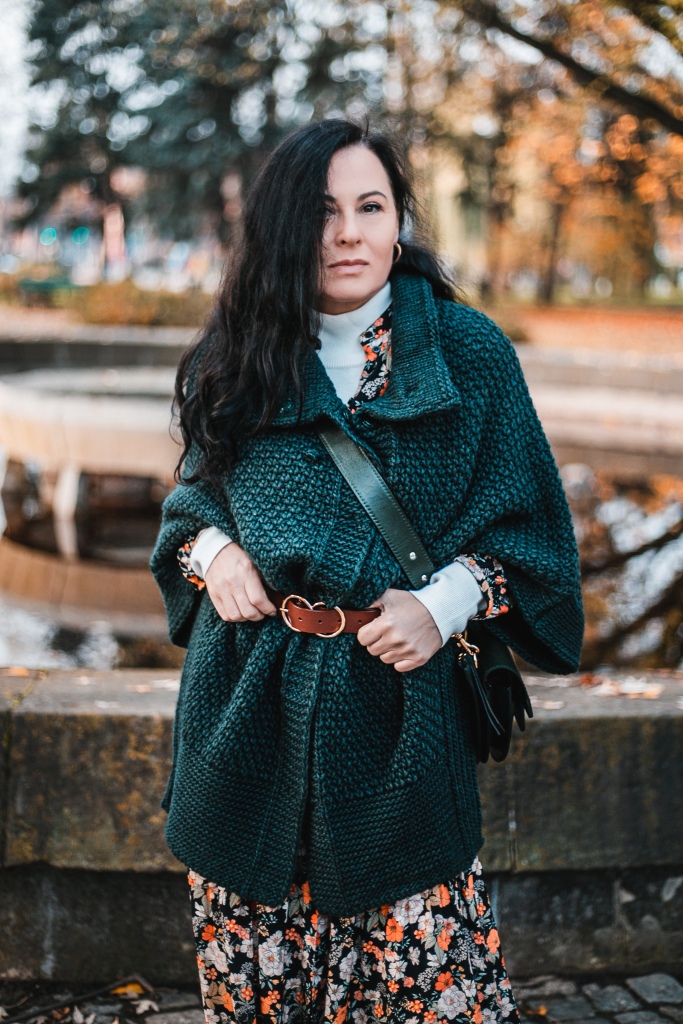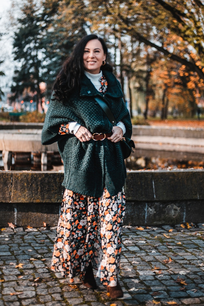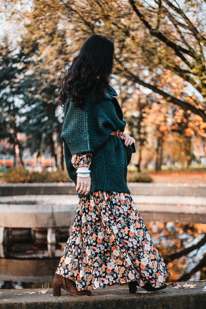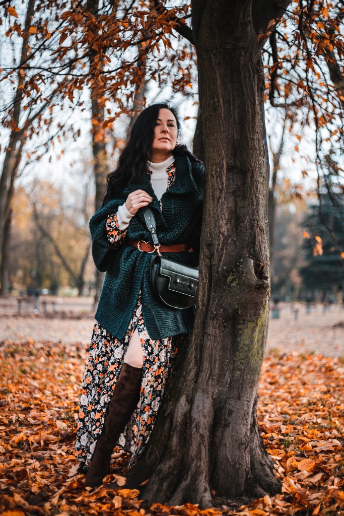 Już wiemy, że kwiaty na wiosnę to nic odkrywczego, a na jesień ? Stylizacja na dziś to rozpinana sukienka maksi w kwiatowy print . Zestawiłam ją z białym golfem ( który włożyłam pod sukienkę ), brązowymi, zamszowymi kozakami i skórzaną listonoszką. Inspiracją był dla mnie stylu lat 70 – tych. Aura dopisała, więc dziś zamiast płaszcza okryłam się obszernym, mięsistym swetrem (lub jak kto woli kamizelką ). Sweter i torbę wybrałam w kolorze butelkowej zieleni, która jest cały czas na topie.