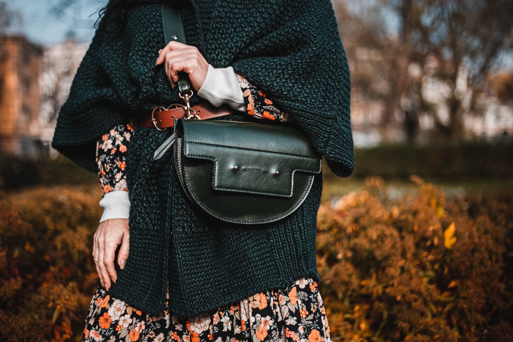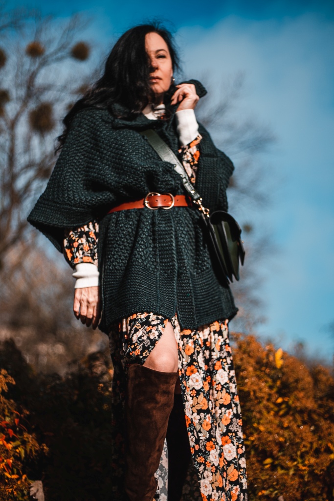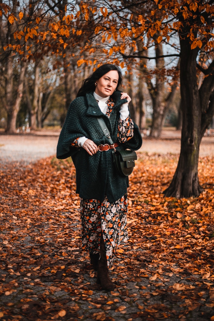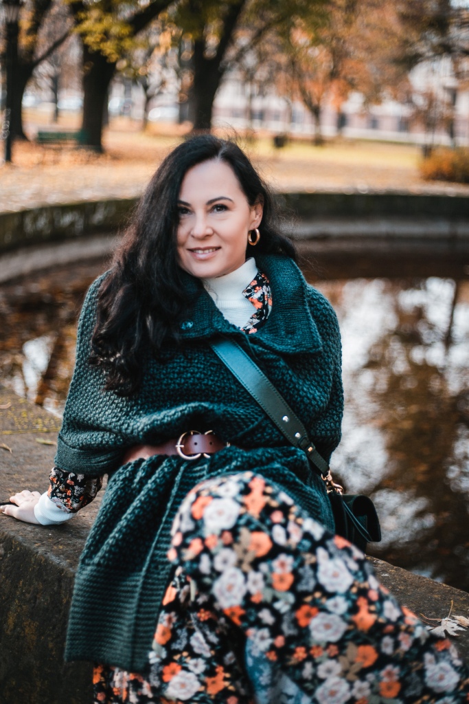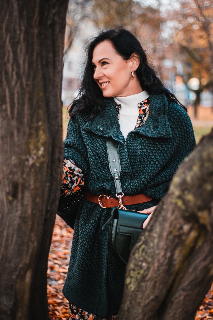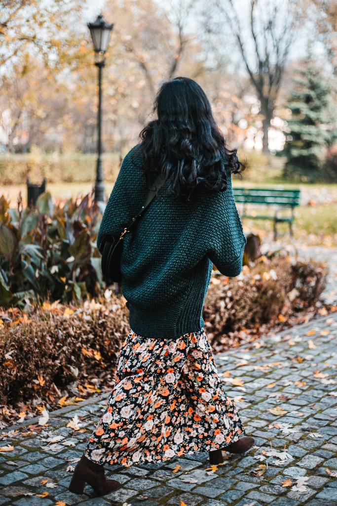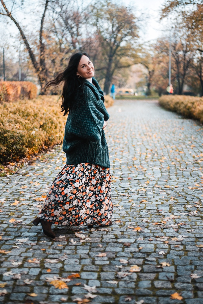Już wiemy, że kwiaty na wiosnę to nic odkrywczego, a na jesień ? Stylizacja na dziś to rozpinana sukienka maksi w kwiatowy print . Zestawiłam ją z białym golfem ( który włożyłam pod sukienkę ), brązowymi, zamszowymi kozakami i skórzaną listonoszką. Inspiracją był dla mnie stylu lat 70 – tych. Aura dopisała, więc dziś zamiast płaszcza okryłam się obszernym, mięsistym swetrem (lub jak kto woli kamizelką ). Sweter i torbę wybrałam w kolorze butelkowej zieleni, która jest cały czas na topie.