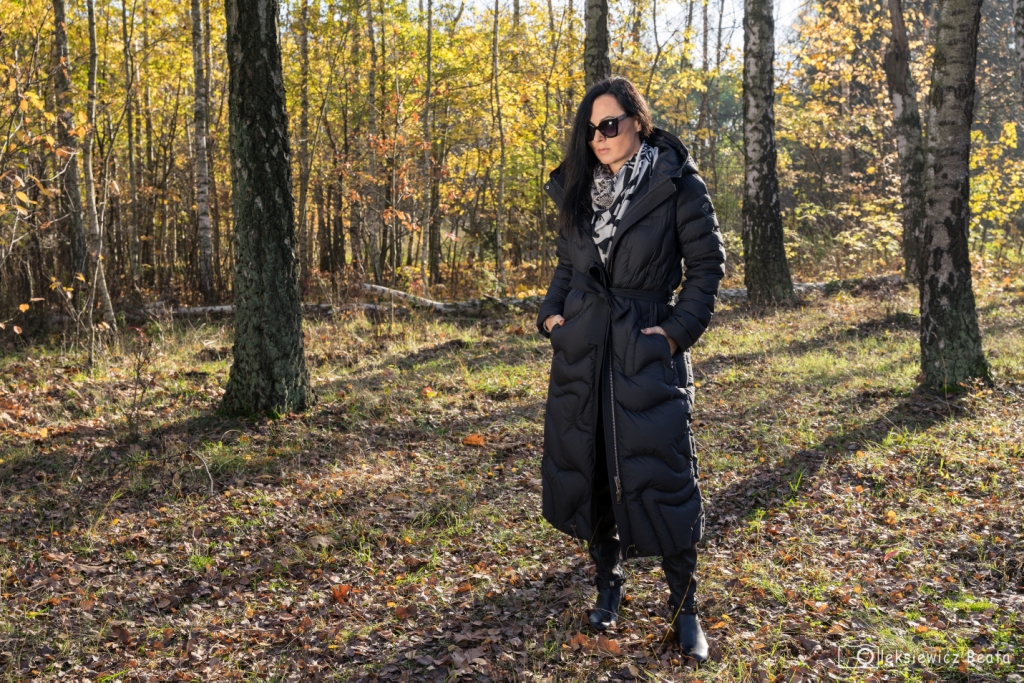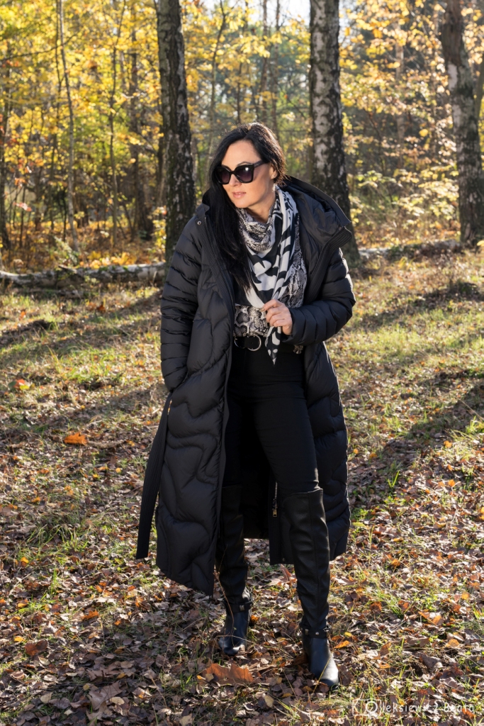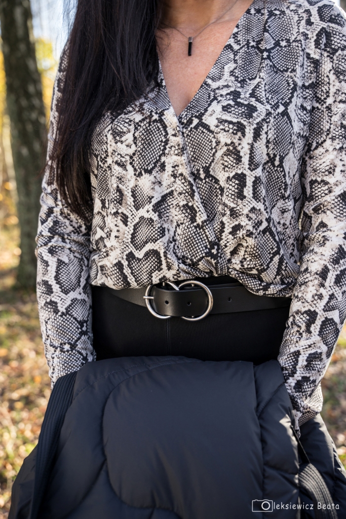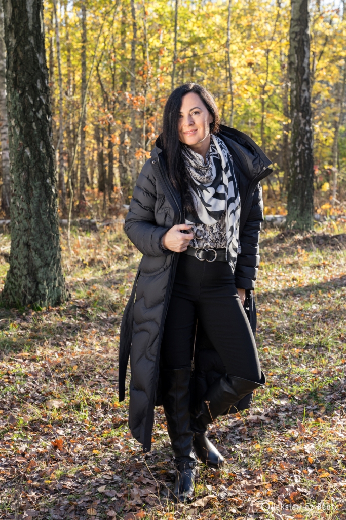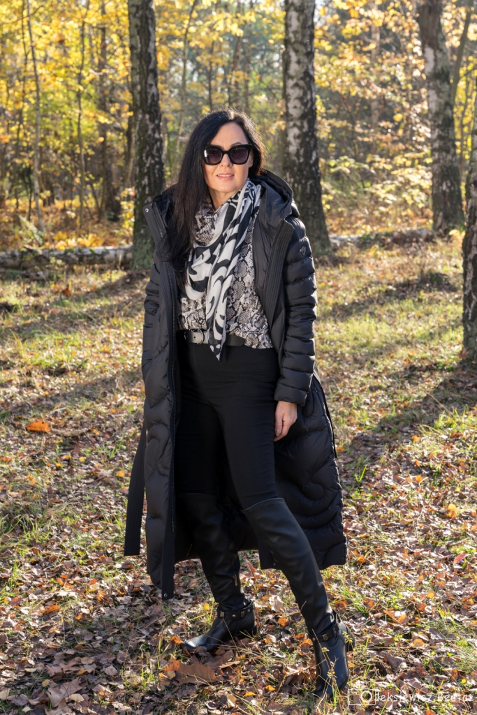 Puchowy płaszcz lub puchowa kurtka obowiązkowo musi się znaleźć w szafie każdej z nas. Gdy mamy już tę idealną puchówkę, czujemy się przygotowane na nadchodzące, chłodne dni. Co powiecie na długi, pikowany, płaszcz z kapturem, który z powodzeniem zastąpi ten, który wkładamy na specjalne okazje, do wieczorowych sukienek ? Dziś, pod taki płaszcz włożyłam kopertową bluzkę w wężowy wzór , do której dobrałam idealną chustę. Stylizacja miała być także wygodna, więc zdecydowałam się na czarne, wąskie spodnie oraz muszkieterki na niskim obcasie z ozdobą wokół kostki. Dodatki to czarny pasek i okulary.