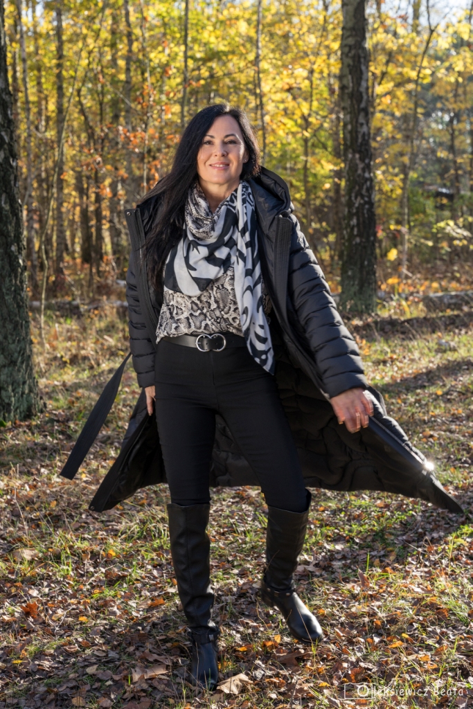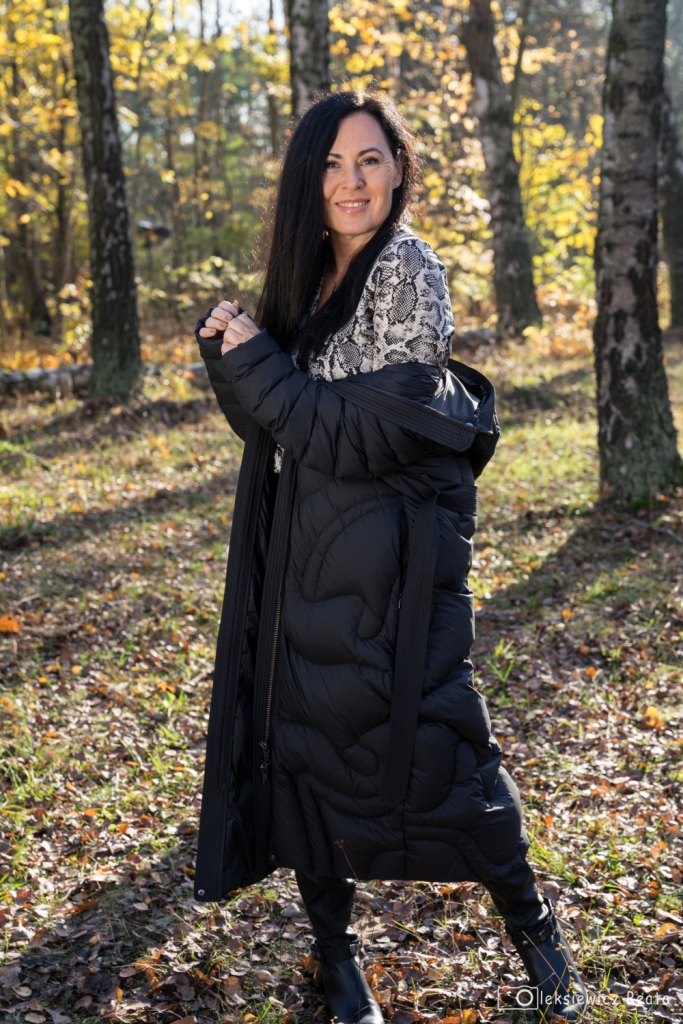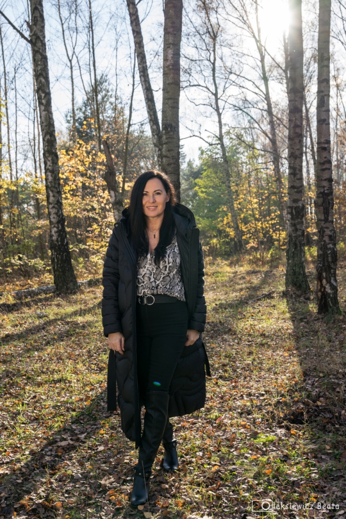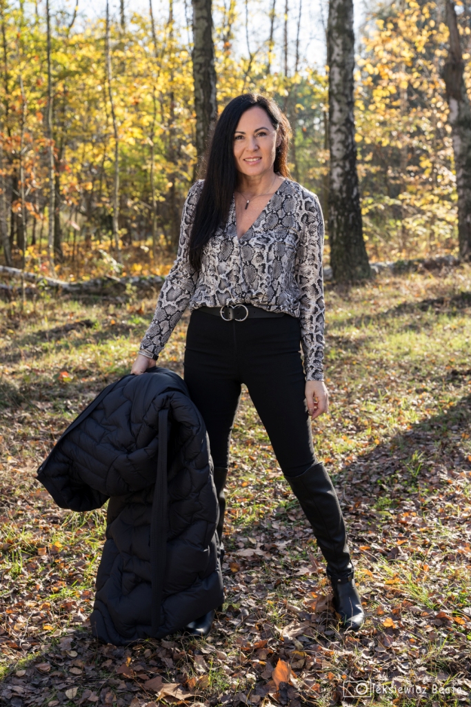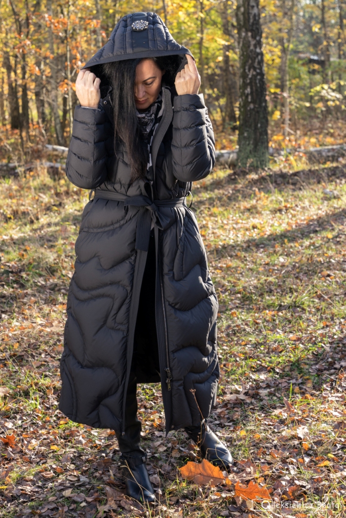 Puchowy płaszcz lub puchowa kurtka obowiązkowo musi się znaleźć w szafie każdej z nas. Gdy mamy już tę idealną puchówkę, czujemy się przygotowane na nadchodzące, chłodne dni. Co powiecie na długi, pikowany, płaszcz z kapturem, który z powodzeniem zastąpi ten, który wkładamy na specjalne okazje, do wieczorowych sukienek ? Dziś, pod taki płaszcz włożyłam kopertową bluzkę w wężowy wzór , do której dobrałam idealną chustę. Stylizacja miała być także wygodna, więc zdecydowałam się na czarne, wąskie spodnie oraz muszkieterki na niskim obcasie z ozdobą wokół kostki. Dodatki to czarny pasek i okulary.