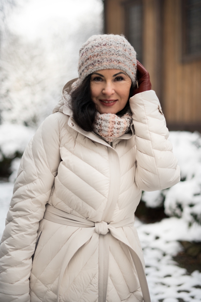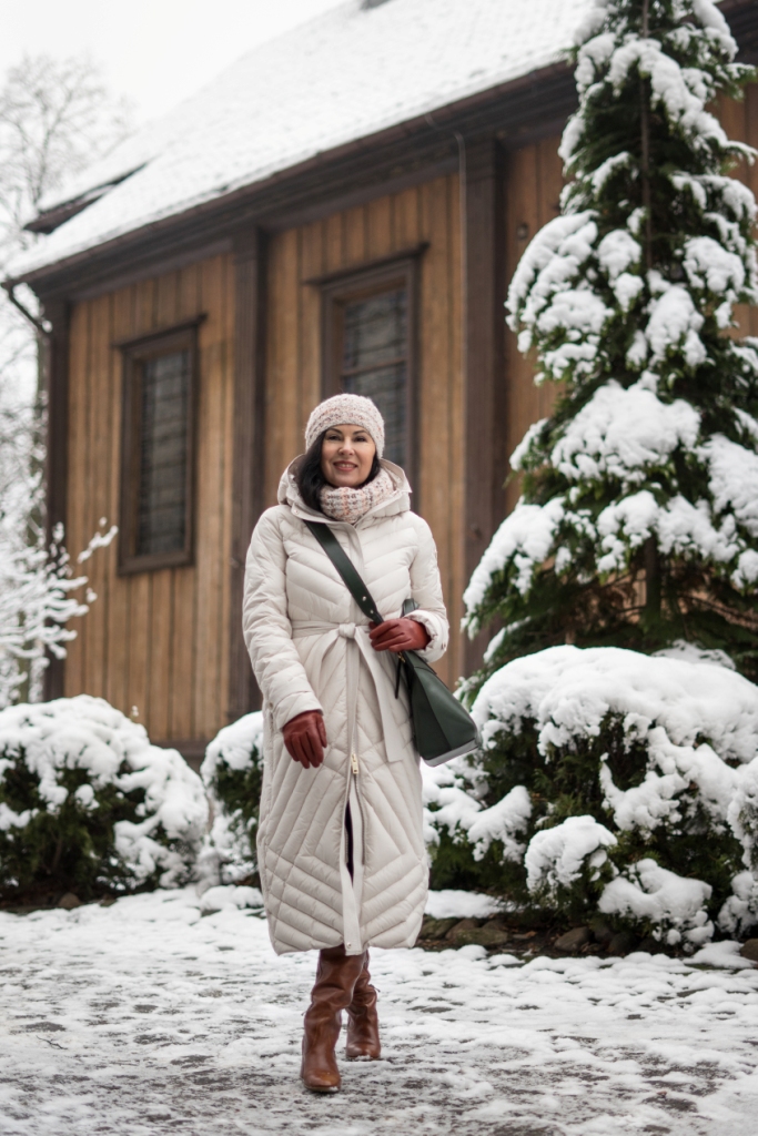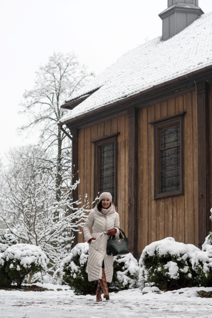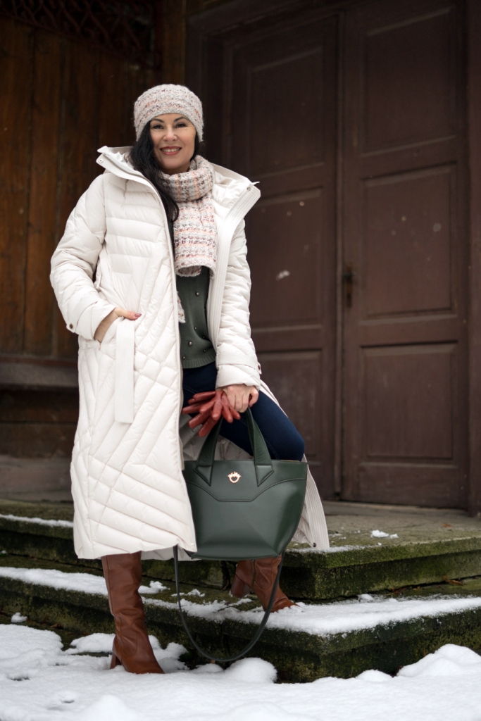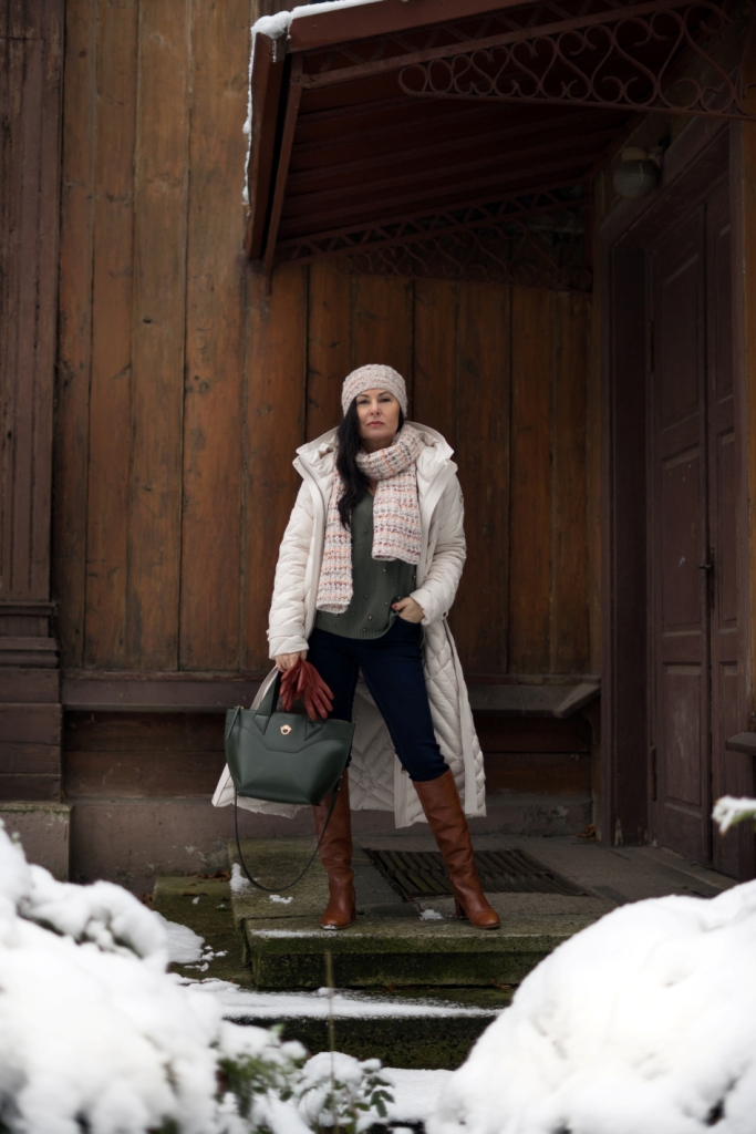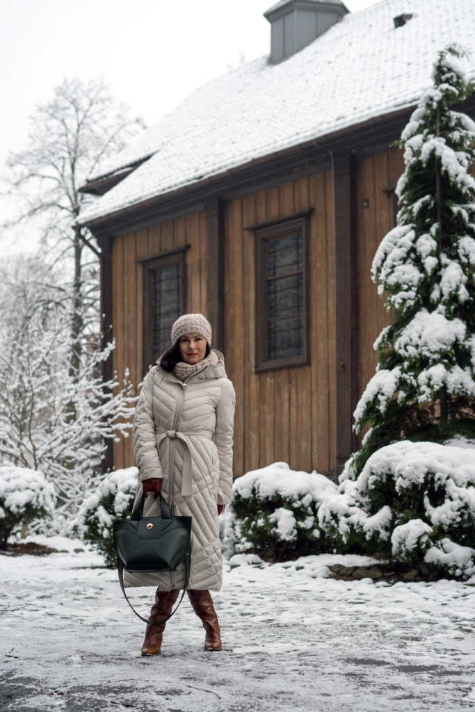 Nareszcie spadł długo wyczekiwany śnieg i puchowe okrycia nie wyglądają już dziwnie. Dziś włożyłam jasny, puchowy płaszcz z kapturem, o długości maxi. Choć zazwyczaj kaptur wystarczająco chroni przed chłodem, to jednak, nie obyło się bez czapki i szala 🙂 Na jasnym płaszczu wyraźniej widać wzór pikowania i jest pięknym tłem dla torby i butów w ciemnych, intensywnych kolorach.