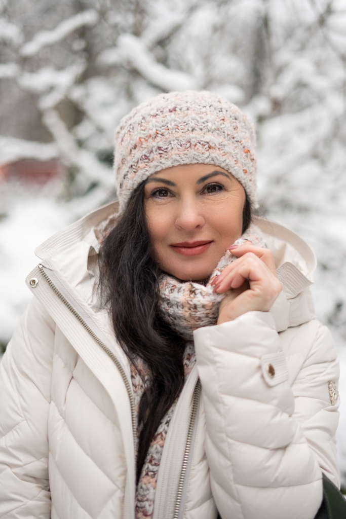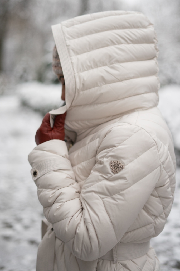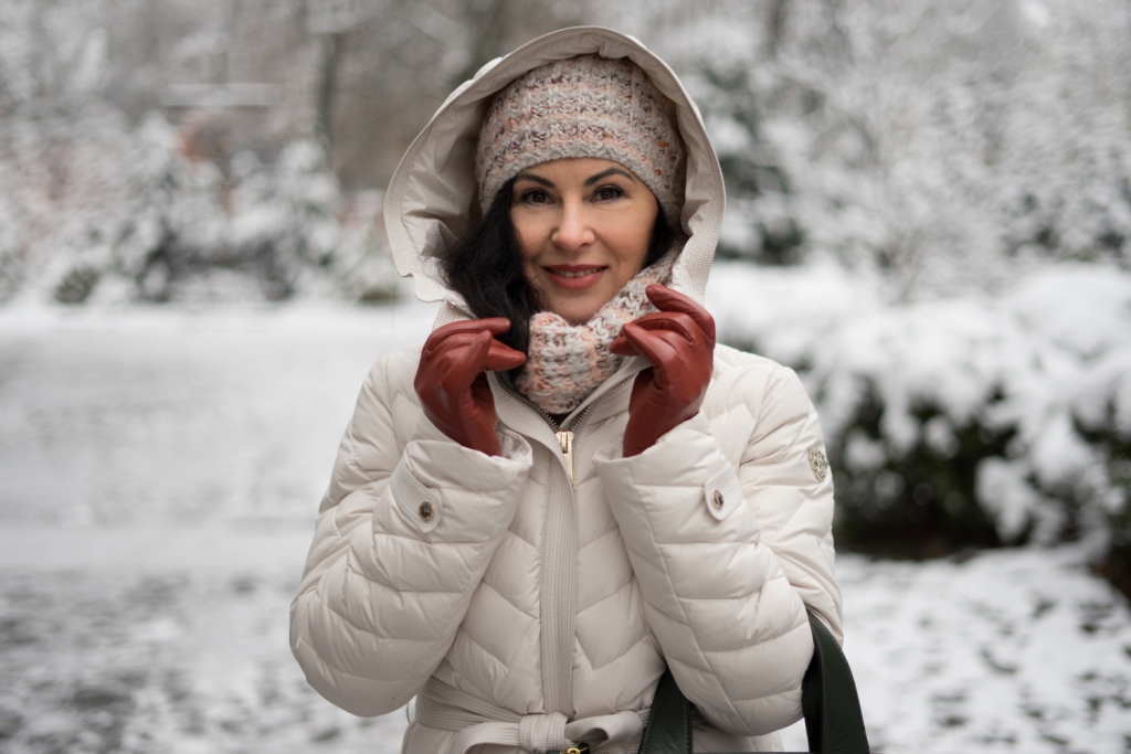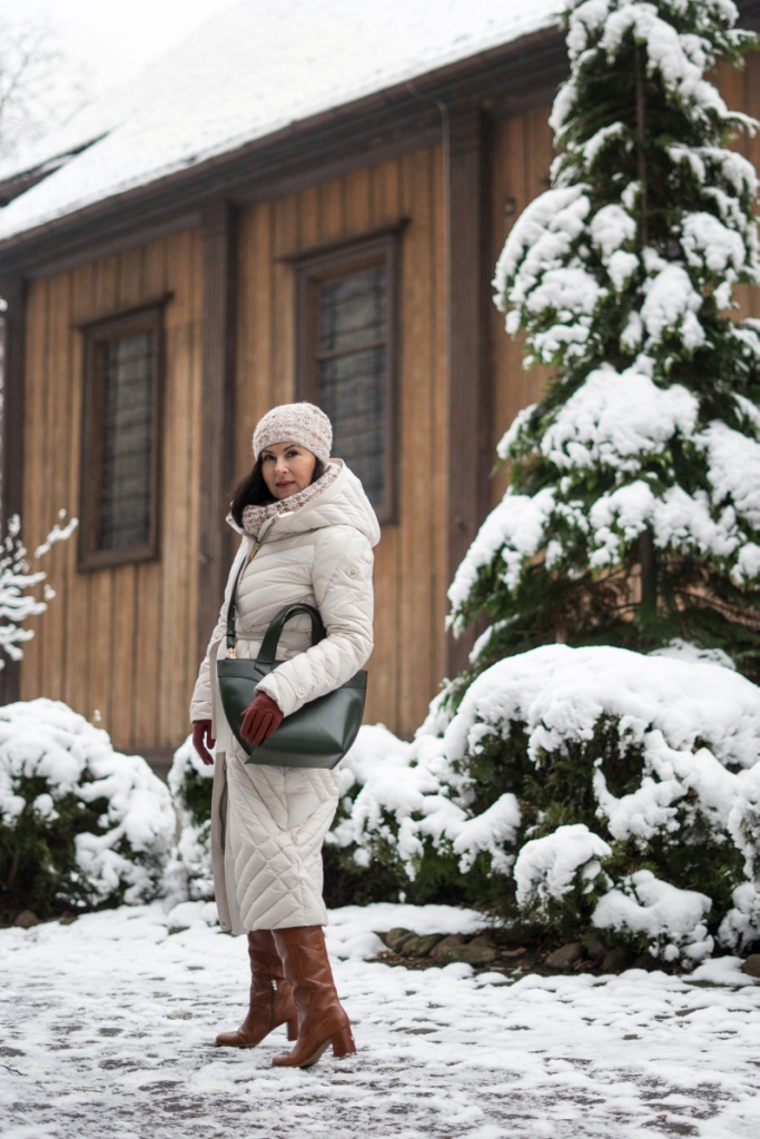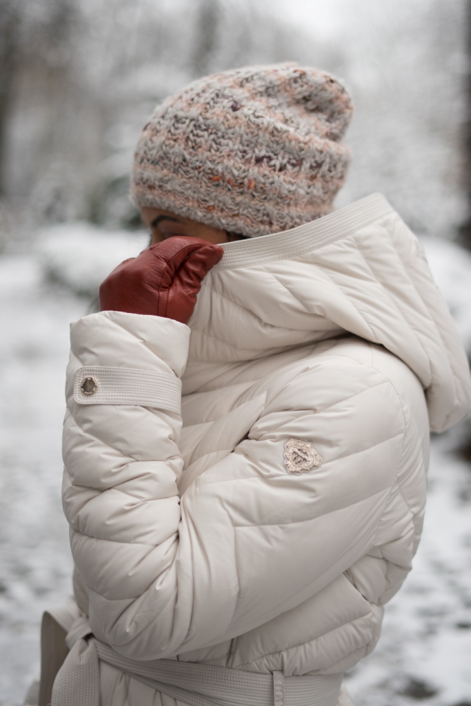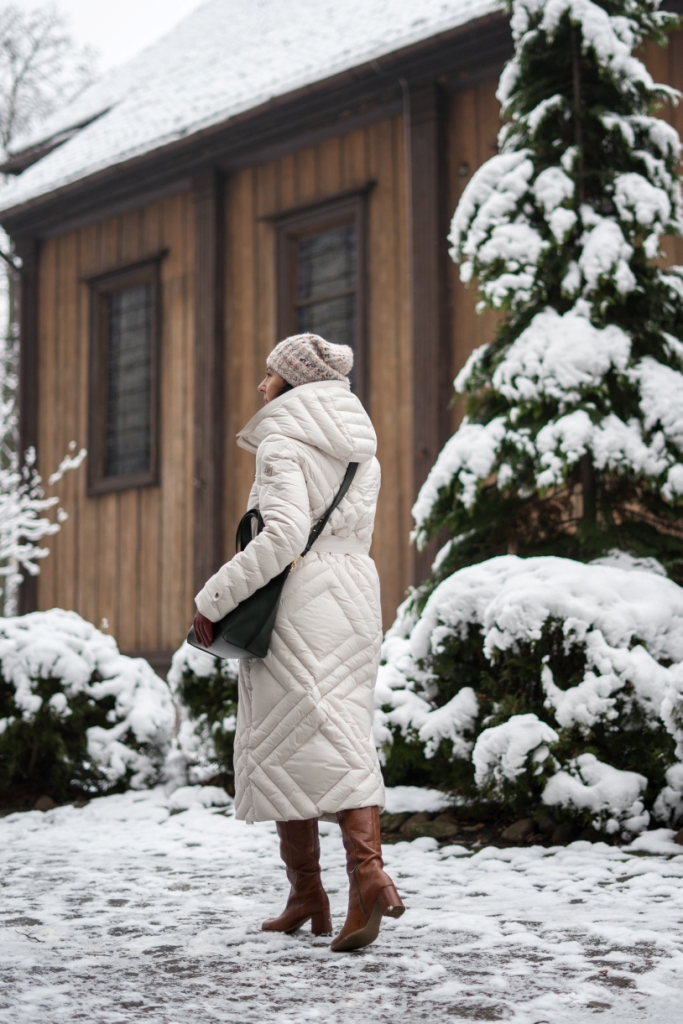 Nareszcie spadł długo wyczekiwany śnieg i puchowe okrycia nie wyglądają już dziwnie. Dziś włożyłam jasny, puchowy płaszcz z kapturem, o długości maxi. Choć zazwyczaj kaptur wystarczająco chroni przed chłodem, to jednak, nie obyło się bez czapki i szala 🙂 Na jasnym płaszczu wyraźniej widać wzór pikowania i jest pięknym tłem dla torby i butów w ciemnych, intensywnych kolorach.