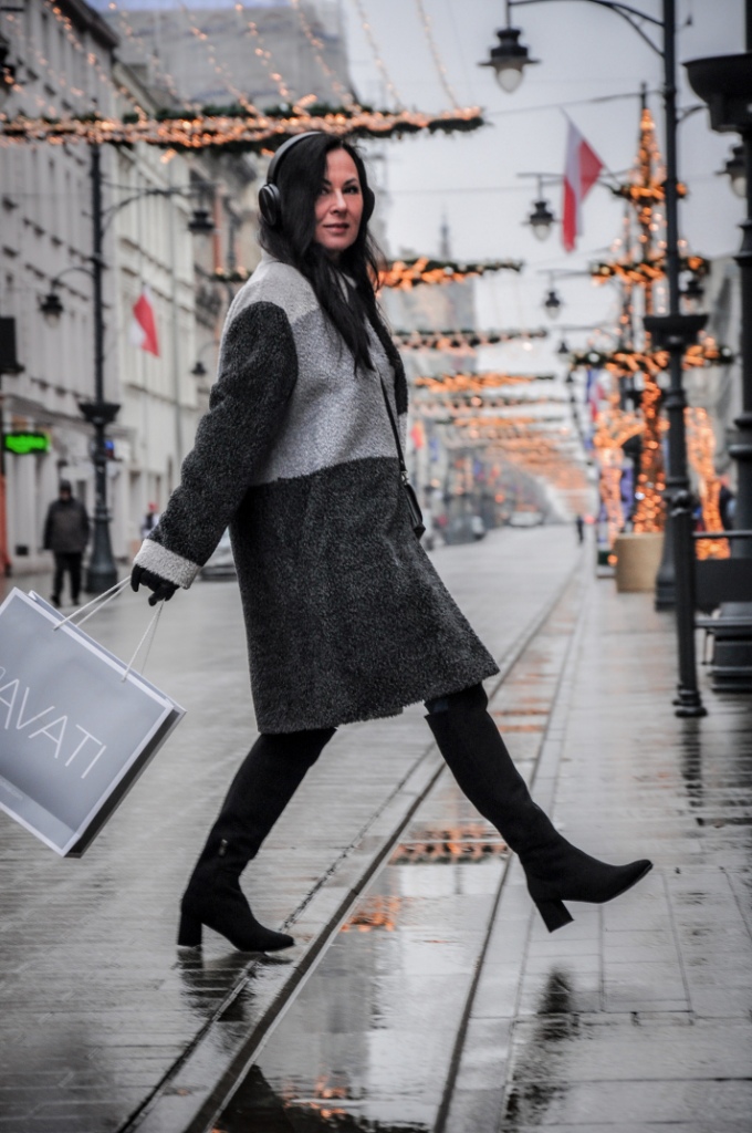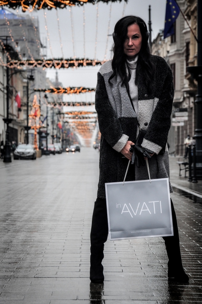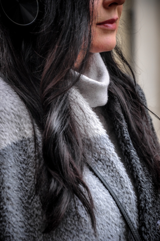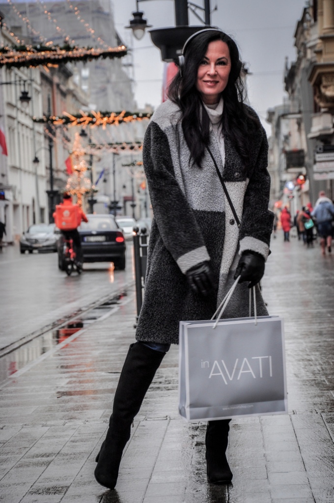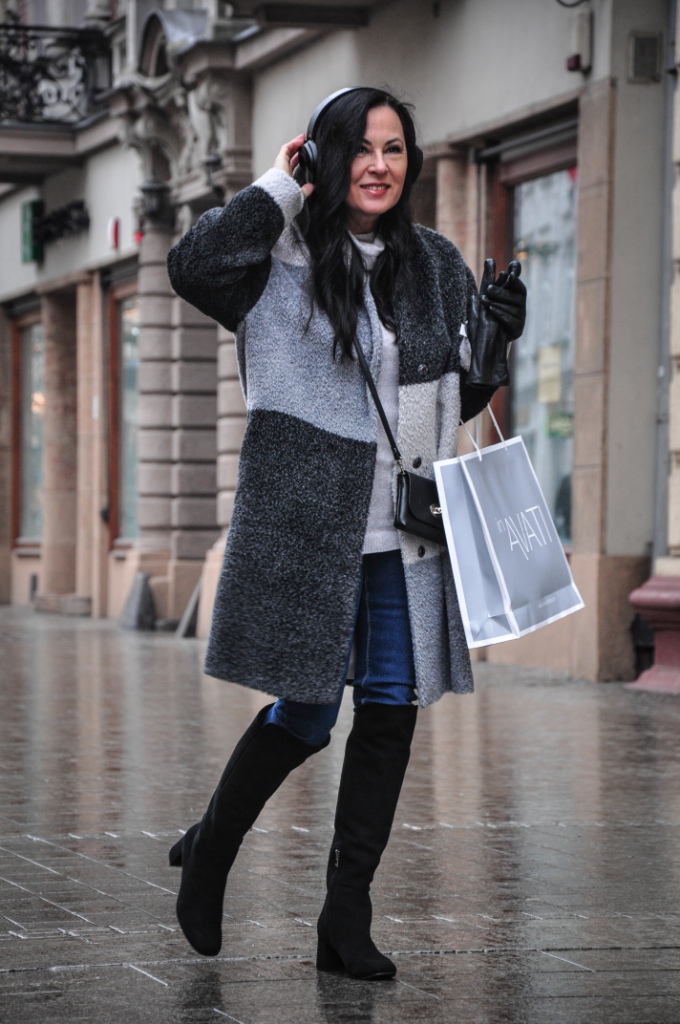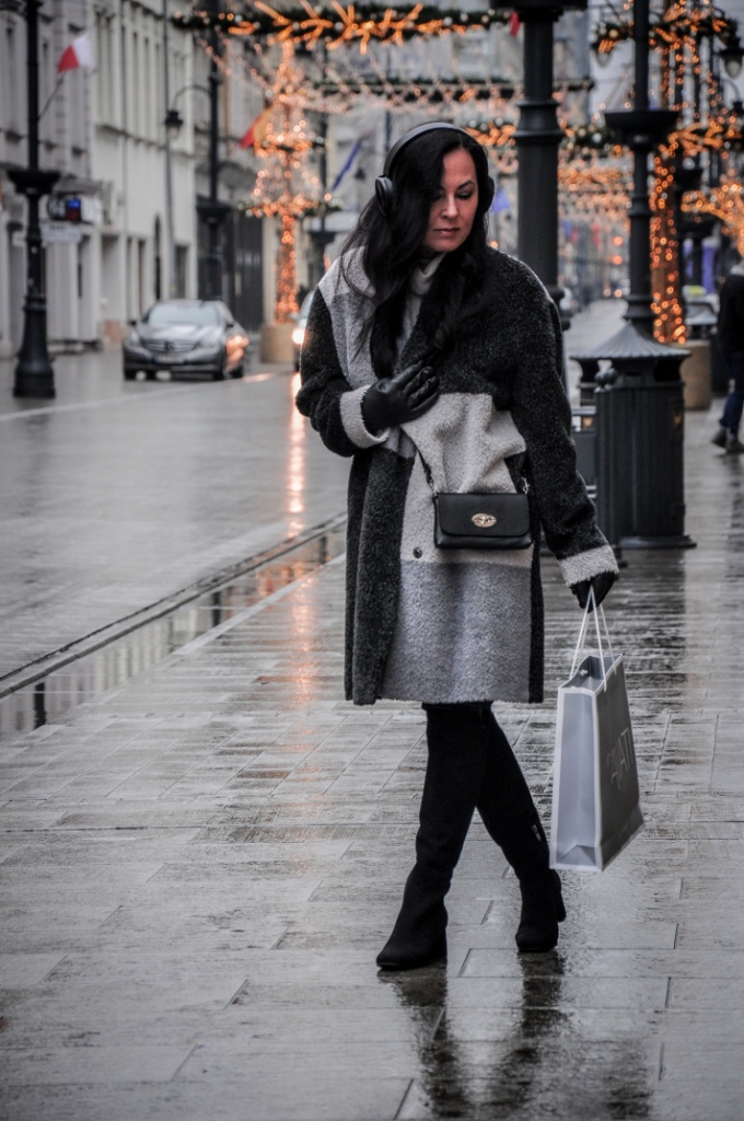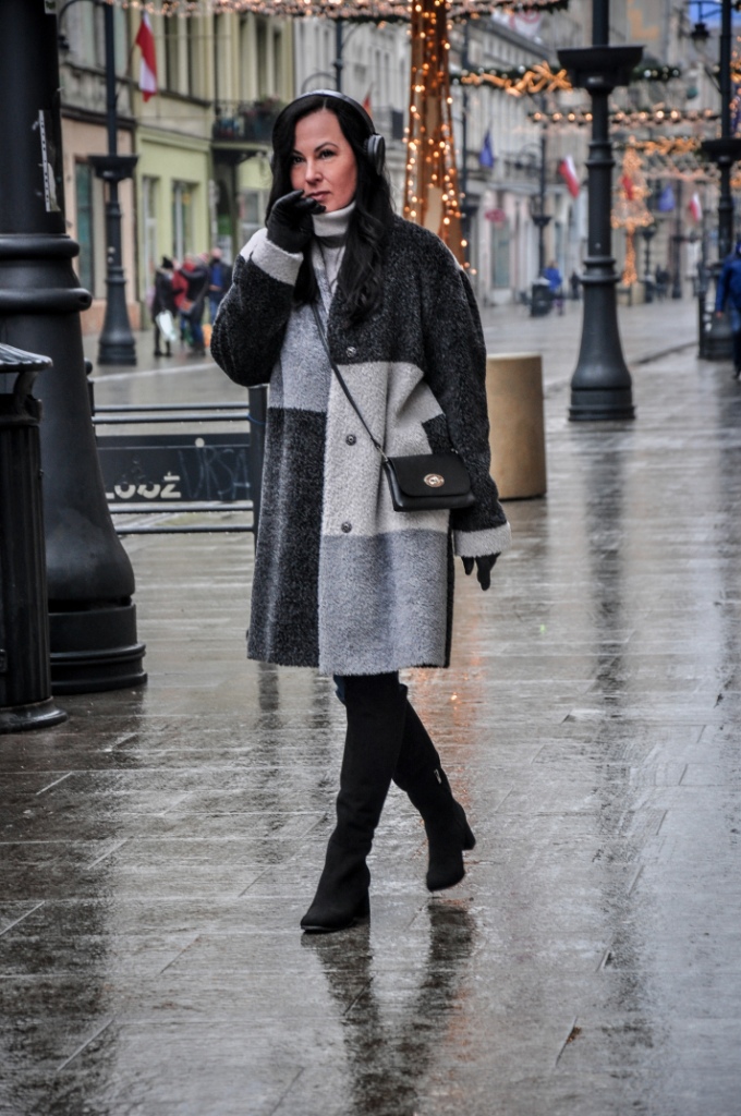 Za co kochamy szary kolor ? Bo to, że kochamy, nie ulega wątpliwości, wystarczy przejrzeć instagram. Bezpiecznie możemy go łączyć z każdym innym kolorem, a kraty w odcieniach szarości są od zawsze przebojem. Mój dzisiejszy look, to płaszcz z alpaki w trzech odcieniach szarości, szary golf i klasyczne jeansy. Dodatki w czerni zawsze wyglądają dobrze. Wybrałam więc czarne, zamszowe muszkieterki, skórzane rękawiczki i małą torebkę na ranię.