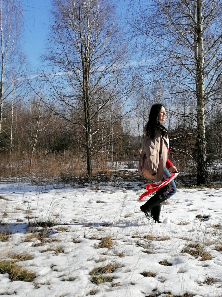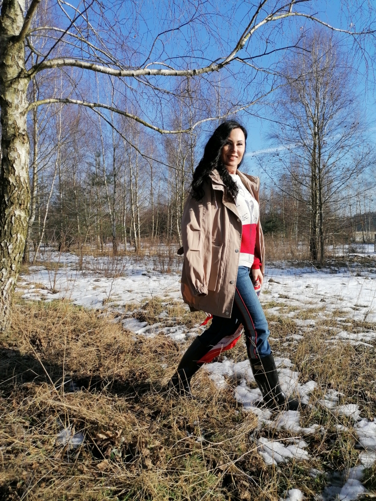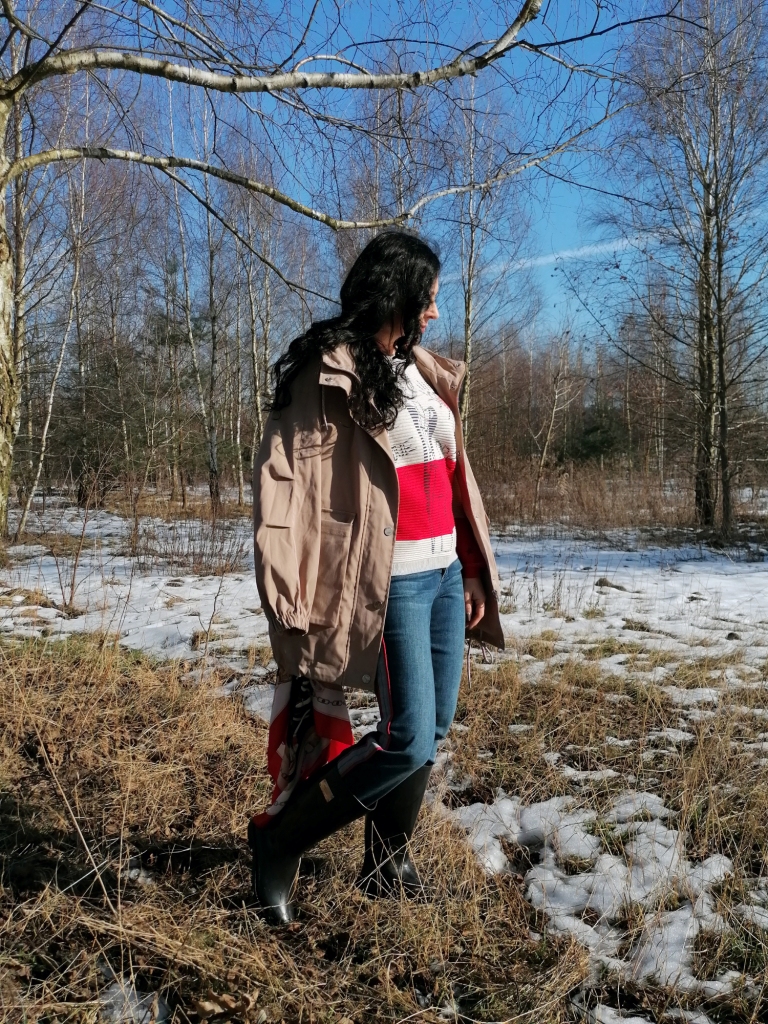 Praktyczna, wodoodporna kurtka znalazła się, na szczycie mojej listy wiosennych zakupów. Bardzo możliwe że serial ,, The Crown” miał z tym coś wspólnego 😉 Ten model wybrałam ze względu na kaptur i duże kieszenie. Dzięki kieszeniom, na spacerze nie martwię się o klucze i telefon. Sweter, jeansy i gawroszkę wybrałam z elementami czerwieni, bo ostatnio brak mi kolorów. Przy przedwiosennej odwilży, jedynym rozsądnym obuwiem są kalosze.