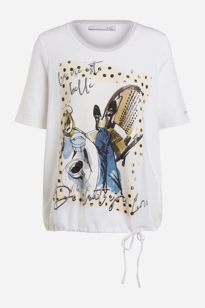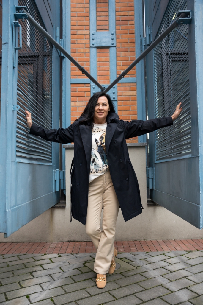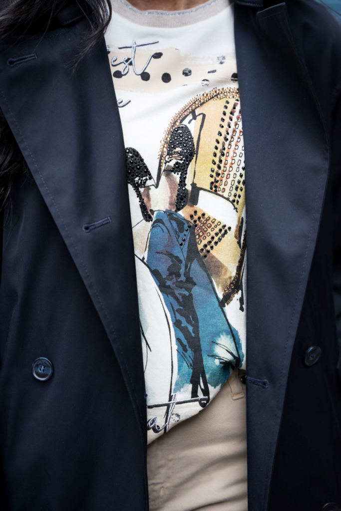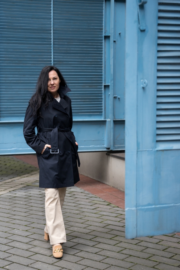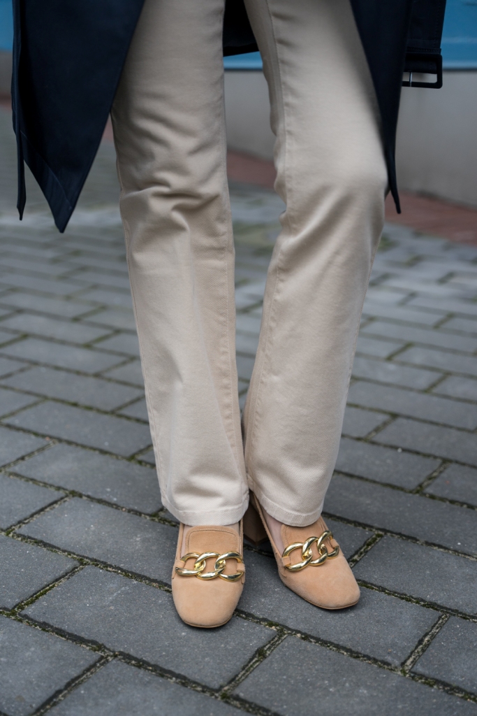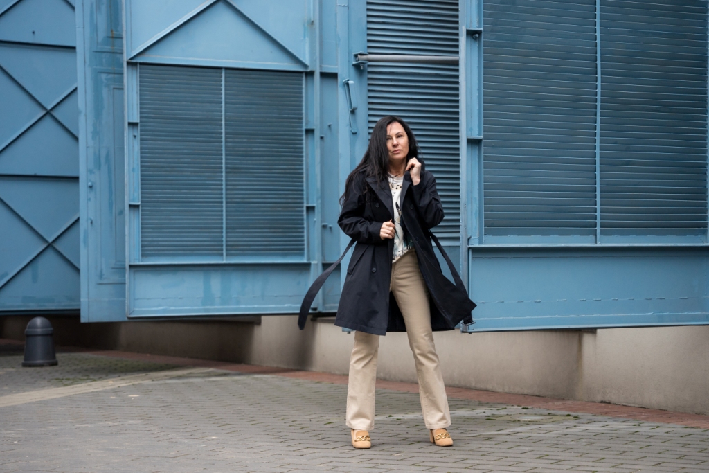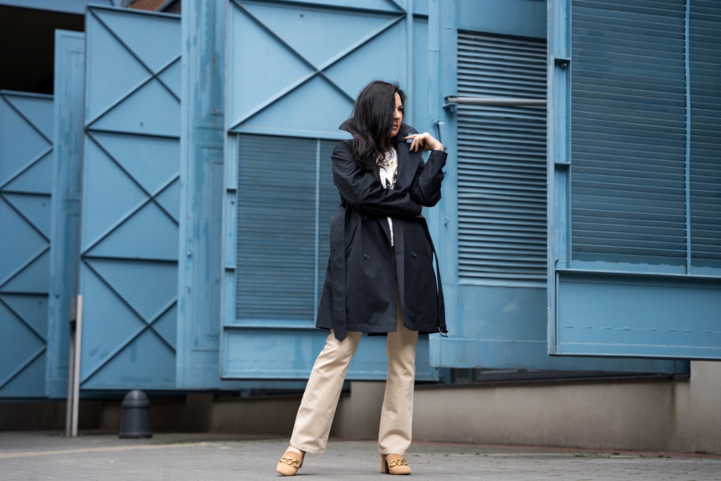 Klasyczny trench zapinany na dwa rzędy guzików z paskiem i dużym kołnierzem, to mój wybór na ten sezon. To model, który nigdy nie wyjdzie z mody i pasuje do każdej stylizacji. By rozjaśnić look i podkreślić piękny, granatowy kolor płaszcza, zestawiłam go z jasnymi chinosami . Ich rozkloszowana nogawka sprawia, że mokasyny zdobione złotym łańcuchem o grubych ogniwach, wyglądają delikatniej. Pod płaszcz włożyłam kolorową bluzkę z napisem ,,La vie est belle „