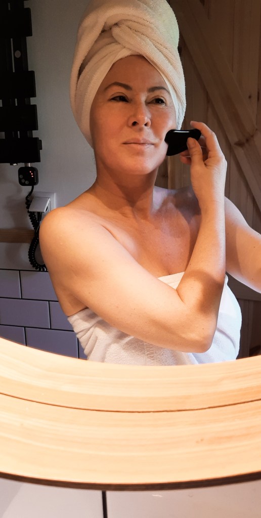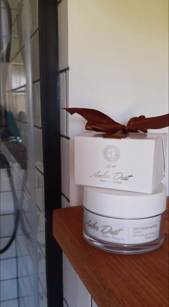 Do kosmetyczki włożyłam poza tym co zwykle, kilka nowych kosmetyków, które kupiłam przed wyjazdem w uroczej drogerii Lawenda . Znalazłam tam produkty, które idealnie sprawdziły się na letnim wypadzie. Za radą Pani Basi z Lawendy wybrałam: Peeling Amber Dust – kosmetyk do intensywnej pielęgnacji, który znakomicie wygładzała  i ujędrnia  skórę. To idealne połączenie masła Amber Dust z substancjami peelingującymi, takimi jak zmikronizowany bursztyn, sól i cukier. Wspaniale oczyszcza i odżywia  i długotrwale nawilża skórę ciała. Do tego dobrałam mydełka Amber Dust z drobinkami bursztynu, które kształtem same przypominają bursztyn. Te skarby mają piękne opakowanie. W kosmetyczce znalazł się także kamień Gua Sha do masażu twarzy. Wygładza on zmarszczki, ujędrnia kontur twarzy, rozjaśnia cerę i detoksykuje. Wybrałam Obsydian Czarny, który pomaga odbudować pewność siebie i chroni przed spadkiem energetycznym. Zrezygnowałam z balsamu do ciała na rzecz olejków. Na wyjazd wybrałam olejek o zapachu wiśni i słodkich migdałów. Cudownie pobudza zmysły i zapewnia nawilżenie na cały dzień. Prawdziwym hitem jest balsam w sztyfcie, to produkt na wszelkie suchości. Uratuje spierzchnięte dłonie, suche stopy oraz złagodzi spustoszenia dokonane podczas uprawiania sportów wodnych. Natychmiastowo przynosi ulgę suchej i podrażnionej skórze, odżywiając ją i poprawiając poziom nawilżenia.