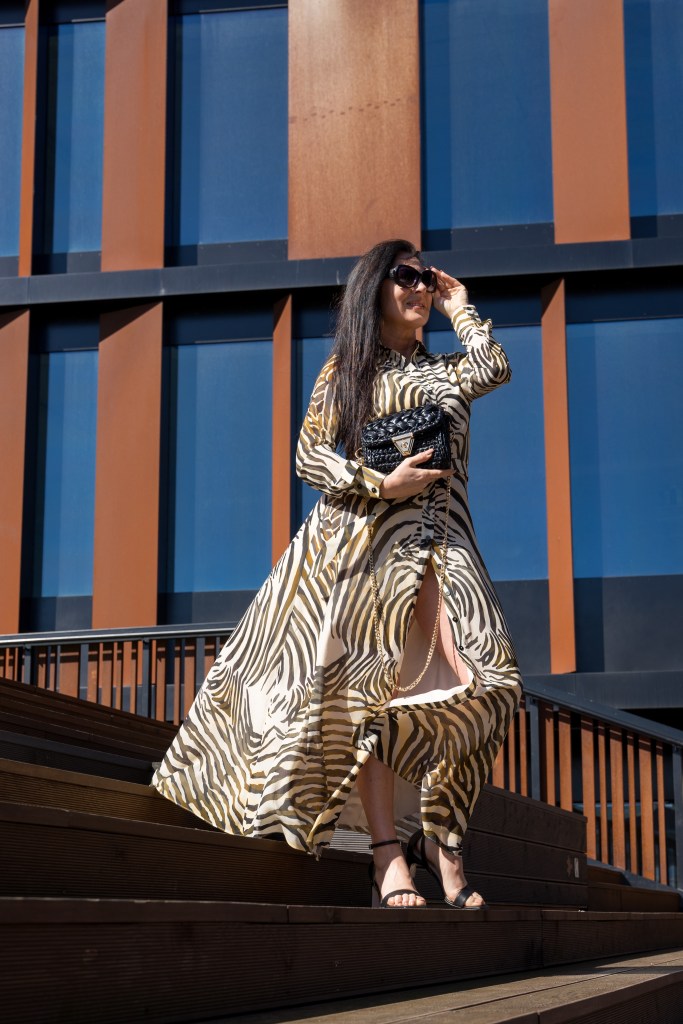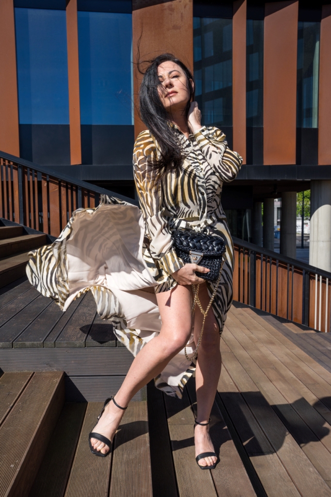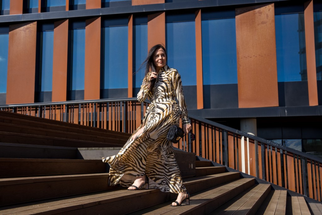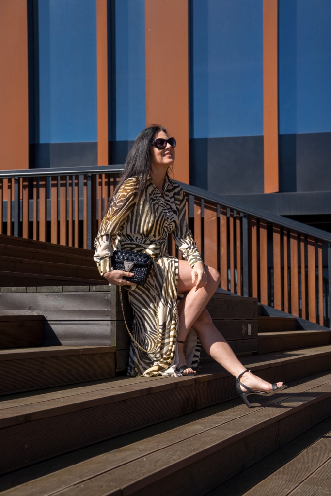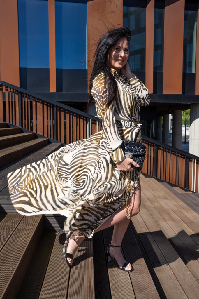 Sukienki w zwierzęcy wzór nigdy nie wyjdą z mody, może więc warto mieć choć jedną w swojej garderobie. Ja w poszukiwaniu tej idealnej dla siebie, trafiłam na model, który będę nosić całe lato z sneakersami. Myślę, że jesienią także, bo z kozakami będzie wyglądać zabójczo. Do tej długiej, zwiewnej sukni w wzór zebry dobrałam czarne sandały Aura marki Hammer ze skóry licowej z ozdobnym łańcuszkiem przy zapięciu. Torebkę wybrałam również czarną, jednak taką, której nie zdominuje mocny print sukienki. Kakadu Metalik to torebka wykonana ręcznie. Jej gruby splot, połysk i metalowe, złote wykończenia sprawiają że nie można od niej oderwać wzroku. Dodatki to ciemne okulary i naszyjnik w kształcie łańcucha, którego ogniwa to połączenie metalu ze skórą.