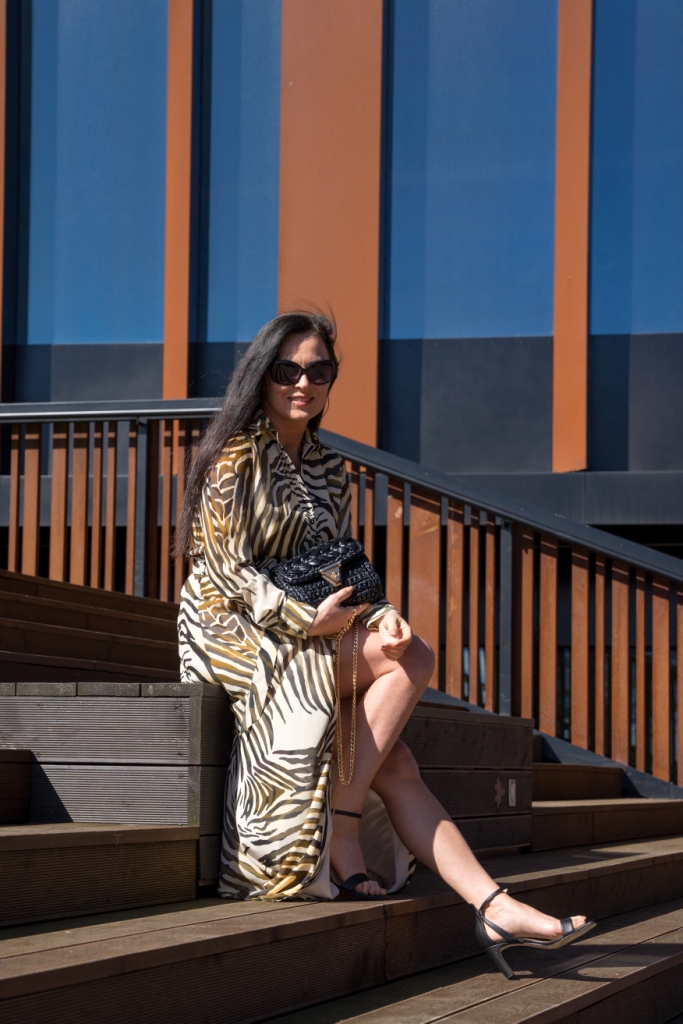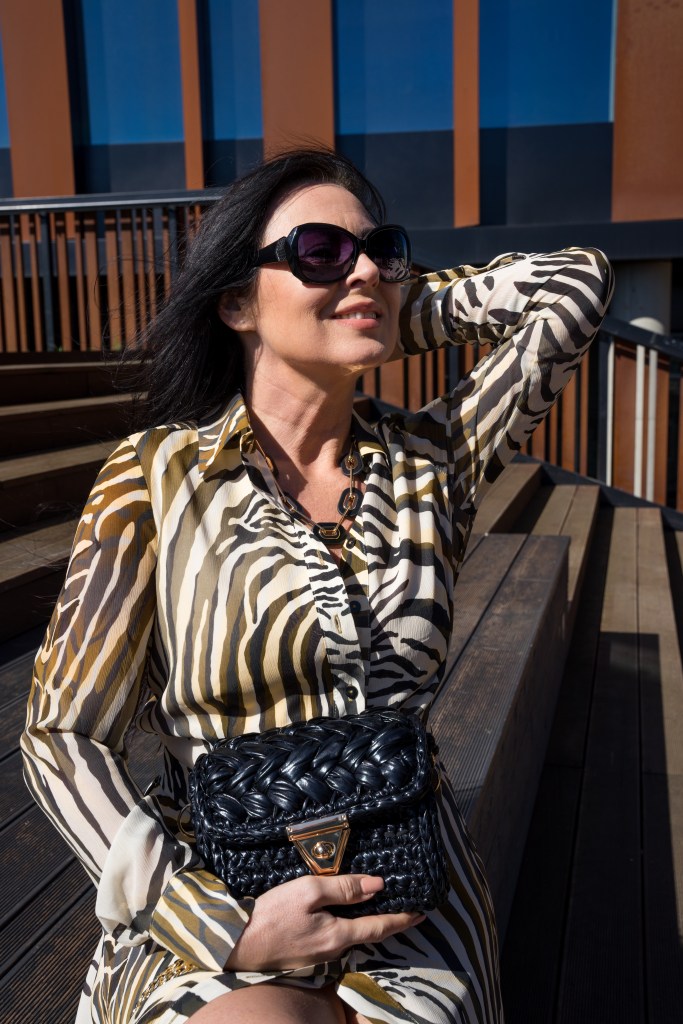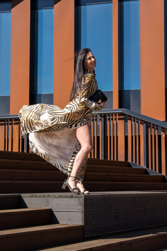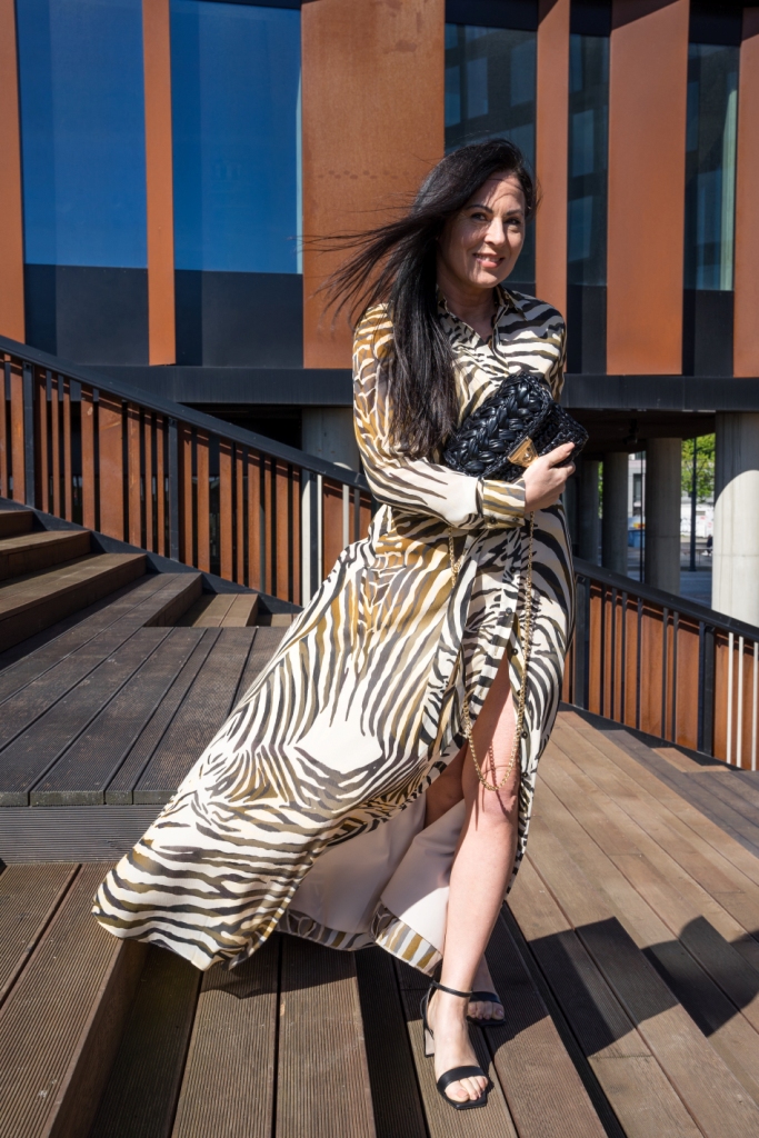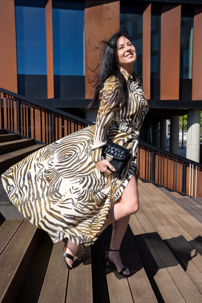 Sukienki w zwierzęcy wzór nigdy nie wyjdą z mody, może więc warto mieć choć jedną w swojej garderobie. Ja w poszukiwaniu tej idealnej dla siebie, trafiłam na model, który będę nosić całe lato z sneakersami. Myślę, że jesienią także, bo z kozakami będzie wyglądać zabójczo. Do tej długiej, zwiewnej sukni w wzór zebry dobrałam czarne sandały Aura marki Hammer ze skóry licowej z ozdobnym łańcuszkiem przy zapięciu. Torebkę wybrałam również czarną, jednak taką, której nie zdominuje mocny print sukienki. Kakadu Metalik to torebka wykonana ręcznie. Jej gruby splot, połysk i metalowe, złote wykończenia sprawiają że nie można od niej oderwać wzroku. Dodatki to ciemne okulary i naszyjnik w kształcie łańcucha, którego ogniwa to połączenie metalu ze skórą.