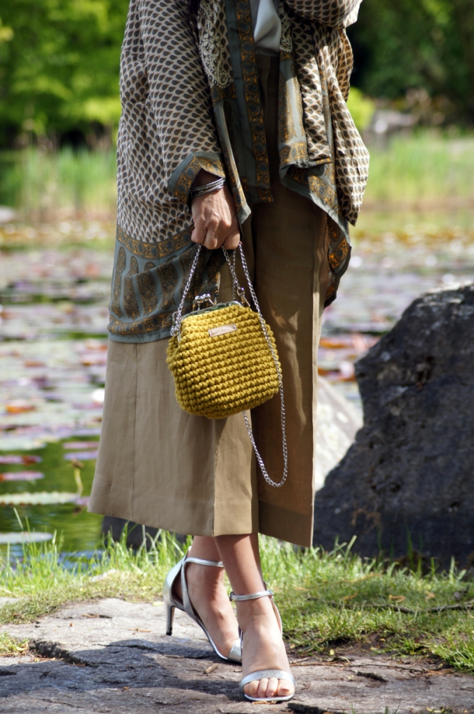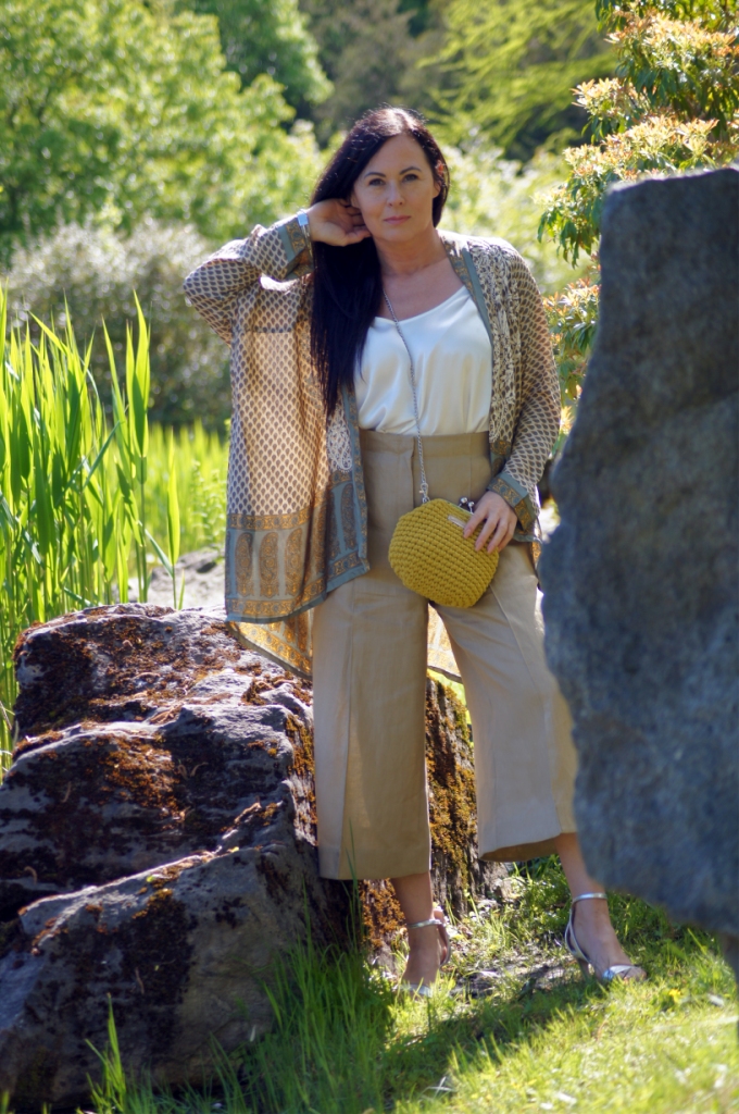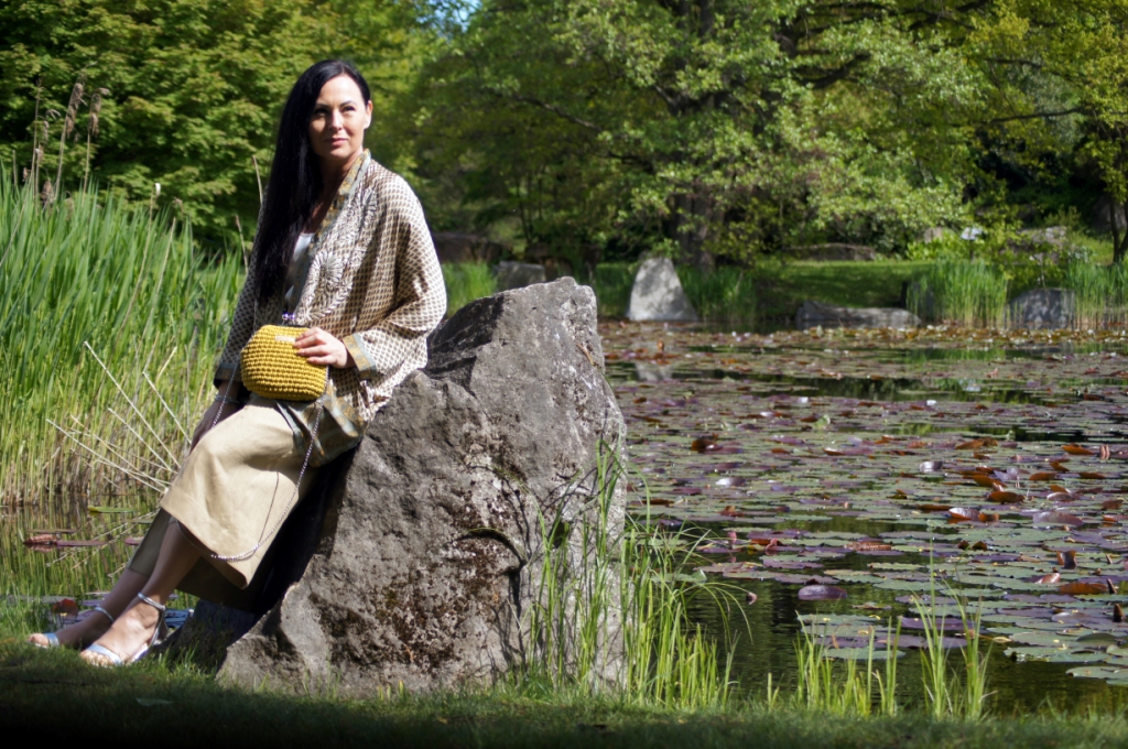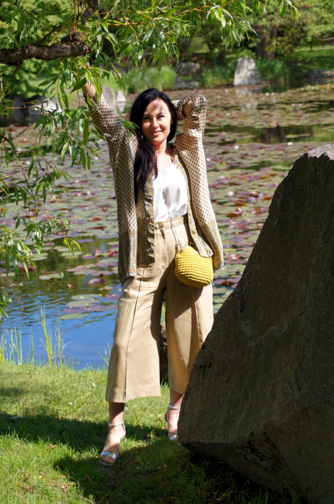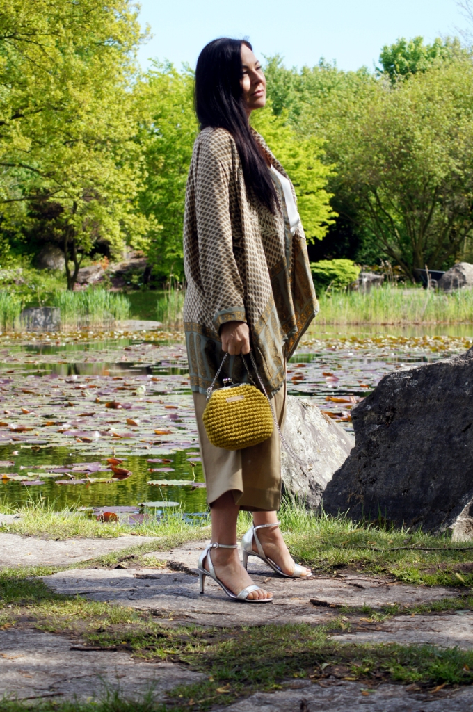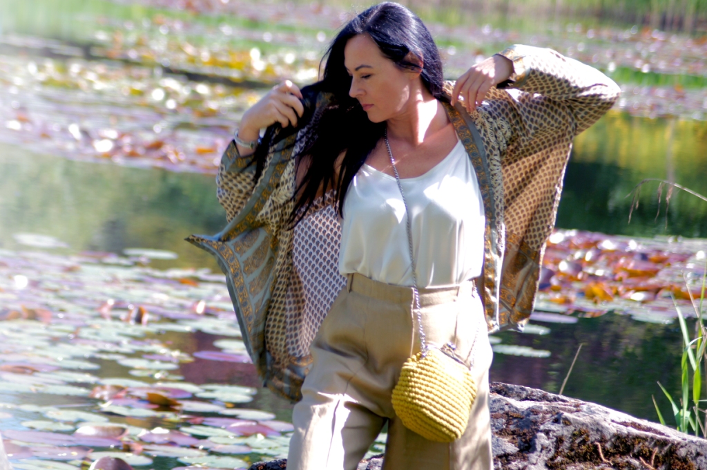 Kimono kojarzy nam się z lekkością, może właśnie dlatego chętne nosimy je w upalne dni. Zazwyczaj z jego udziałem tworzymy stylizacje plażowe, wieczorowe lub w stylu boho. Z powodzeniem zastąpi nam letni żakiet. Ja swoje jedwabne kimono z pięknym haftem połączyłam z lnianymi kulotami i białą bluzką z wiskozy. Dodatki wybrałam również z materiałów naturalnych. Torebka ,,Oregano” zrobiona z bawełny, choć skromna, swoim kolorem dodała smaczku. Jej srebrny łańcuszek sprowokował mnie do włożenia srebrnych sandałów na obcasie. Z biżuterii wybrałam delikatną bransoletkę zapinaną na magnes.
