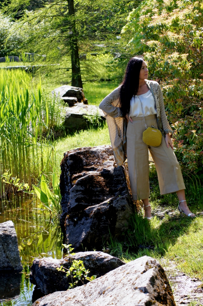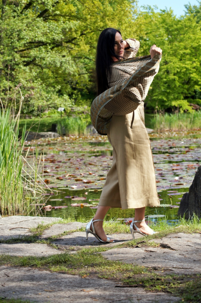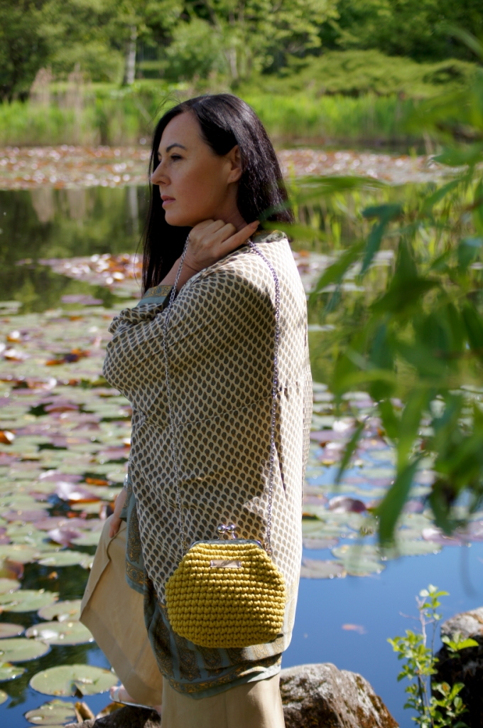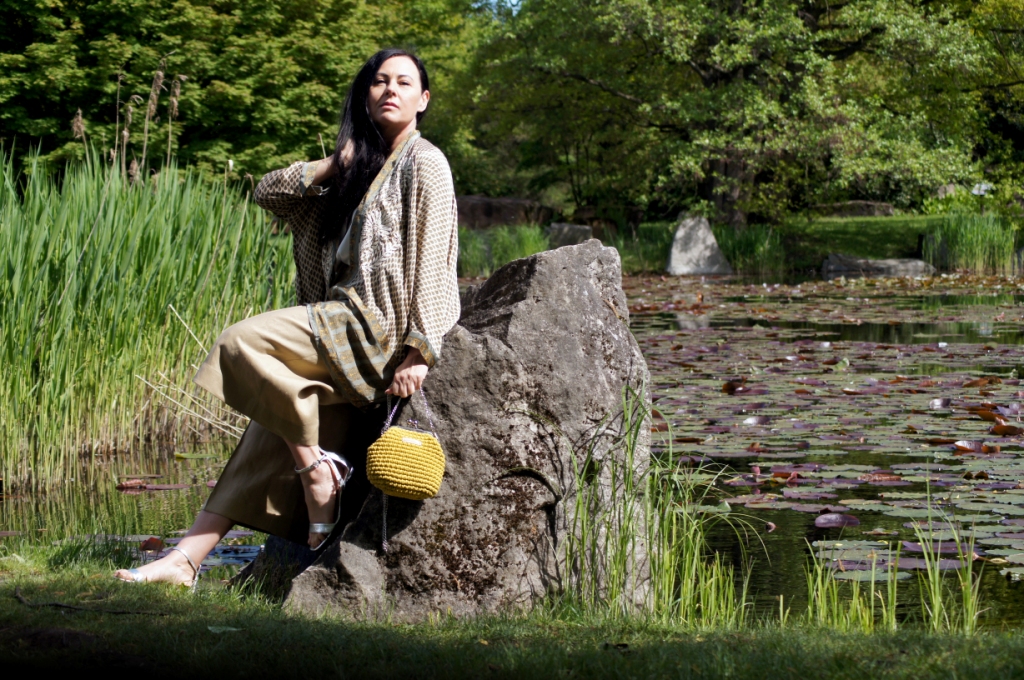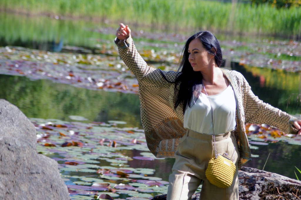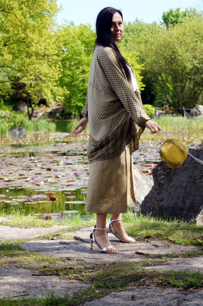 Kimono kojarzy nam się z lekkością, może właśnie dlatego chętne nosimy je w upalne dni. Zazwyczaj z jego udziałem tworzymy stylizacje plażowe, wieczorowe lub w stylu boho. Z powodzeniem zastąpi nam letni żakiet. Ja swoje jedwabne kimono z pięknym haftem połączyłam z lnianymi kulotami i białą bluzką z wiskozy. Dodatki wybrałam również z materiałów naturalnych. Torebka ,,Oregano” zrobiona z bawełny, choć skromna, swoim kolorem dodała smaczku. Jej srebrny łańcuszek sprowokował mnie do włożenia srebrnych sandałów na obcasie. Z biżuterii wybrałam delikatną bransoletkę zapinaną na magnes.