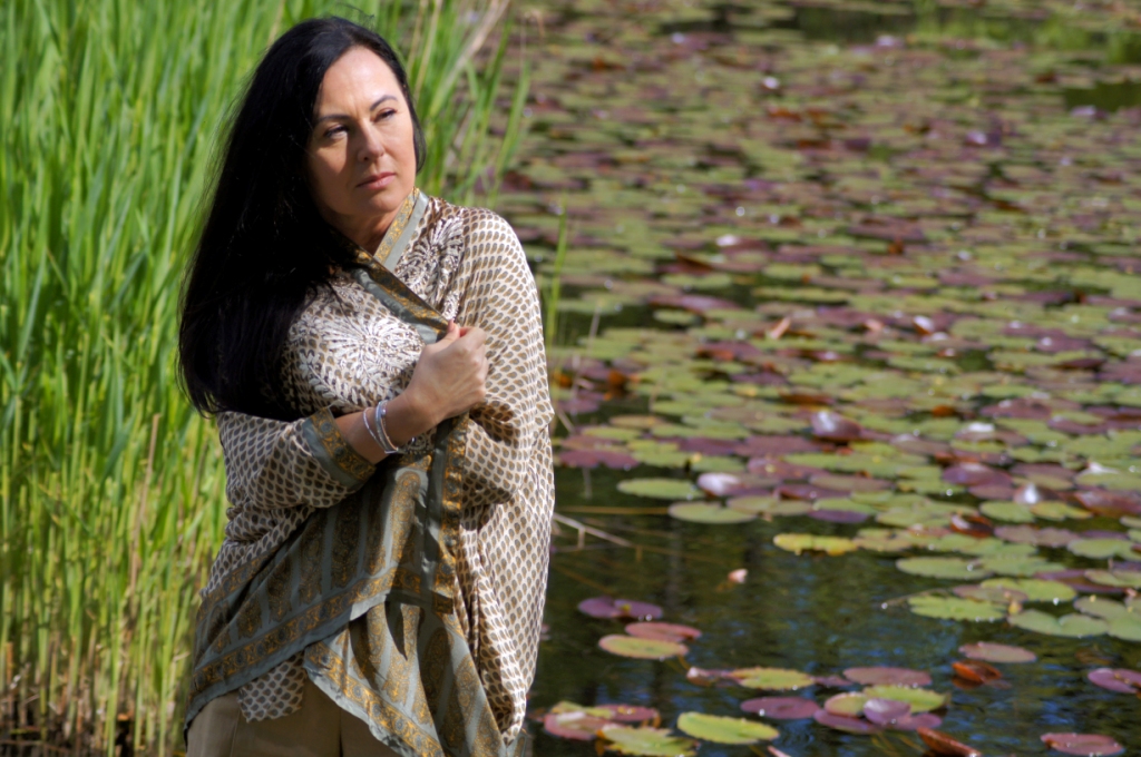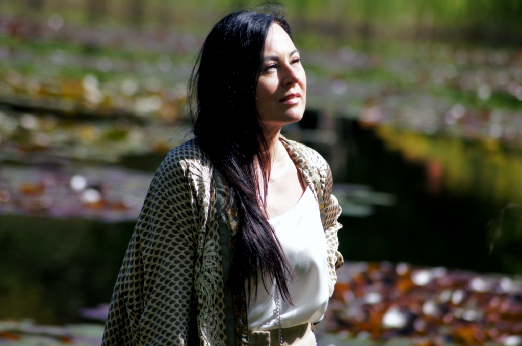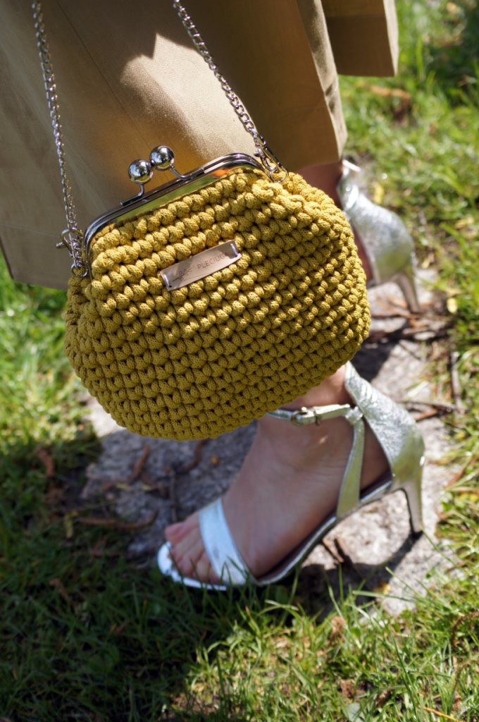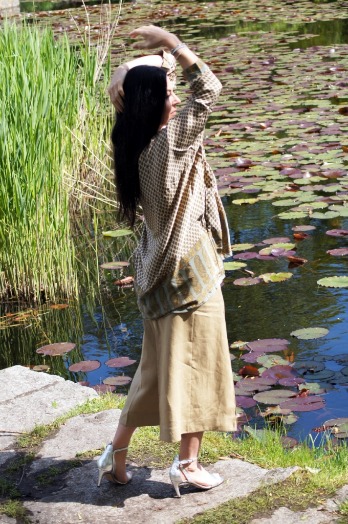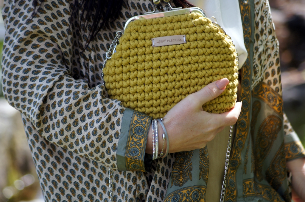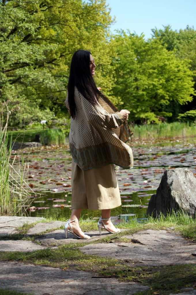 Kimono kojarzy nam się z lekkością, może właśnie dlatego chętne nosimy je w upalne dni. Zazwyczaj z jego udziałem tworzymy stylizacje plażowe, wieczorowe lub w stylu boho. Z powodzeniem zastąpi nam letni żakiet. Ja swoje jedwabne kimono z pięknym haftem połączyłam z lnianymi kulotami i białą bluzką z wiskozy. Dodatki wybrałam również z materiałów naturalnych. Torebka ,,Oregano” zrobiona z bawełny, choć skromna, swoim kolorem dodała smaczku. Jej srebrny łańcuszek sprowokował mnie do włożenia srebrnych sandałów na obcasie. Z biżuterii wybrałam delikatną bransoletkę zapinaną na magnes.