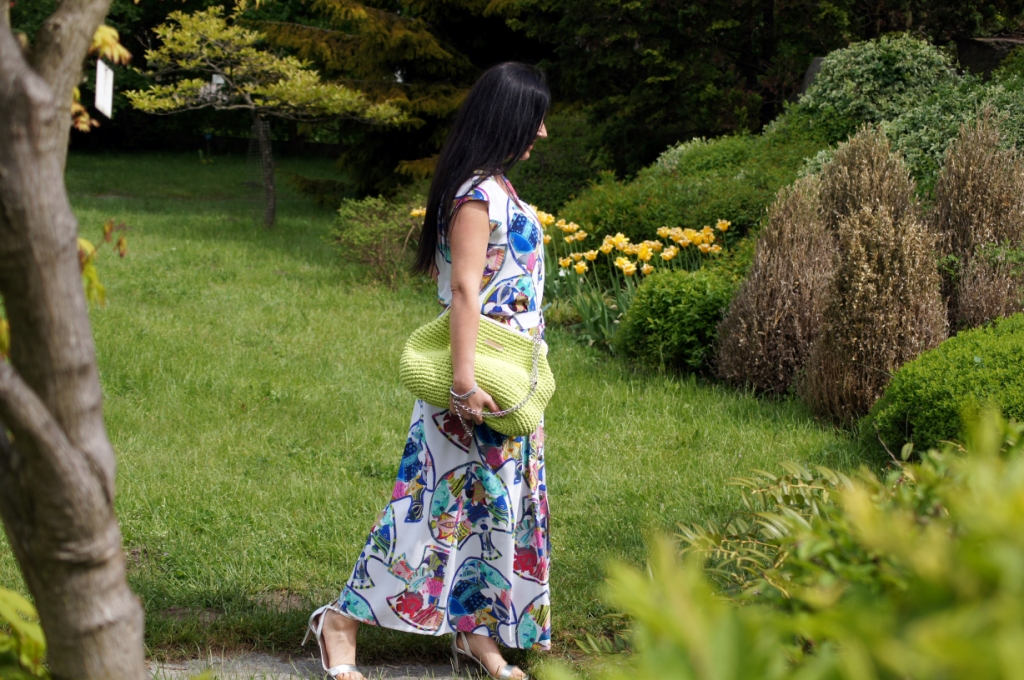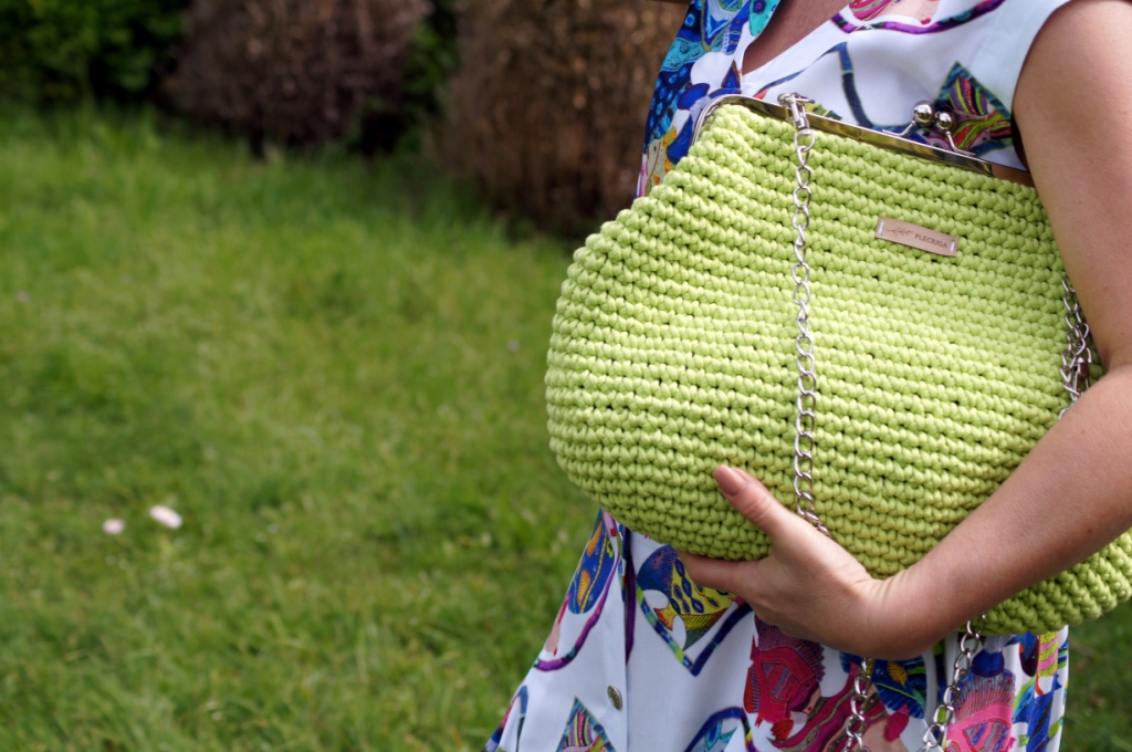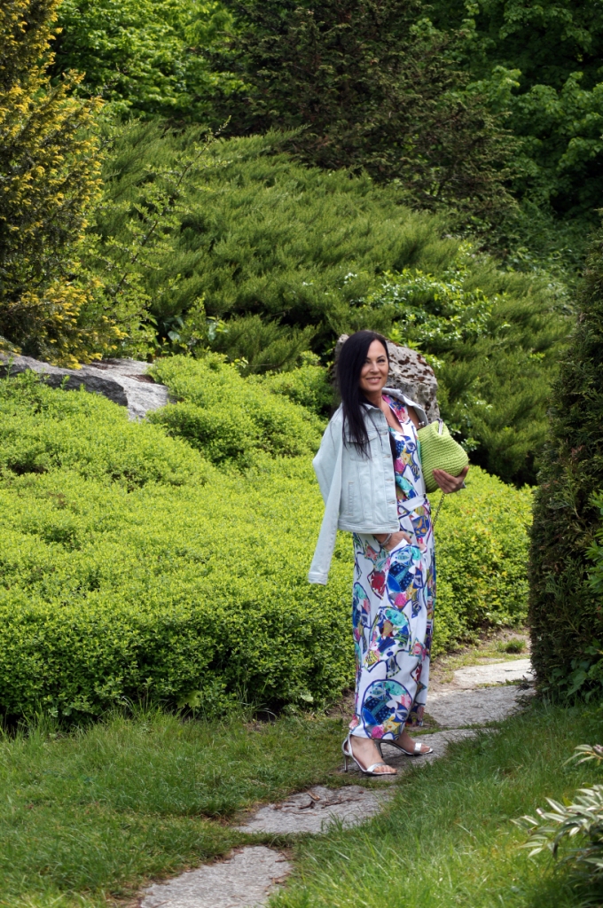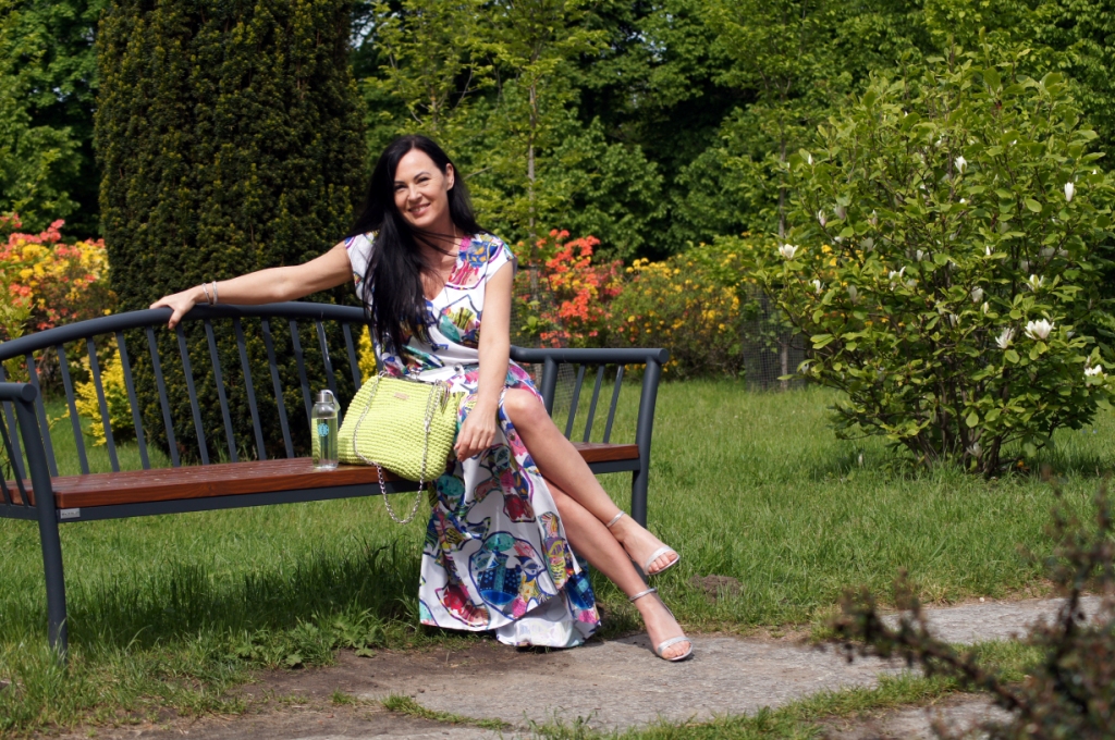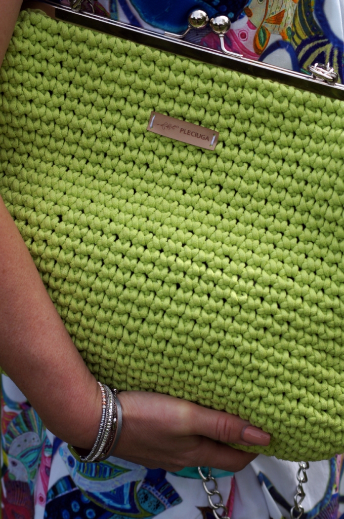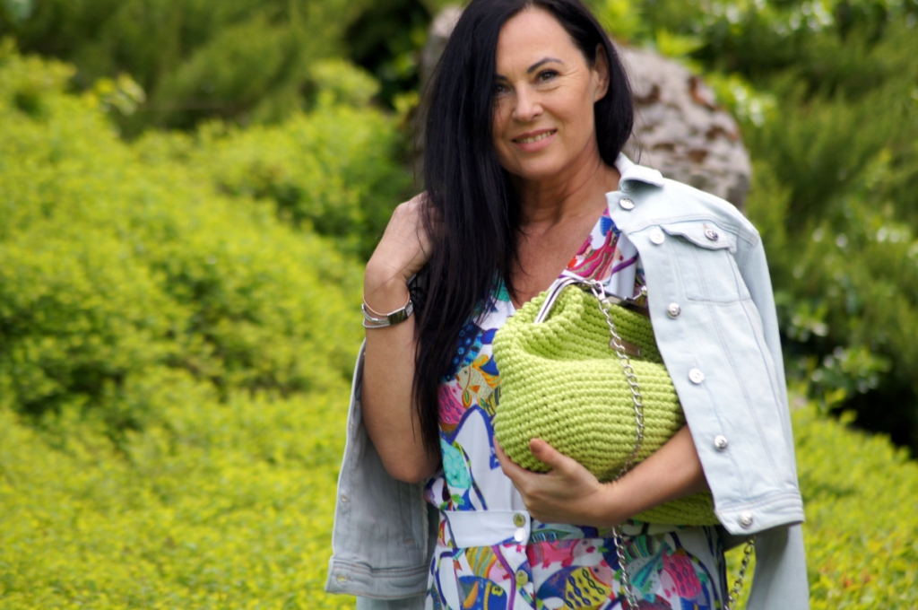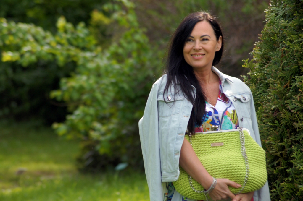 Nawet największe miłośniczki sukienek muszą przyznać, że komplety dają więcej możliwości stylizacji. Pakując się na urlop, do takiego kompletu jak mój dzisiejszy wystarczy dorzucić jeansy i bokserkę w dowolnym kolorze i z dwóch stylizacji mamy cztery. Dziś mam na sobie bluzkę, zamaszystą spódnicę rozpinaną z przodu i ponadczasową, denimową kurtkę. By dodać świeżości w ten upalny dzień zdecydowałam się na torbę od Pleciuga w neonowy, zielony kolor. Jej zapięcie na bigiel i srebrny łańcuszek dodaje szyku. Srebrne są, także sandały na obcasie i bransoletka.