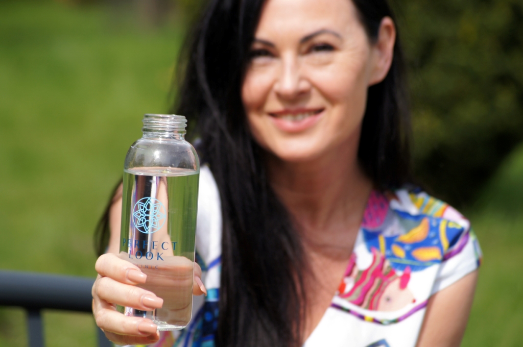 Bluzka i spódnica – Caroline Biss Kurtka – Oui Torba – Bazylia Pleciuga Buty – AURA Hammer Biżuteria – Yvon Okulary – Vermari Butelka – Perfect Look Clinik Łódź