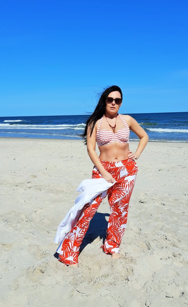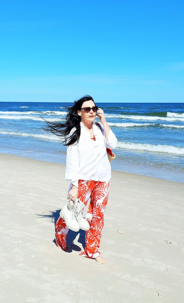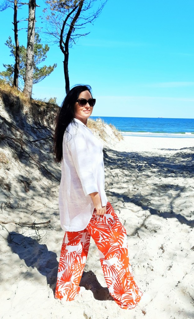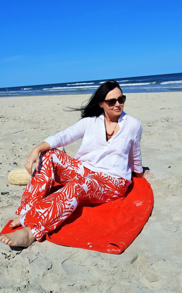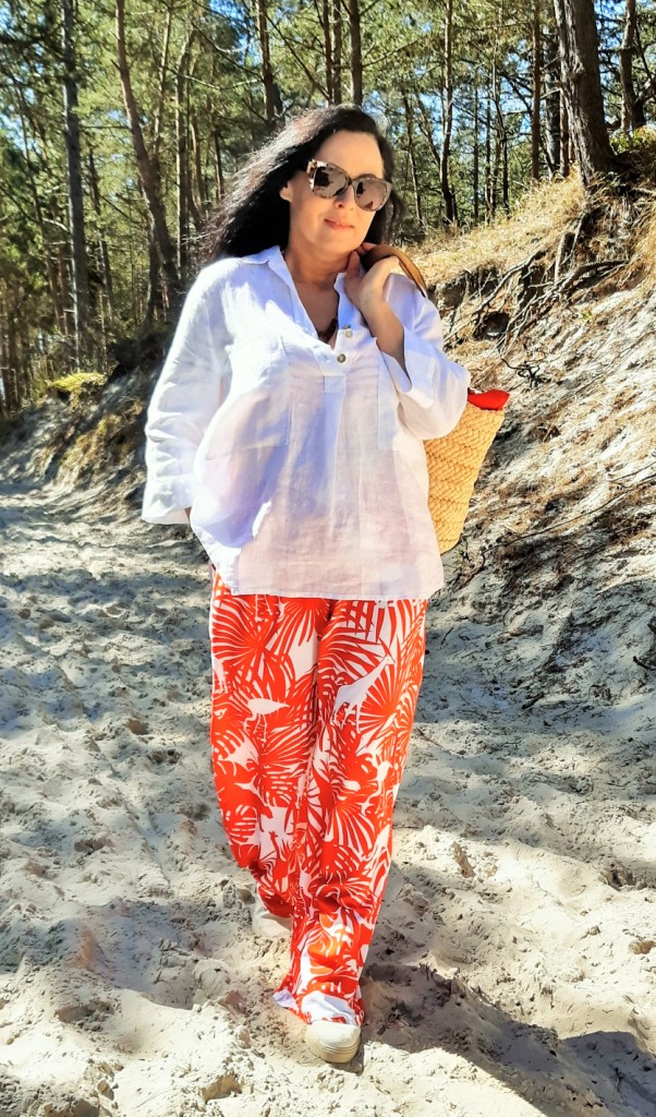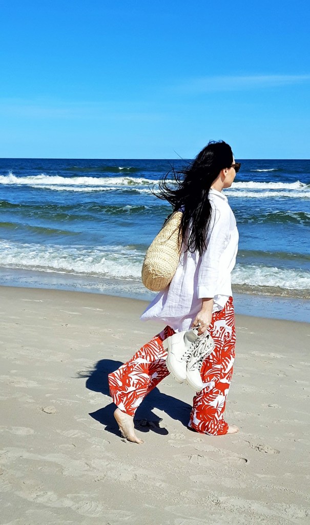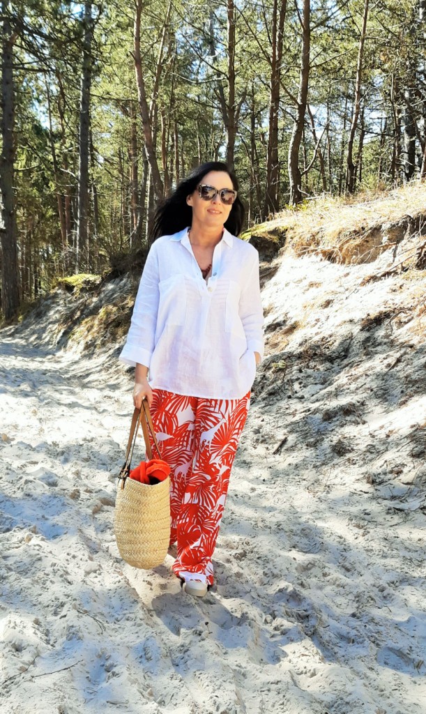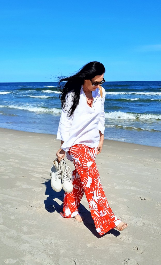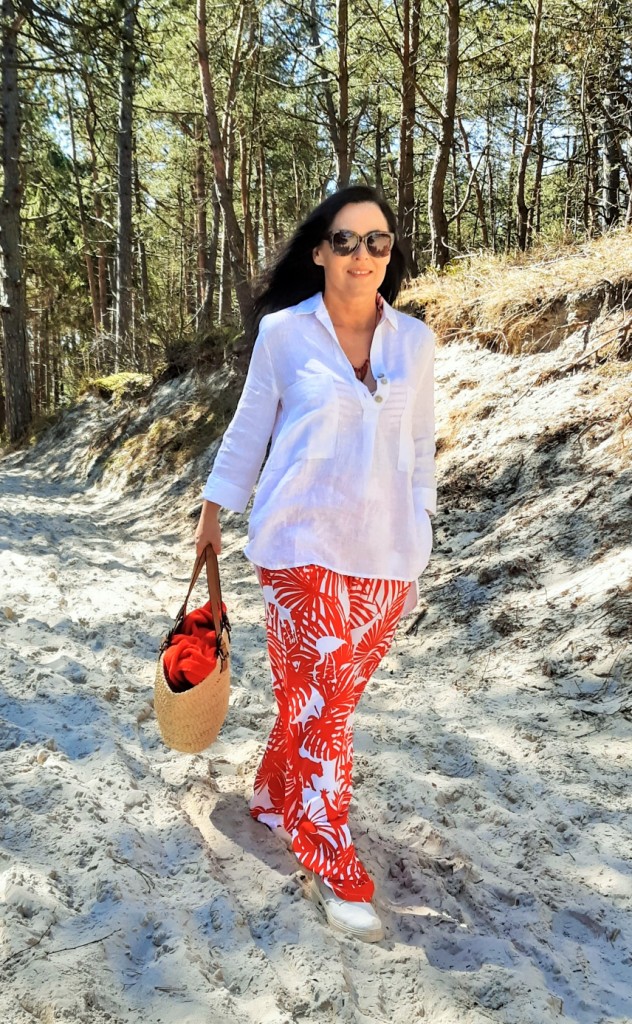 Moda plażowa to nie tylko kostium kąpielowy i kapelusz. Co ja pakuję do walizki ? Obowiązkowo obszerną, białą koszule. W tym roku jest to lniana koszula rozpinana pod szyją. Len chroni mnie przed szkodliwymi promieniami UV i dodatkowo jest przewiewny. Buty na traktorowym spodzie to hit sezonu , wybrałam ich letnia wersję z lnu. Koloru dodały długie, luźne spodnie w czerwony, egzotyczny nadruk i dwuczęściowy kostium kąpielowy w czerwone paski. Z dodatków – kosz, w którym pomieszczę wszystko czego potrzebuję na plaży i okulary przeciwsłoneczne . Biżuteria to naszyjnik z łańcuszków i lawy wulkanicznej barwionej na czerwono.