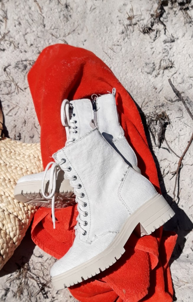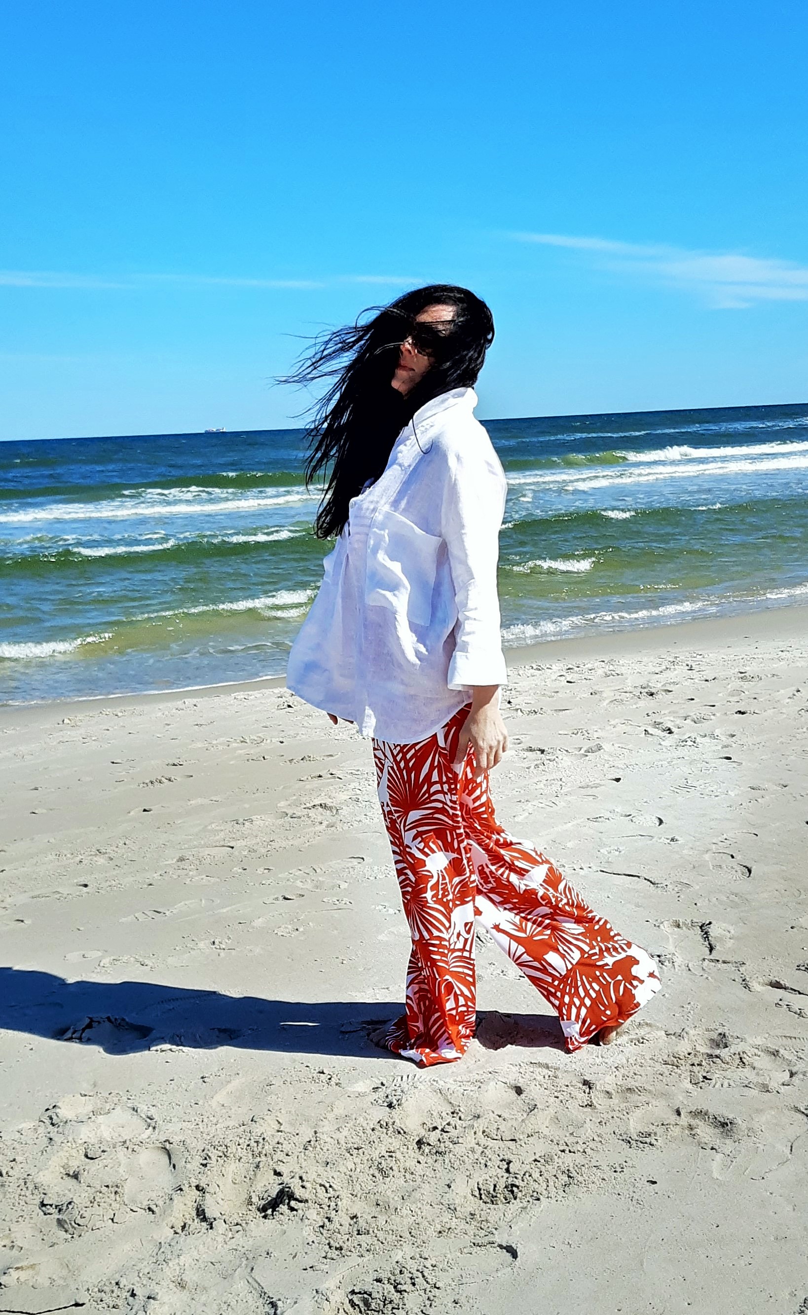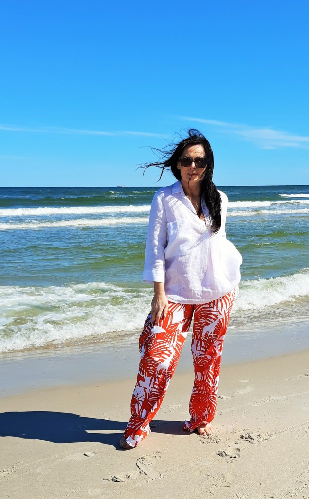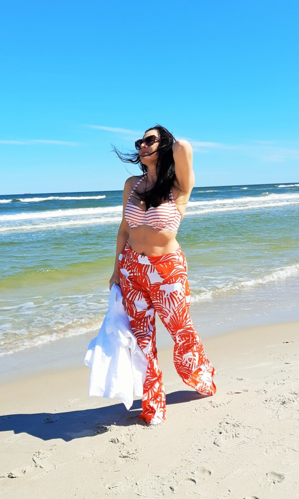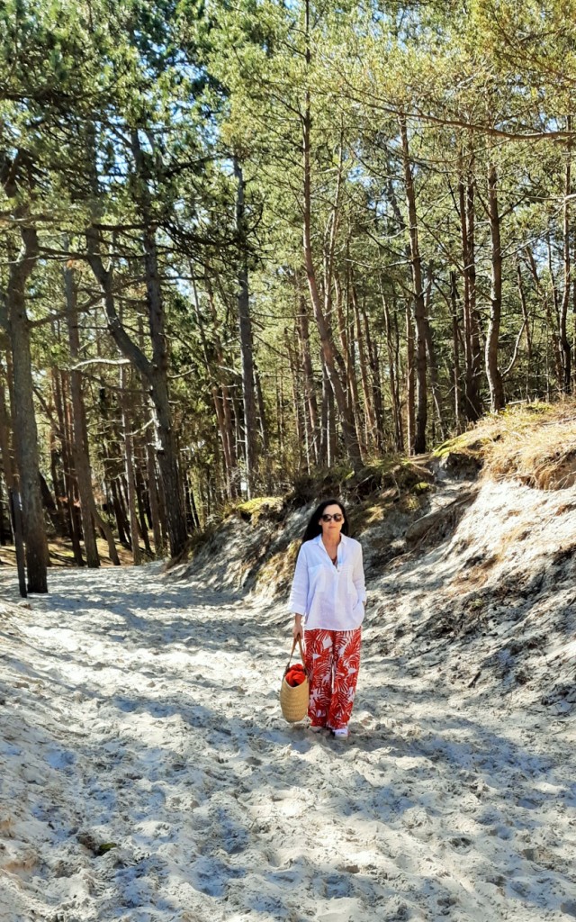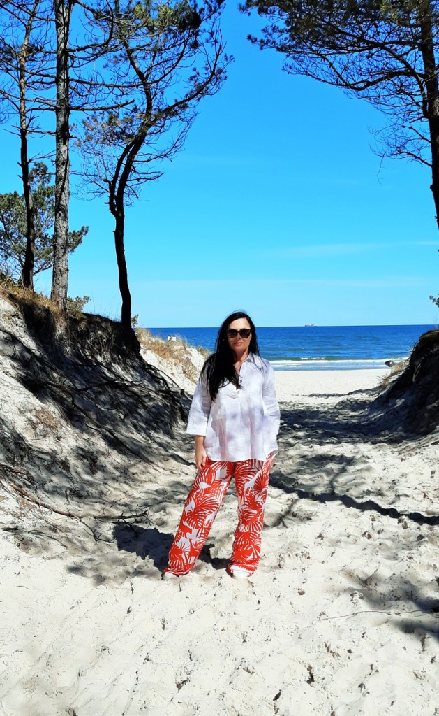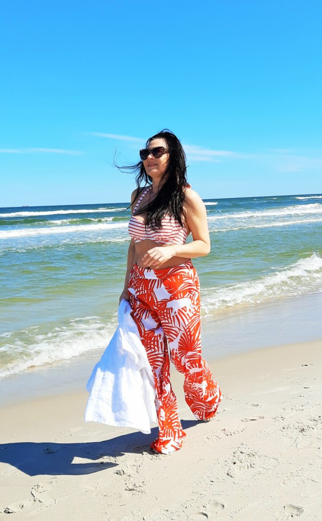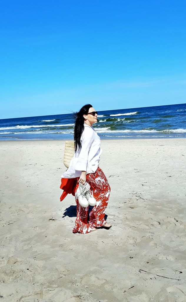 Moda plażowa to nie tylko kostium kąpielowy i kapelusz. Co ja pakuję do walizki ? Obowiązkowo obszerną, białą koszule. W tym roku jest to lniana koszula rozpinana pod szyją. Len chroni mnie przed szkodliwymi promieniami UV i dodatkowo jest przewiewny. Buty na traktorowym spodzie to hit sezonu , wybrałam ich letnia wersję z lnu. Koloru dodały długie, luźne spodnie w czerwony, egzotyczny nadruk i dwuczęściowy kostium kąpielowy w czerwone paski. Z dodatków – kosz, w którym pomieszczę wszystko czego potrzebuję na plaży i okulary przeciwsłoneczne . Biżuteria to naszyjnik z łańcuszków i lawy wulkanicznej barwionej na czerwono.