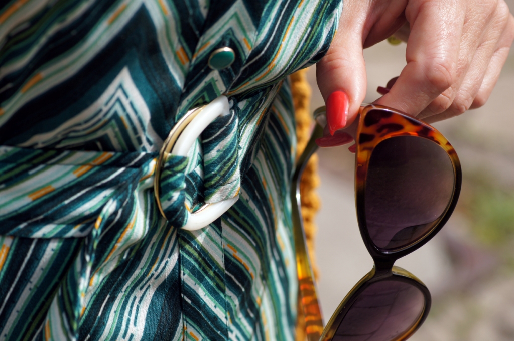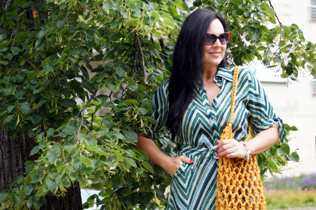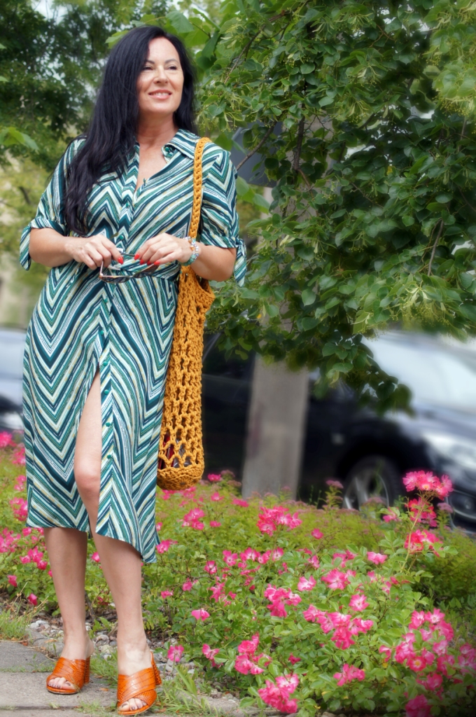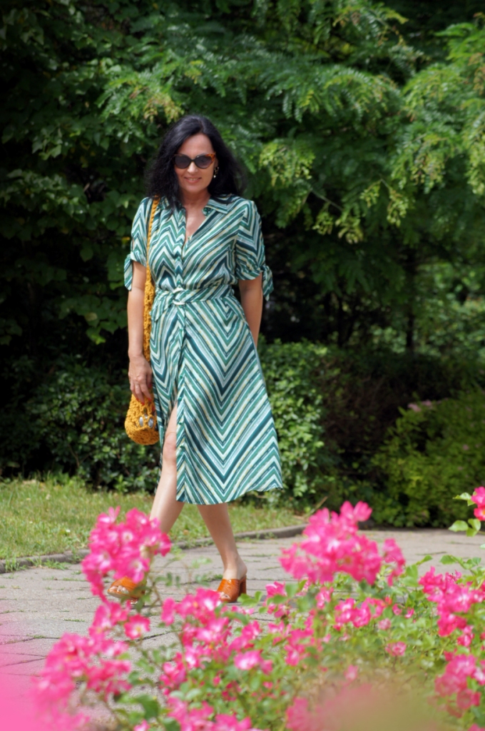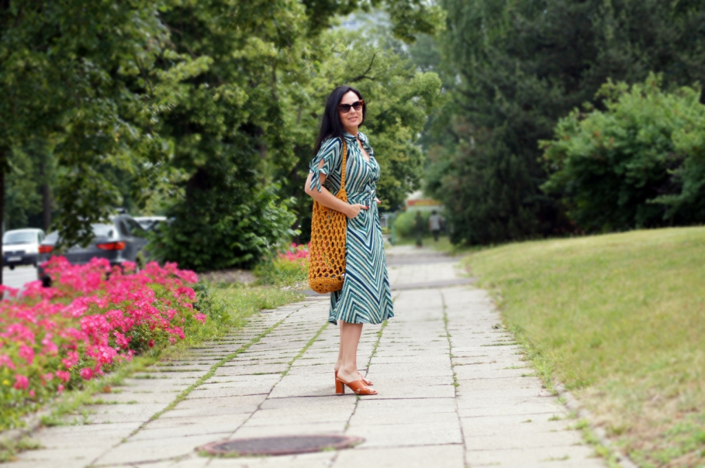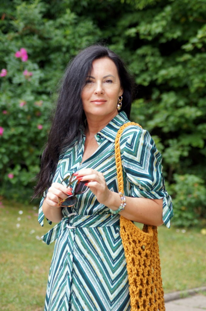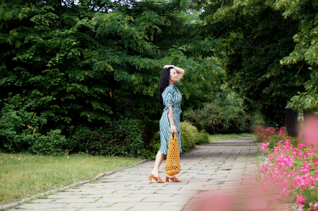 Latem często noszę szmizjerki, szczególnie te w stylu vintage. Najczęściej wybieram takie w mocny, kolorowy print. Ta, którą mam dziś na sobie w zielone, skośne paski ma ozdobne smaczki, które uwielbiam, takie jak wiązanie na rękawkach, czy piękne, zielone guziczki. Dziś dodatki także wybrałam w stylu vintage. Torba, a właściwie siatka to kolejna perełka od Pleciugi w miodowym kolorze. W podobny co siatka kolorze są klapki Lotis od Hammer na wygodnym obcasie. Do tego okulary w kształcie kociego oka i biżuteria.