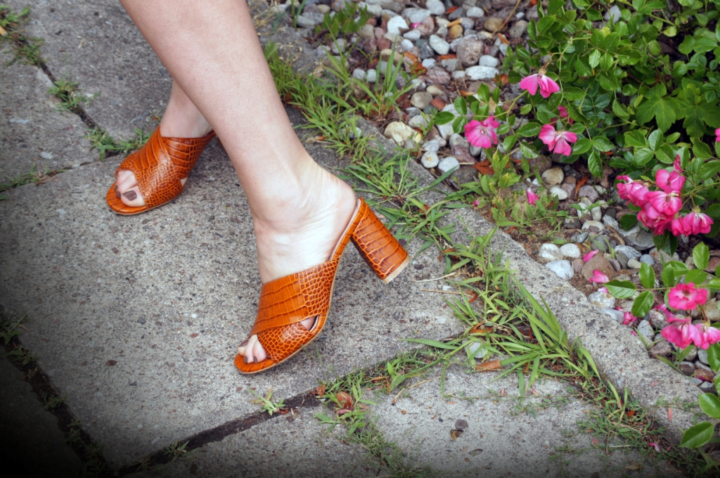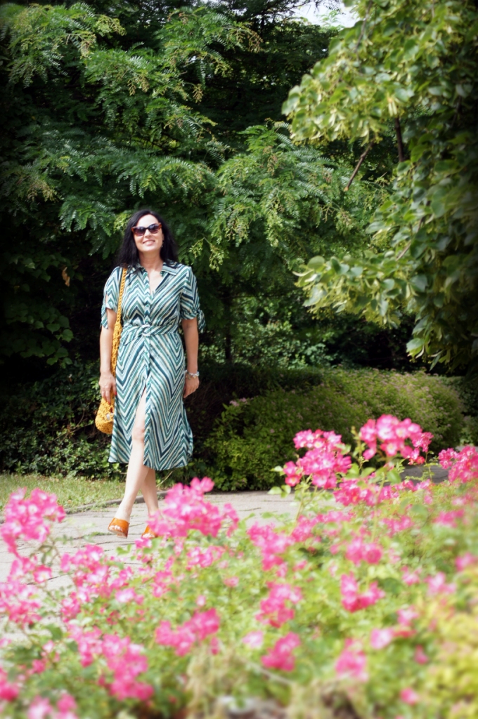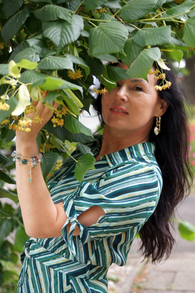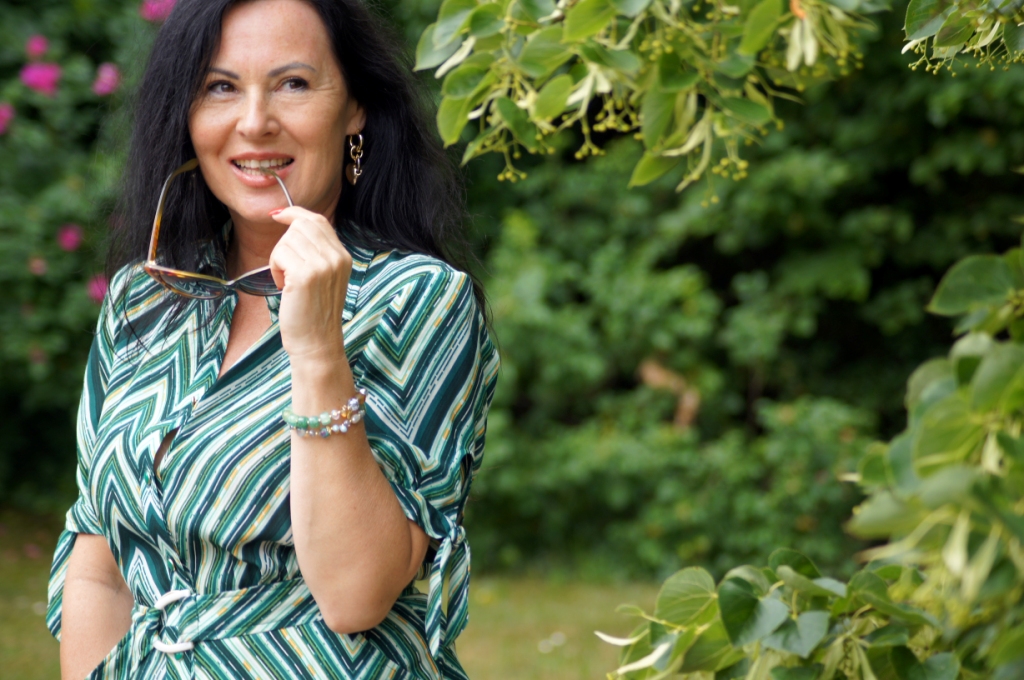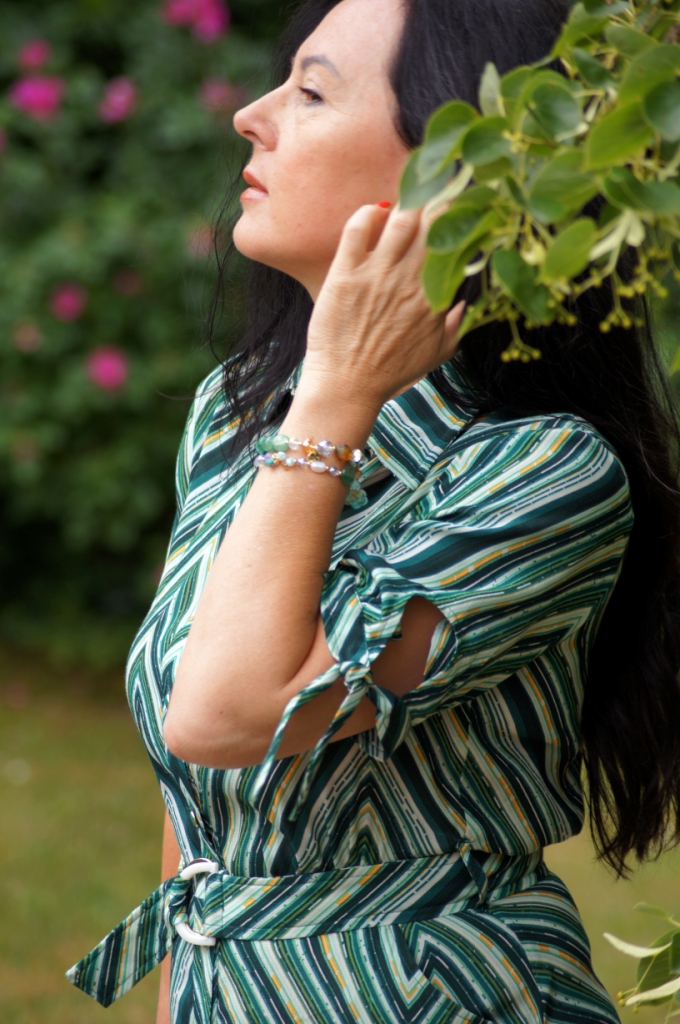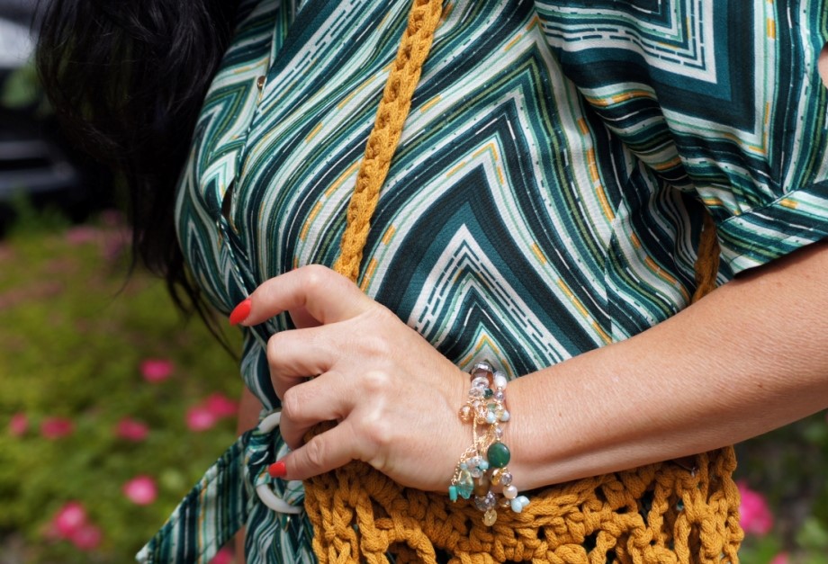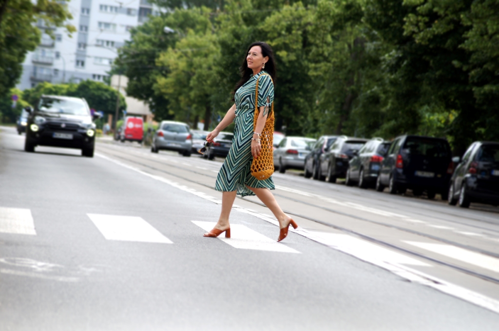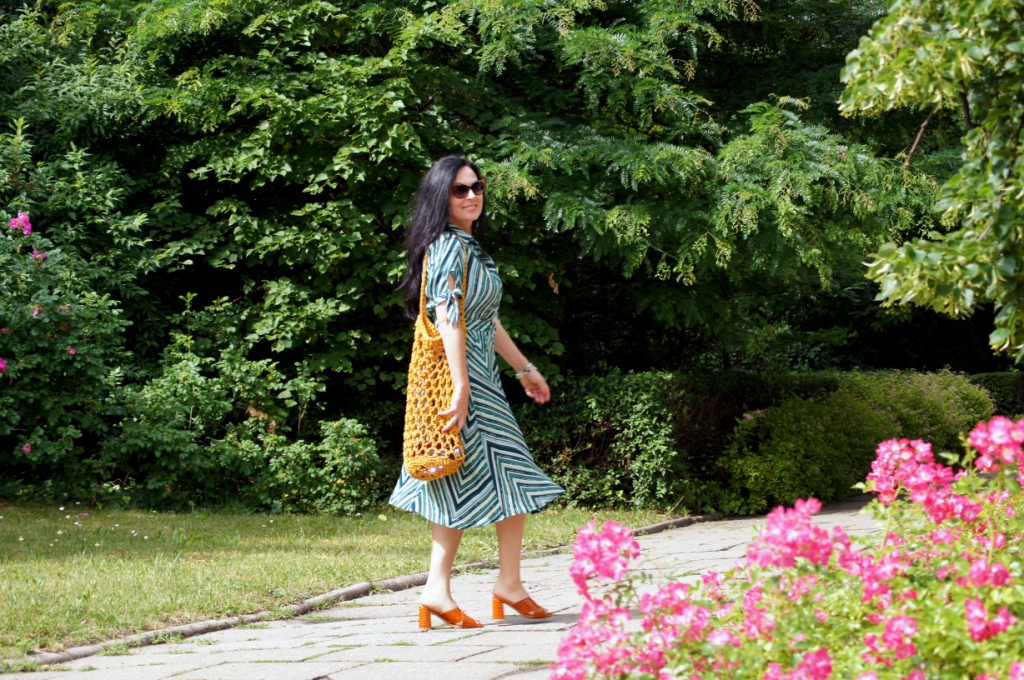 Latem często noszę szmizjerki, szczególnie te w stylu vintage. Najczęściej wybieram takie w mocny, kolorowy print. Ta, którą mam dziś na sobie w zielone, skośne paski ma ozdobne smaczki, które uwielbiam, takie jak wiązanie na rękawkach, czy piękne, zielone guziczki. Dziś dodatki także wybrałam w stylu vintage. Torba, a właściwie siatka to kolejna perełka od Pleciugi w miodowym kolorze. W podobny co siatka kolorze są klapki Lotis od Hammer na wygodnym obcasie. Do tego okulary w kształcie kociego oka i biżuteria.
