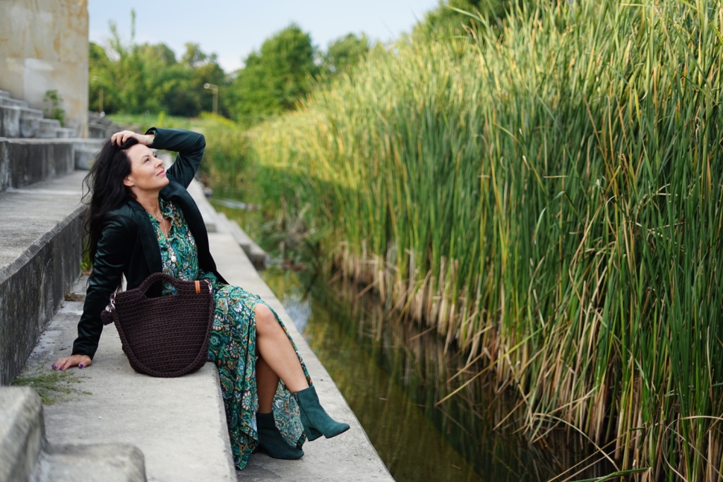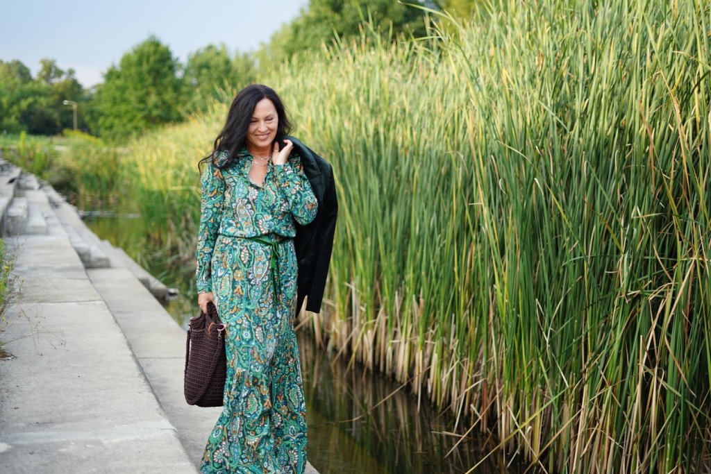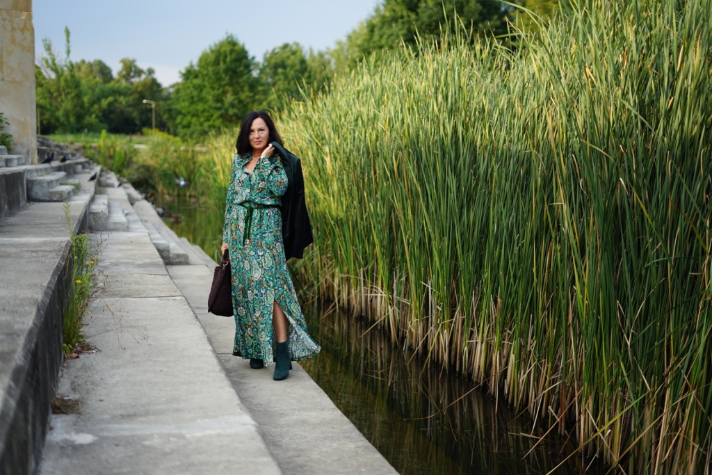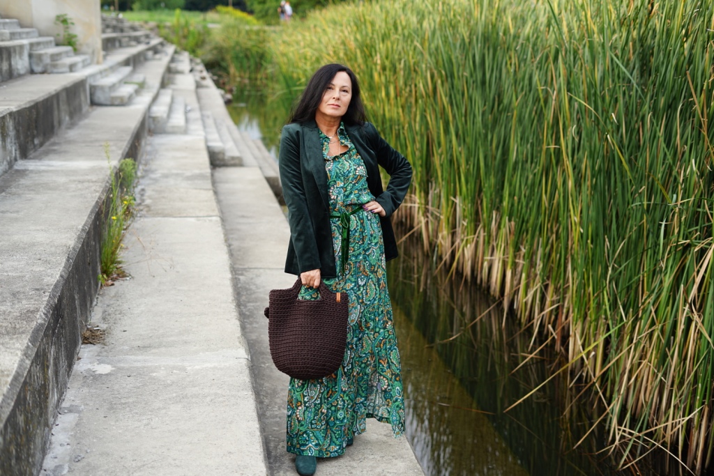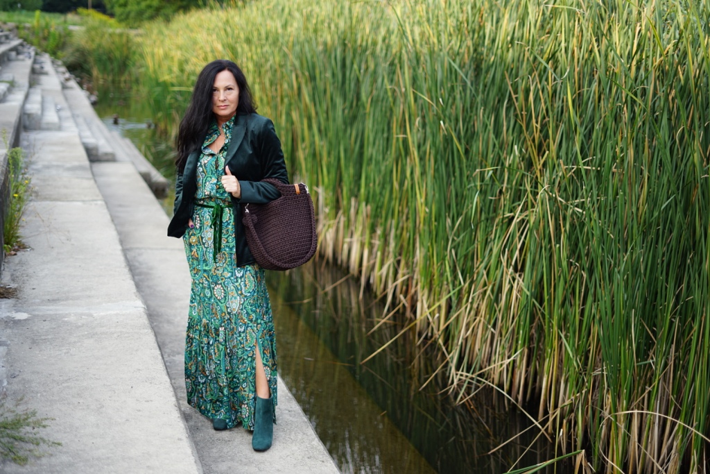 Kolekcje w stylu bohemy pojawiły się na wybiegach Izabel Marant, Etro i Chloe. Możemy w nich odnaleźć nawiązanie do folkloru, a jednocześnie elementy garderoby salonowej. To styl dla kobiet, które są eleganckie, a jednocześnie kochają boho. Moja propozycja to komplet ( koszula i spódnica ) w kolorowy, florystyczny print, zestawiony z klasycznym żakietem z aksamitu w kolorze głębokiej zieleni. Z dodatków wybrałam botki z zielonego zamszu, oraz ręcznie robioną torbę, kształtem przypominającą koszyk, którą zdobi duży chwost. Drobnymi elementami, takimi jak pasek z zielonej aksamitki i złote łańcuszki dodałam stylizacji smaczku.