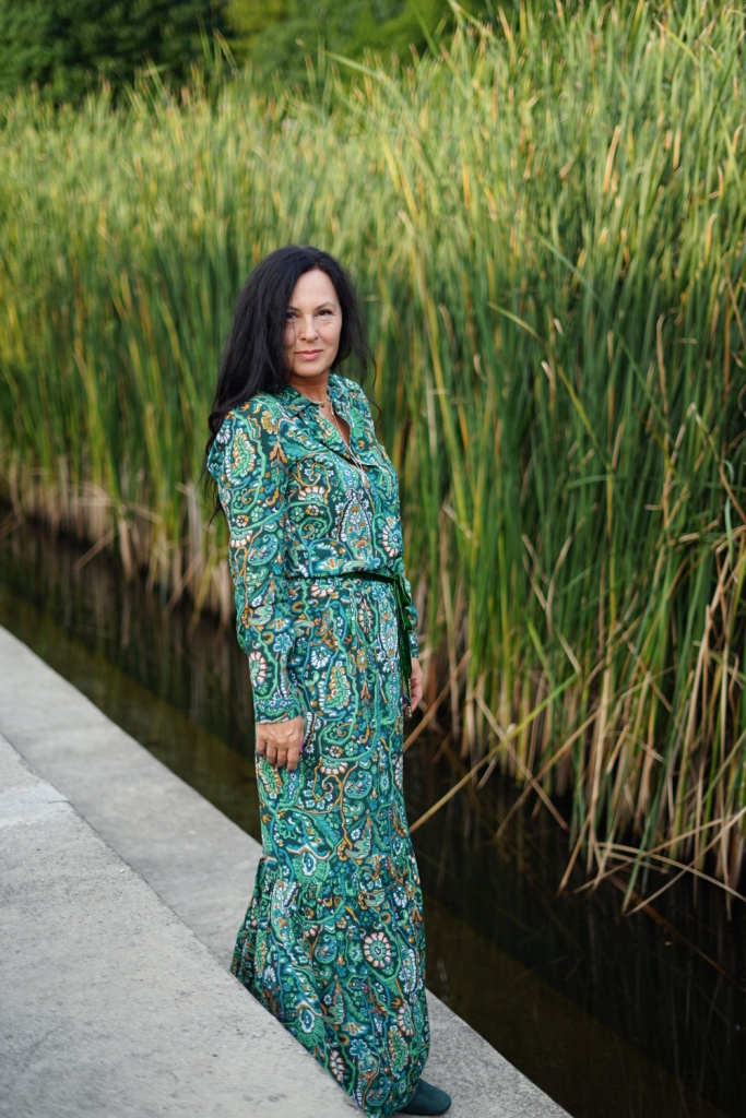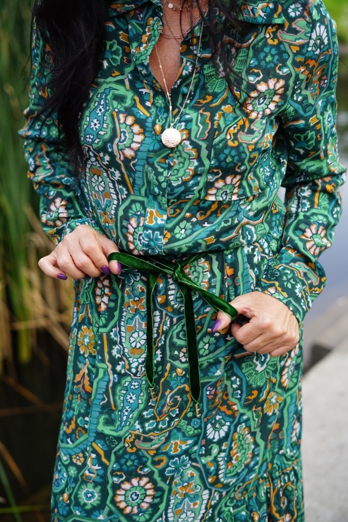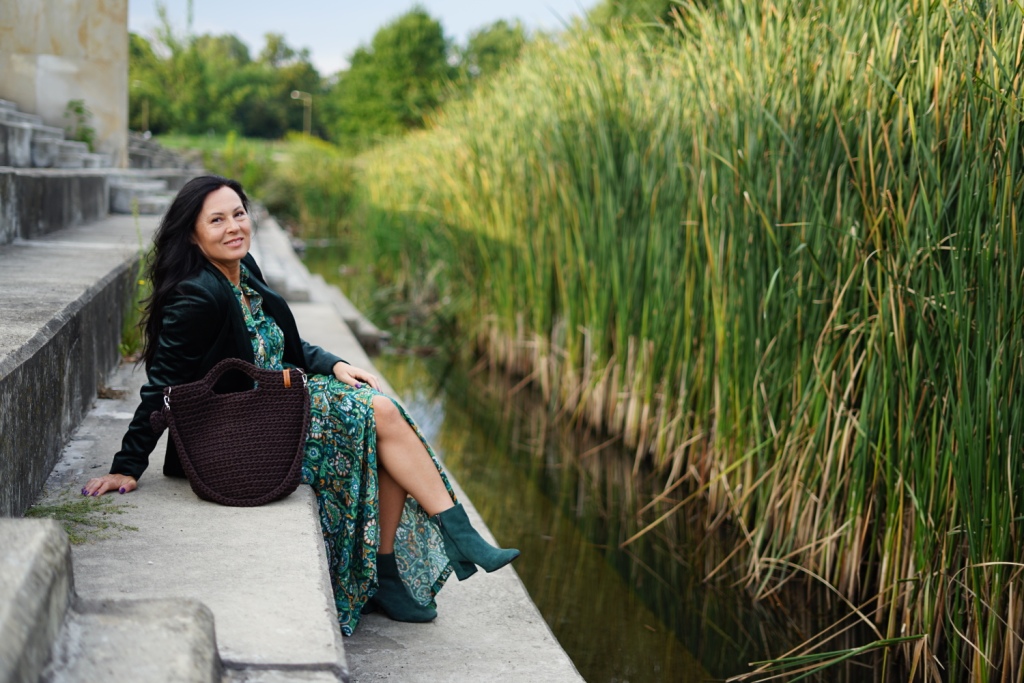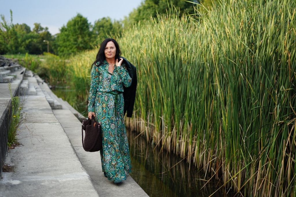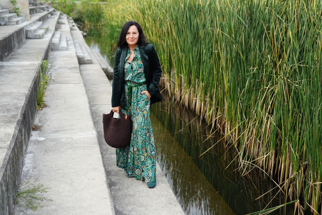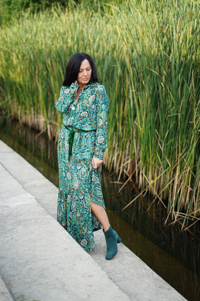 Kolekcje w stylu bohemy pojawiły się na wybiegach Izabel Marant, Etro i Chloe. Możemy w nich odnaleźć nawiązanie do folkloru, a jednocześnie elementy garderoby salonowej. To styl dla kobiet, które są eleganckie, a jednocześnie kochają boho. Moja propozycja to komplet ( koszula i spódnica ) w kolorowy, florystyczny print, zestawiony z klasycznym żakietem z aksamitu w kolorze głębokiej zieleni. Z dodatków wybrałam botki z zielonego zamszu, oraz ręcznie robioną torbę, kształtem przypominającą koszyk, którą zdobi duży chwost. Drobnymi elementami, takimi jak pasek z zielonej aksamitki i złote łańcuszki dodałam stylizacji smaczku.