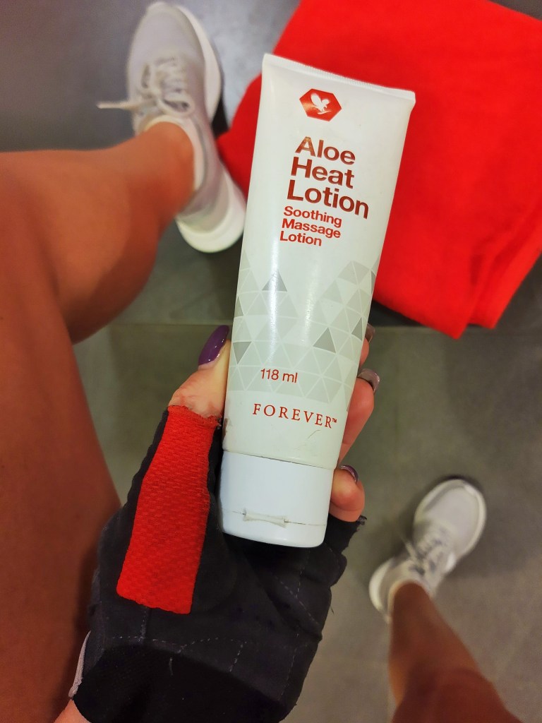 Po treningu do masażu używam ALOE HEAT LOTION. Produkt poleciła mi Dominika Ludzińska To kojąca emulsja z chłodzącym miąższem aloe vera. Jego piękny aromat mentolu i eukaliptusa długo się utrzymuje na skórze. Doskonały by ukoić zmęczone mięśnie.