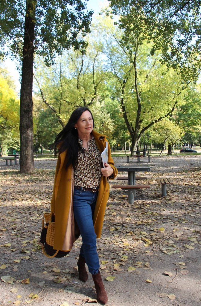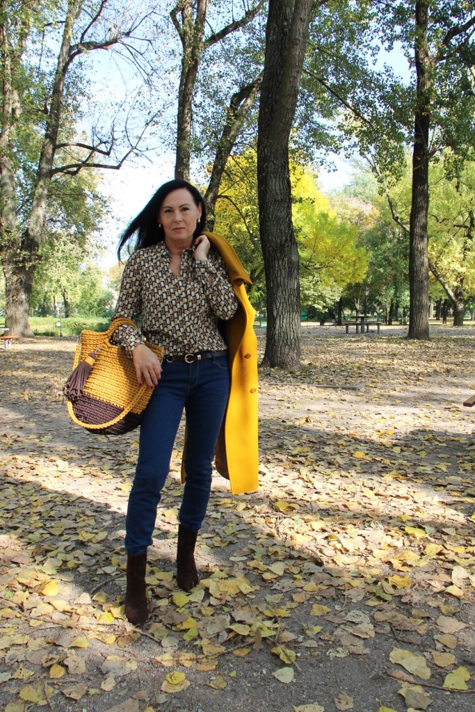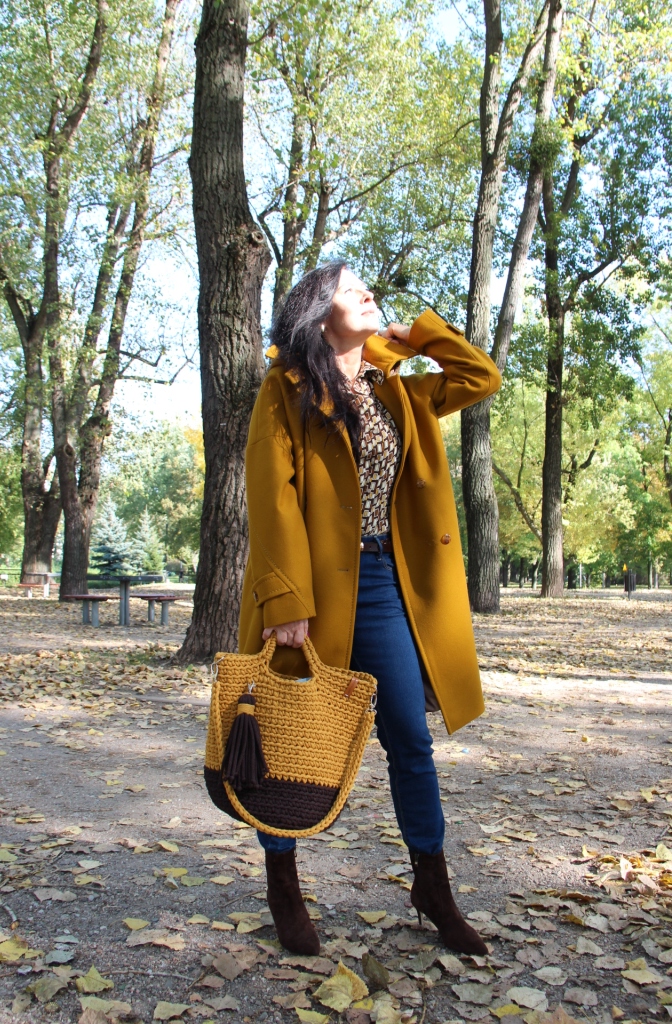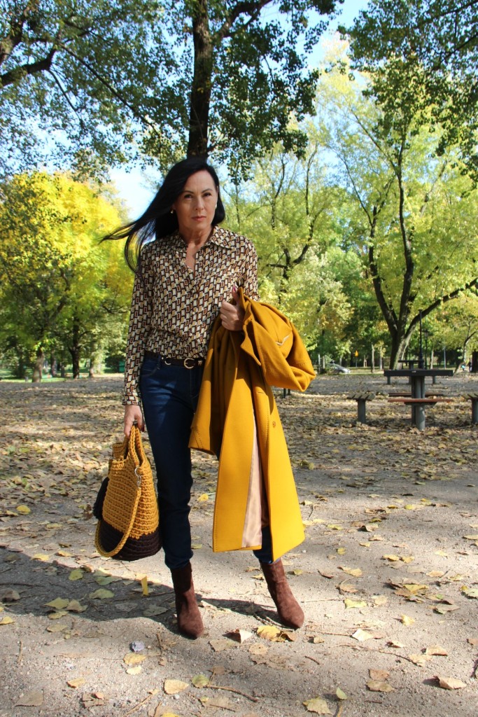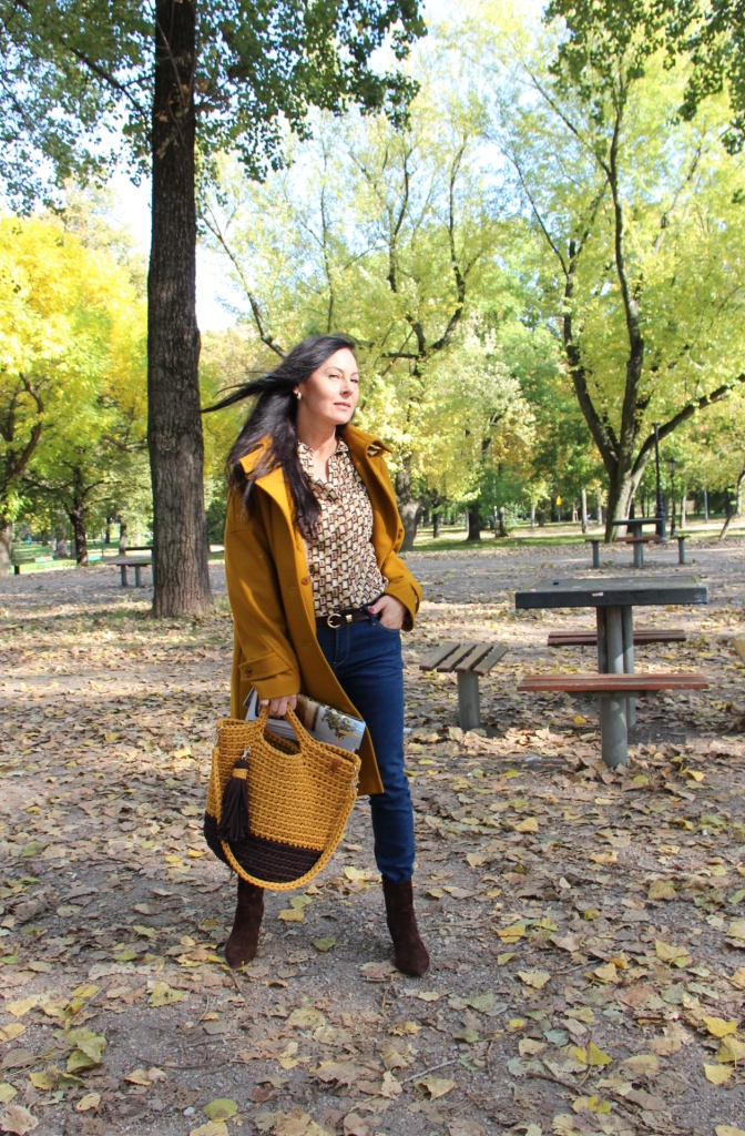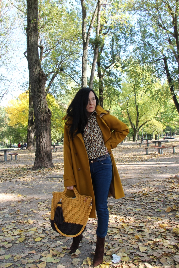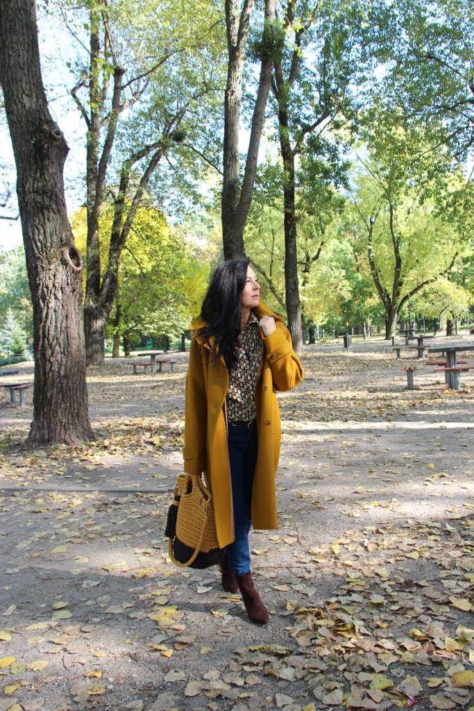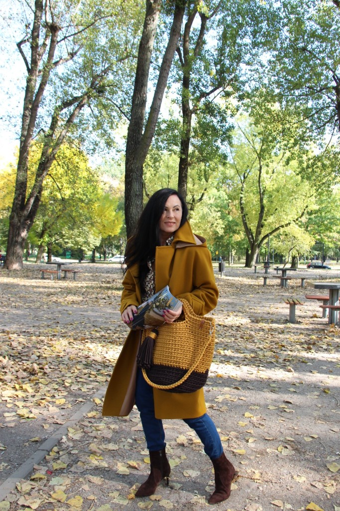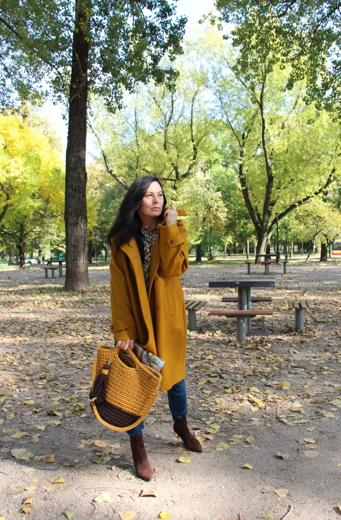 Dzisiejsza stylizacja sprawiła, że przez chwilę poczułam się jak kameleon. Torba, buty, płaszcz oraz wzorzysta koszula są w kolorach spadających liści. Największą przyjemność sprawiło mi włożenie płaszcza. To prosty model w wyjątkowym kolorze, który uwielbiam za duży kołnierz, kaptur (który jest odpinany) i piękne przeszycia. Stylizacje uzupełniają zamszowe, brązowe botki i bawełniana torba z gigantycznym chwostem oraz skórzany, pleciony pasek.