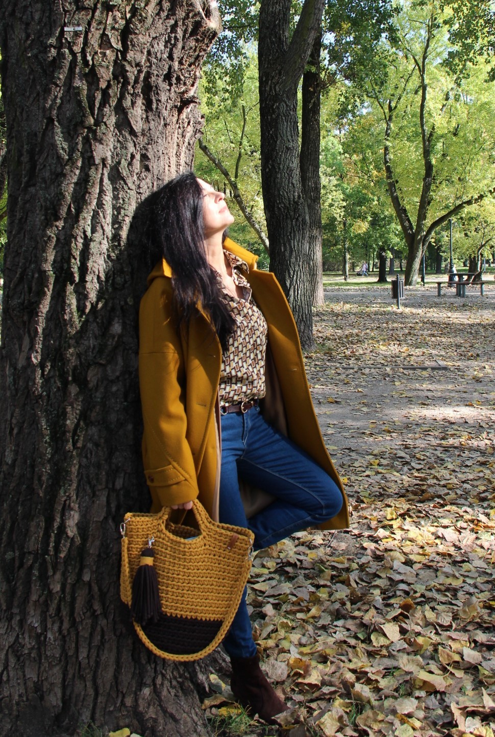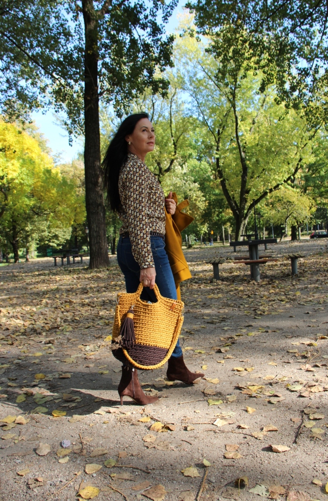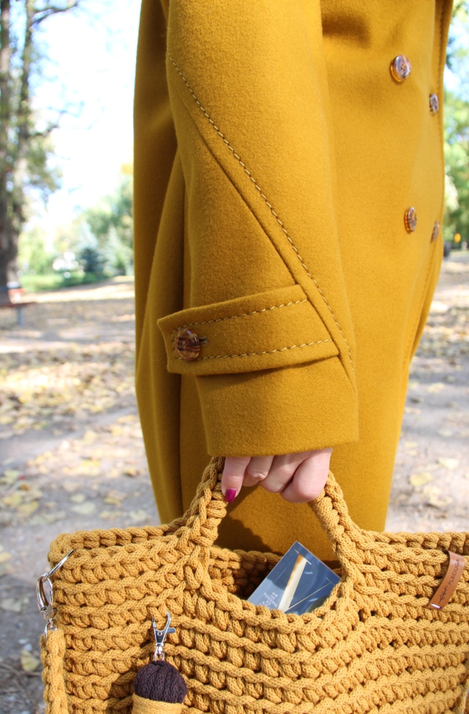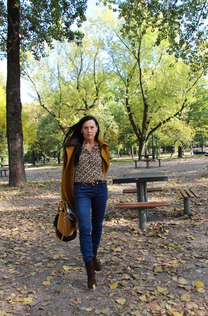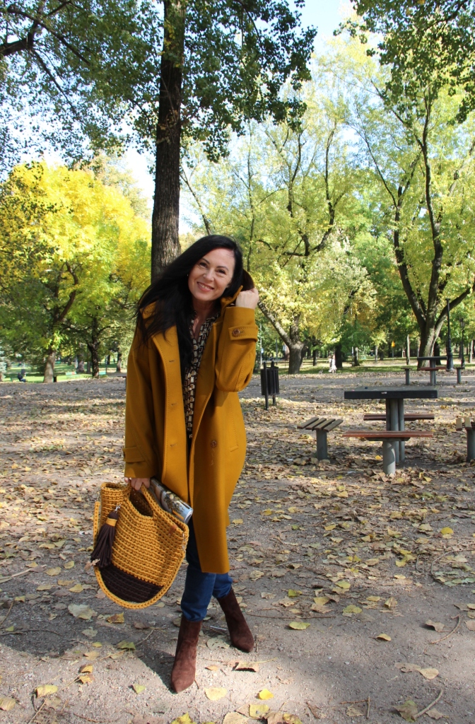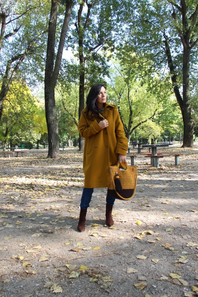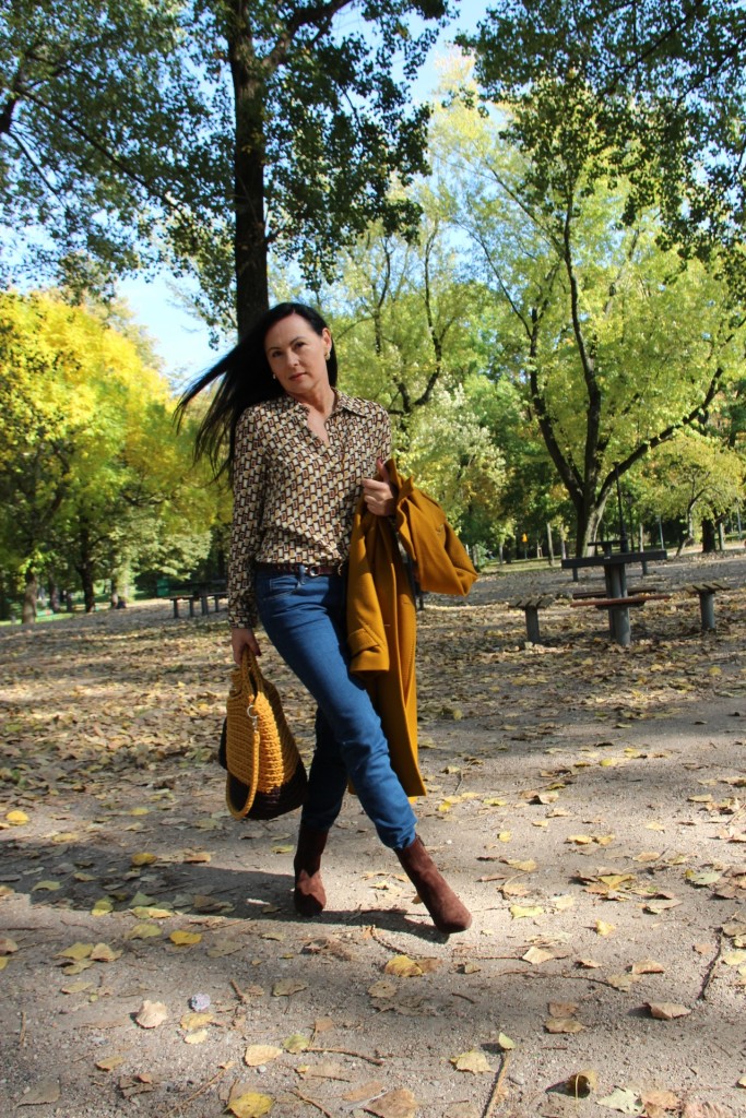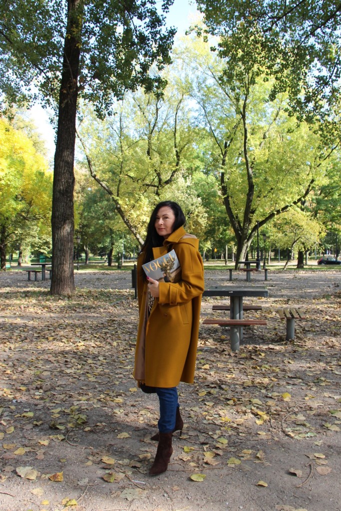 Dzisiejsza stylizacja sprawiła, że przez chwilę poczułam się jak kameleon. Torba, buty, płaszcz oraz wzorzysta koszula są w kolorach spadających liści. Największą przyjemność sprawiło mi włożenie płaszcza. To prosty model w wyjątkowym kolorze, który uwielbiam za duży kołnierz, kaptur (który jest odpinany) i piękne przeszycia. Stylizacje uzupełniają zamszowe, brązowe botki i bawełniana torba z gigantycznym chwostem oraz skórzany, pleciony pasek.