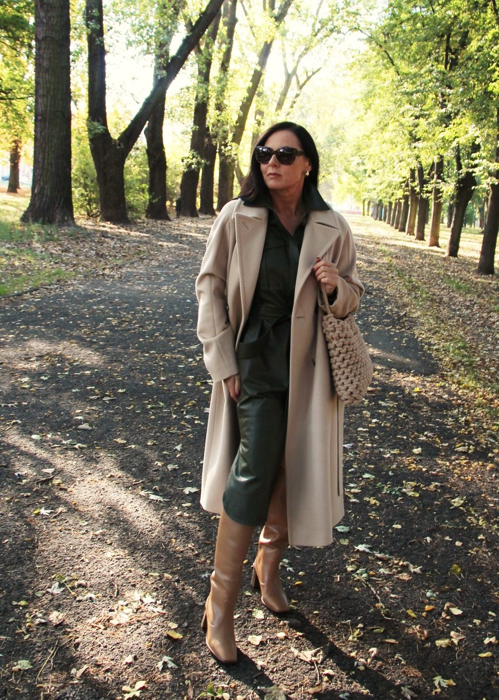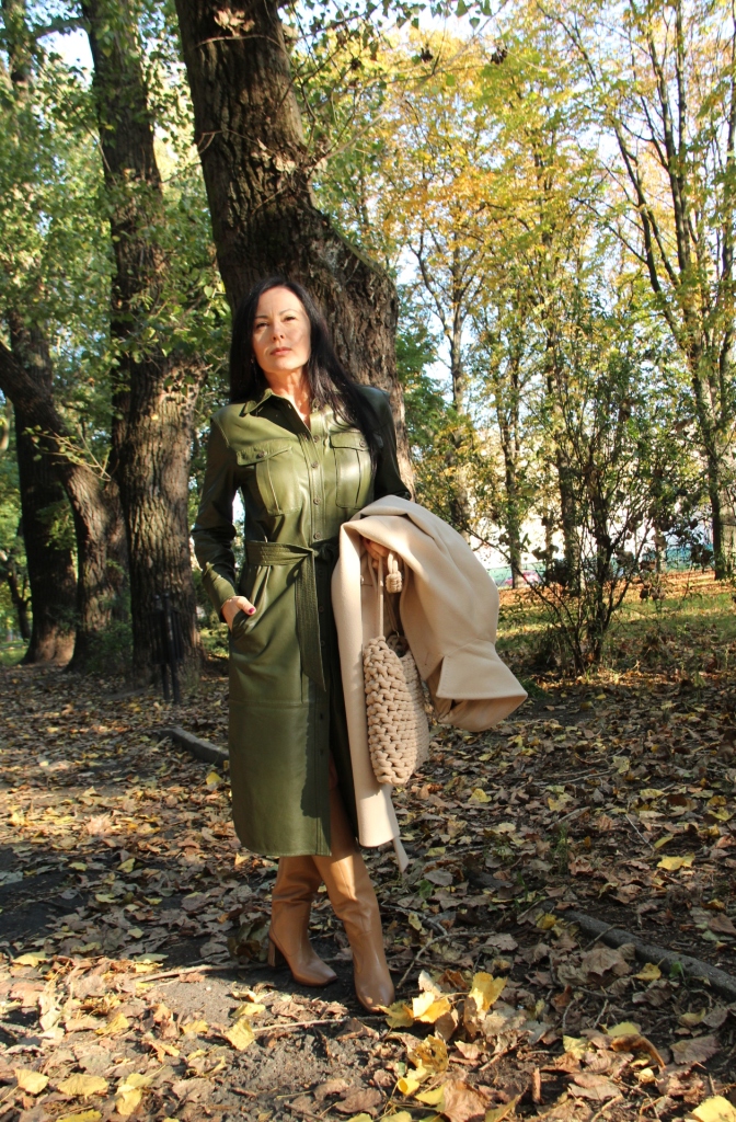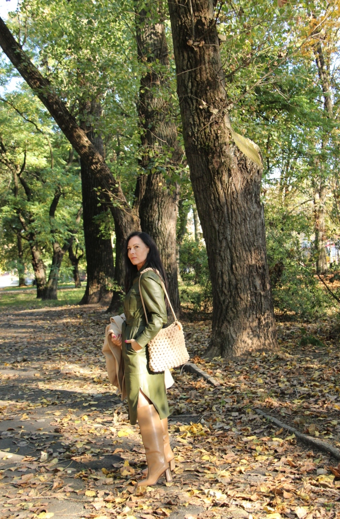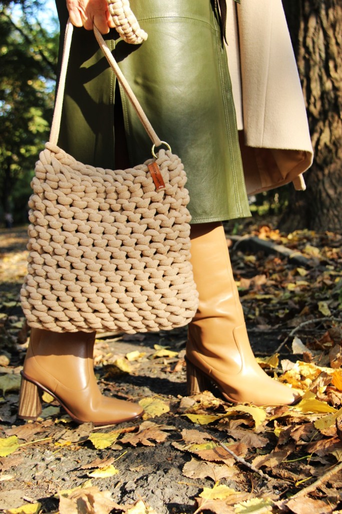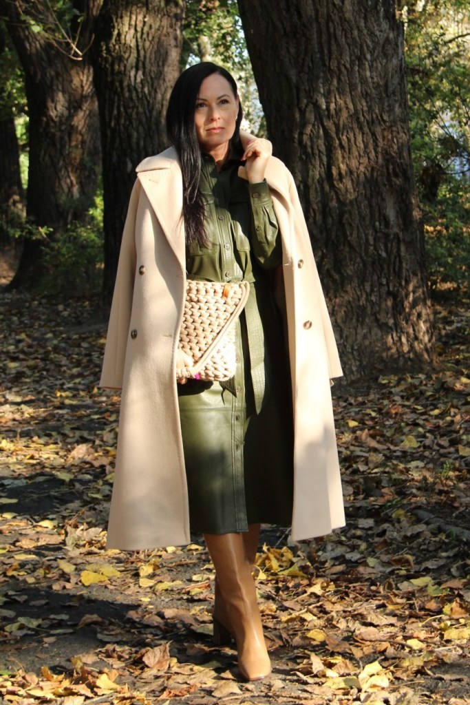W kolekcjach jesienno-zimowych 2021/22 widzimy wielki powrót ubrań wykonanych z naturalnej skóry. Ja, ostatnio mam słabość do zieleni, więc nie mogłam sobie odmówić skórzanej szmizjerki w tym właśnie kolorze. Dla kontrastu z sukienką, wybrałam jasny płaszcz. Najwyższej jakości włoska wełna i klasyczny fason, gwarantują , że będzie mi służył przez wiele sezonów. Mówi się, że diabeł tkwi w szczegółach, więc pojawiły się detale, które wzbogaciły moją klasyczną stylizację. Kozaki z wysoką cholewką, wykonane z gładkiej, karmelowej skóry wyróżniają takie smaczki, jak kwadratowe noski i klockowaty obcas z efektem drewna. Zerkając na kolekcję takich projektantów jak Dolce & Gabbana, Oscar De La Renta, Chloé niewiele trzeba, by przekonać się do dzianiny, także w dodatkach. Mnie przekonują, więc tym razem zamiast skórzanej torby wybrałam torbę z miękkiego bawełnianego sznurka, którą mogę do siebie przytulić. Tę ręcznie plecioną torbę o wdzięcznej nazwie ,,Sójka” zdobi złota nitka. Pasek wykończony został węzłami w technice makramy. Dodatki to małe złote kolczyki i ciemne okulary.