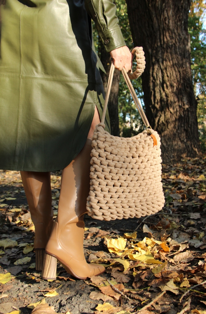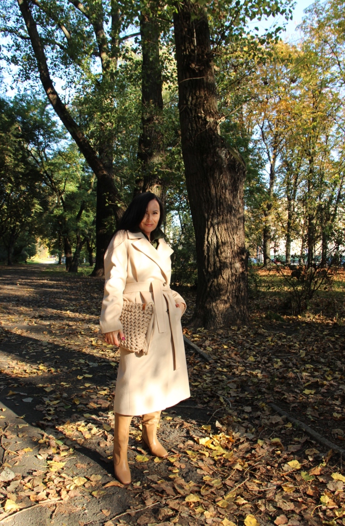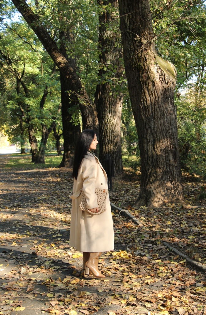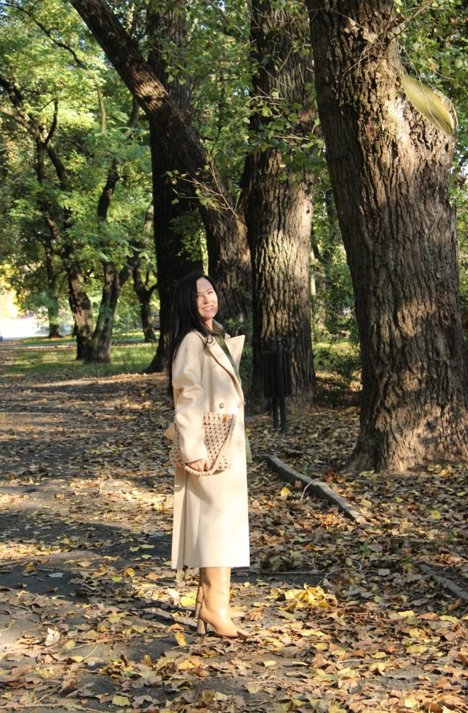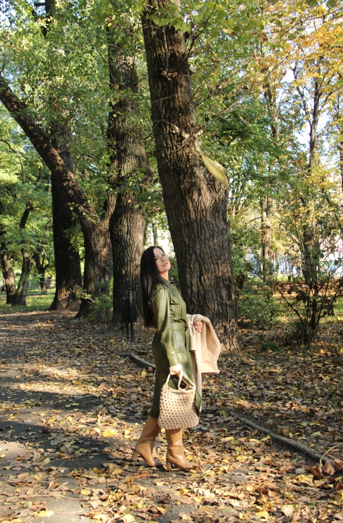 W kolekcjach jesienno-zimowych 2021/22 widzimy wielki powrót ubrań wykonanych z naturalnej skóry. Ja, ostatnio mam słabość do zieleni, więc nie mogłam sobie odmówić skórzanej szmizjerki w tym właśnie kolorze. Dla kontrastu z sukienką, wybrałam jasny płaszcz. Najwyższej jakości włoska wełna i klasyczny fason, gwarantują , że będzie mi służył przez wiele sezonów. Mówi się, że diabeł tkwi w szczegółach, więc pojawiły się detale, które wzbogaciły moją klasyczną stylizację. Kozaki z wysoką cholewką, wykonane z gładkiej, karmelowej skóry wyróżniają takie smaczki, jak kwadratowe noski i klockowaty obcas z efektem drewna. Zerkając na kolekcję takich projektantów jak Dolce & Gabbana, Oscar De La Renta, Chloé niewiele trzeba, by przekonać się do dzianiny, także w dodatkach. Mnie przekonują, więc tym razem zamiast skórzanej torby wybrałam torbę z miękkiego bawełnianego sznurka, którą mogę do siebie przytulić. Tę ręcznie plecioną torbę o wdzięcznej nazwie ,,Sójka” zdobi złota nitka. Pasek wykończony został węzłami w technice makramy. Dodatki to małe złote kolczyki i ciemne okulary.