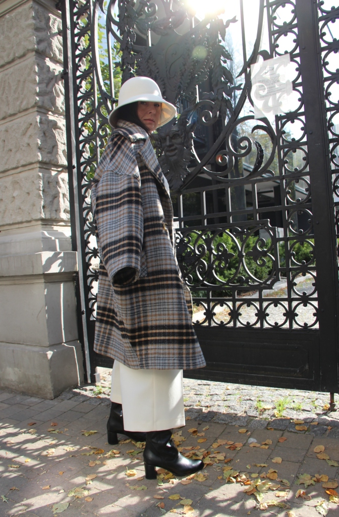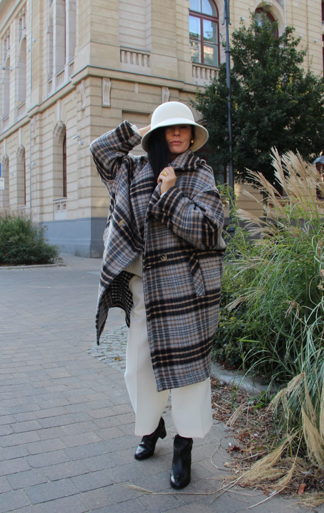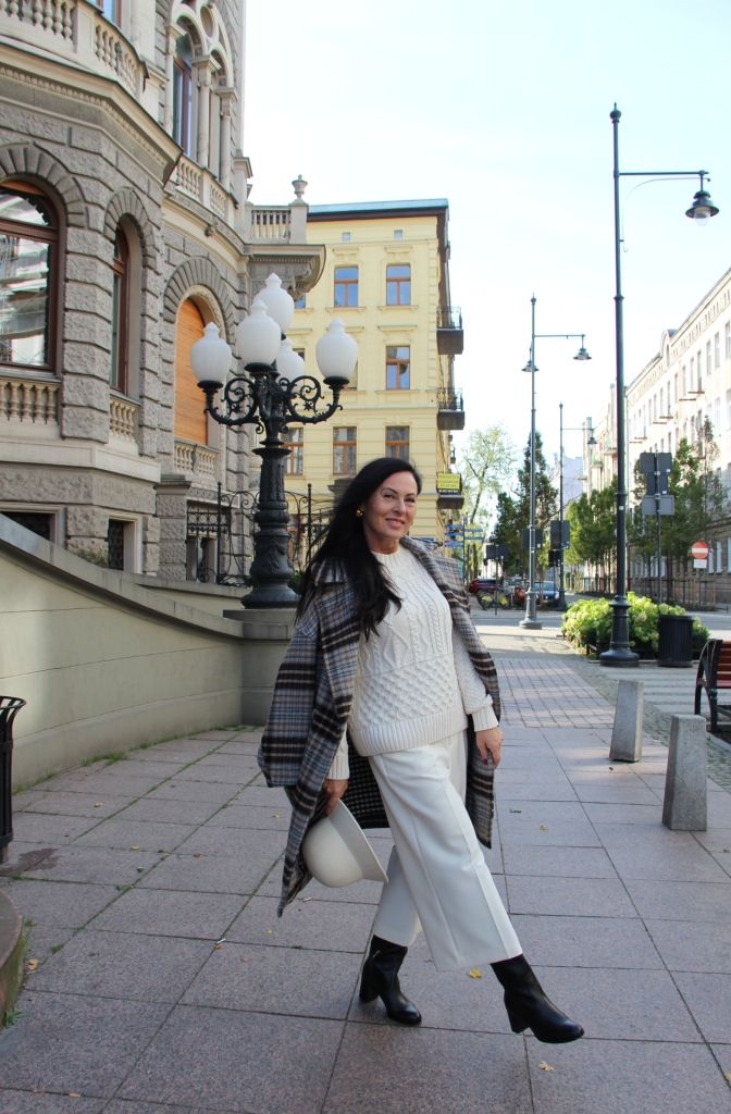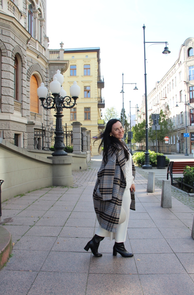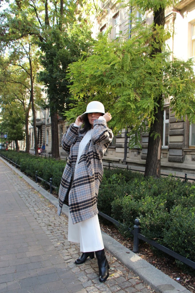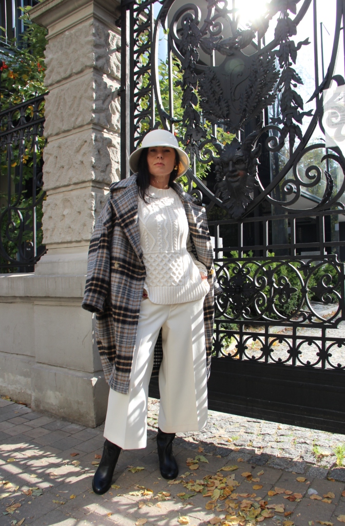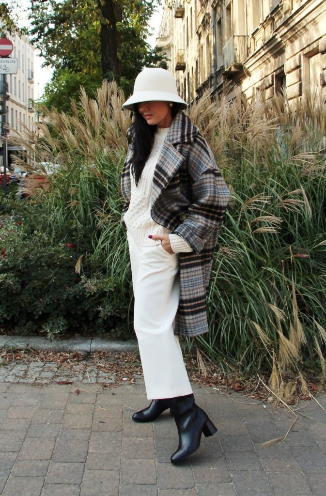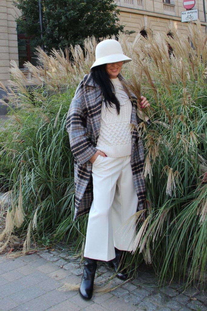 Czy krata jest modna ? O tak ! To print, który jesienią powraca jak bumerang. Płaszcz w jednym kolorze wybieram o prostym klasycznym kroju, a jeśli chodzi o kratę musi być szaleństwo i swoboda. Coco Chanel powiedziała – ,,Luksus musi być wygodny, inaczej nie jest luksusem” i ja zgadzam sie z tym w 100 procentach. Płaszcz, który wybrałam otula niczym kocyk i o takim otuleniu myślałam także, wybierając sweter. W tym sezonie mamy wielki powrót dużych swetrów w wzór warkoczy, a ja mam do nich szczególna słabość. Zawsze wybieram model w naturalnym kolorze wełny. By rozjaśnić stylizacje, w tym samym kolorze wybrałam kapelusz i spodnie. Dla kontrastu włożyłam czarne kozaki na obcasie z wysoką cholewką, które pięknie korespondują z kratą na płaszczu. Dodatki to małe, złote kolczyki i złoty ażurowy pierścionek.