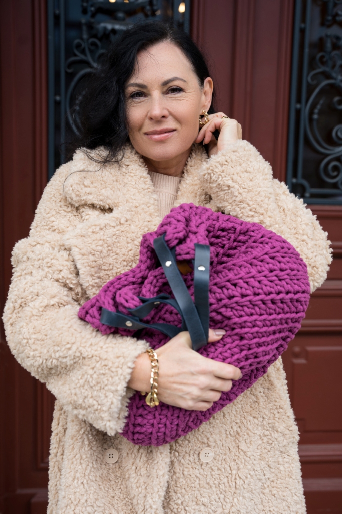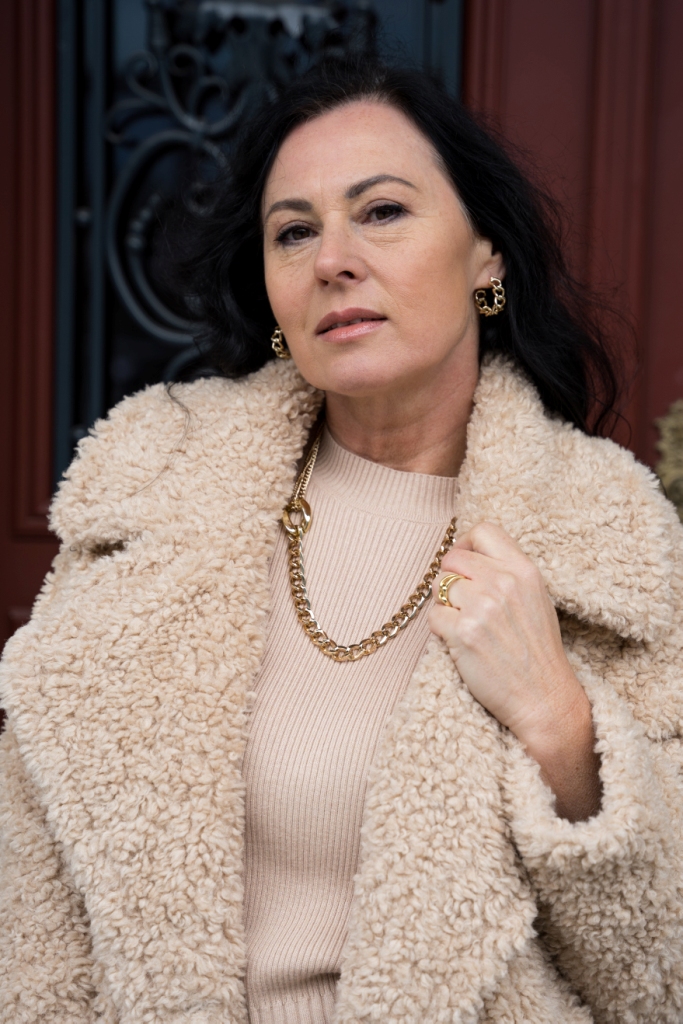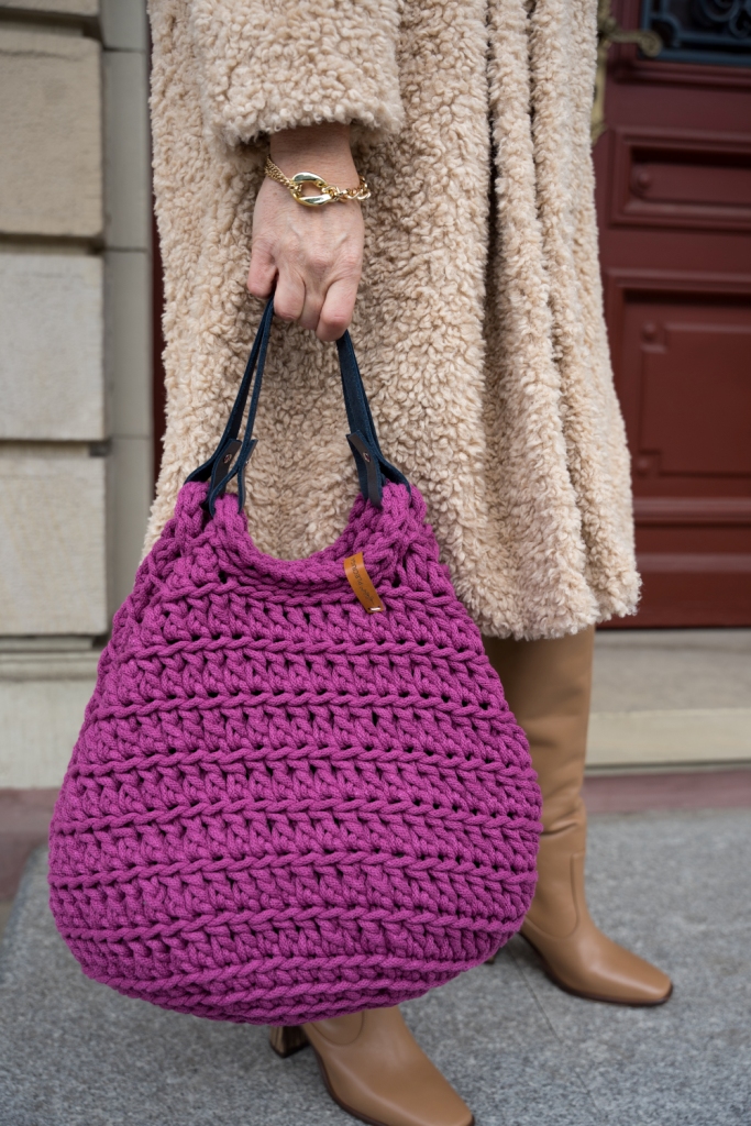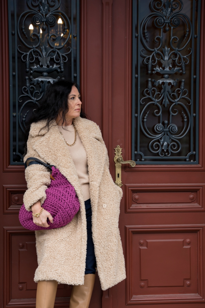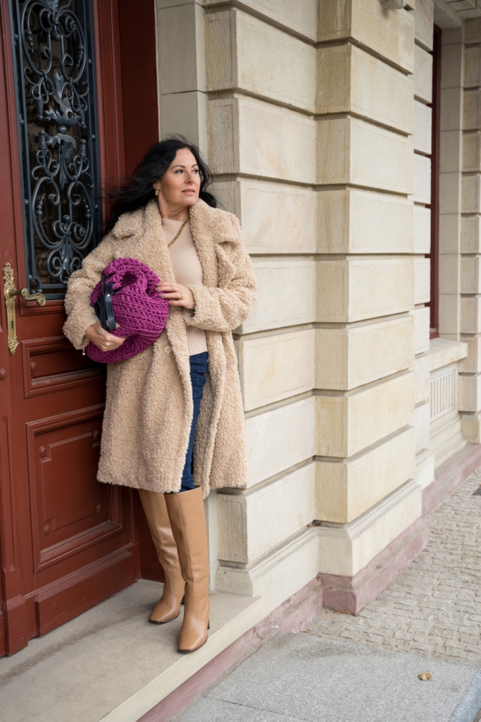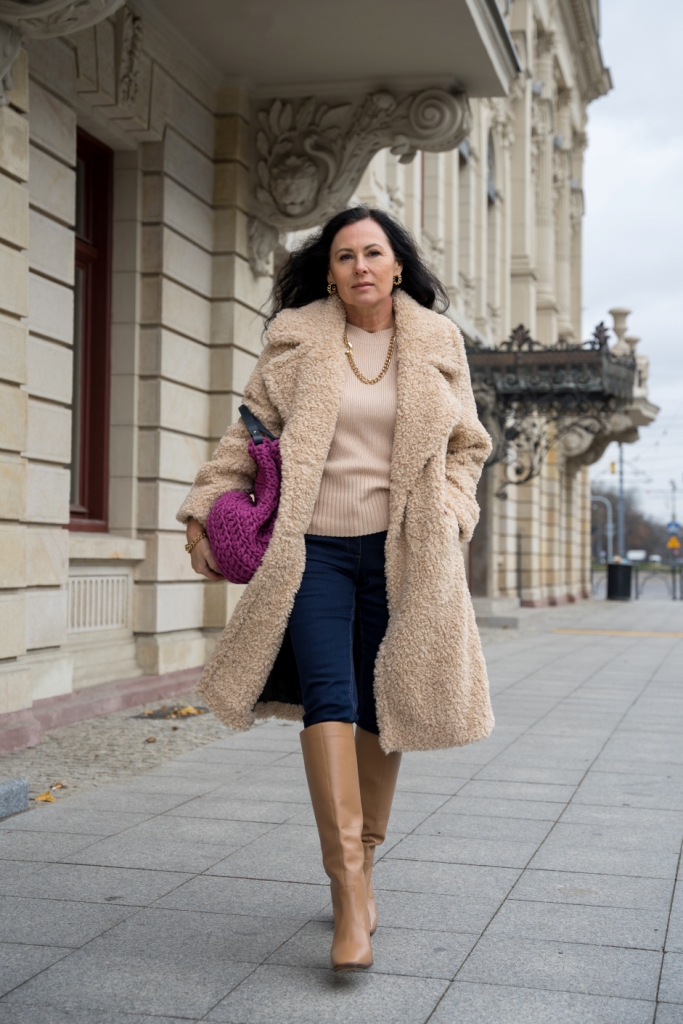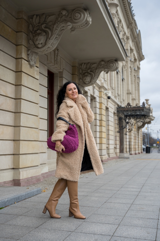 Na czym polega wyjątkowość płaszcza teddy bear? Wiadomo, że kojarzy się z pluszową maskotką, ale czy właśnie dlatego chętniej po niego sięgamy ? Myślę, że kobiety skrycie kochają futra i wcale nie muszą to być naturalne futra. Dla mnie płaszcz teddy bear to przede wszystkim wygoda. Miękki, lekki, pasuje do każdej stylizacji i można go zacząć nosić już wczesną jesienią. Wybrałam model w kolorze biszkoptowym, bo jak teddy bear, to musi być słodki. Włożyłam go na dzianinową bluzkę z bufkami w tym samym kolorze i ciemne jeansy ze złotymi ozdobami przy kieszonkach. Szyku i jeszcze większej słodyczy dodały mi kozaki z wysoką cholewką w karmelowym kolorze i olbrzymia, malinowa torba. Ta ręcznie robiona torba o pięknym splocie, nadaje stylizacji jesiennego charakteru, niczym zwinięty, wielki szal. Do delikatnych beży pięknie pasuje złota biżuteria. Zgodnie z trendami postawiłam na łańcuchy o różnej wielkości ogniwach.