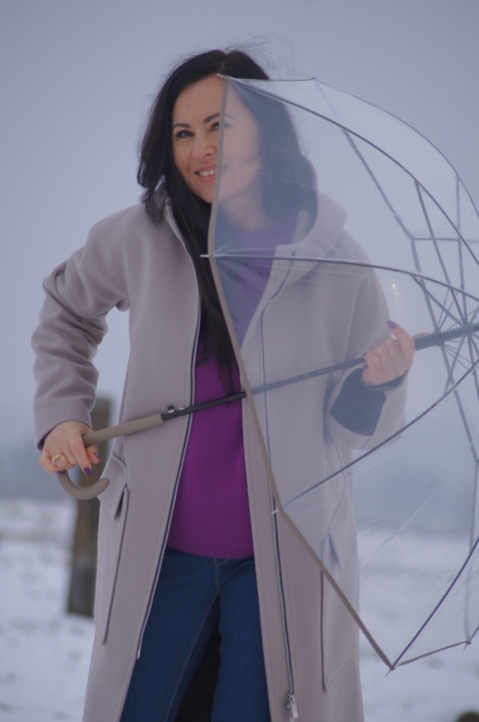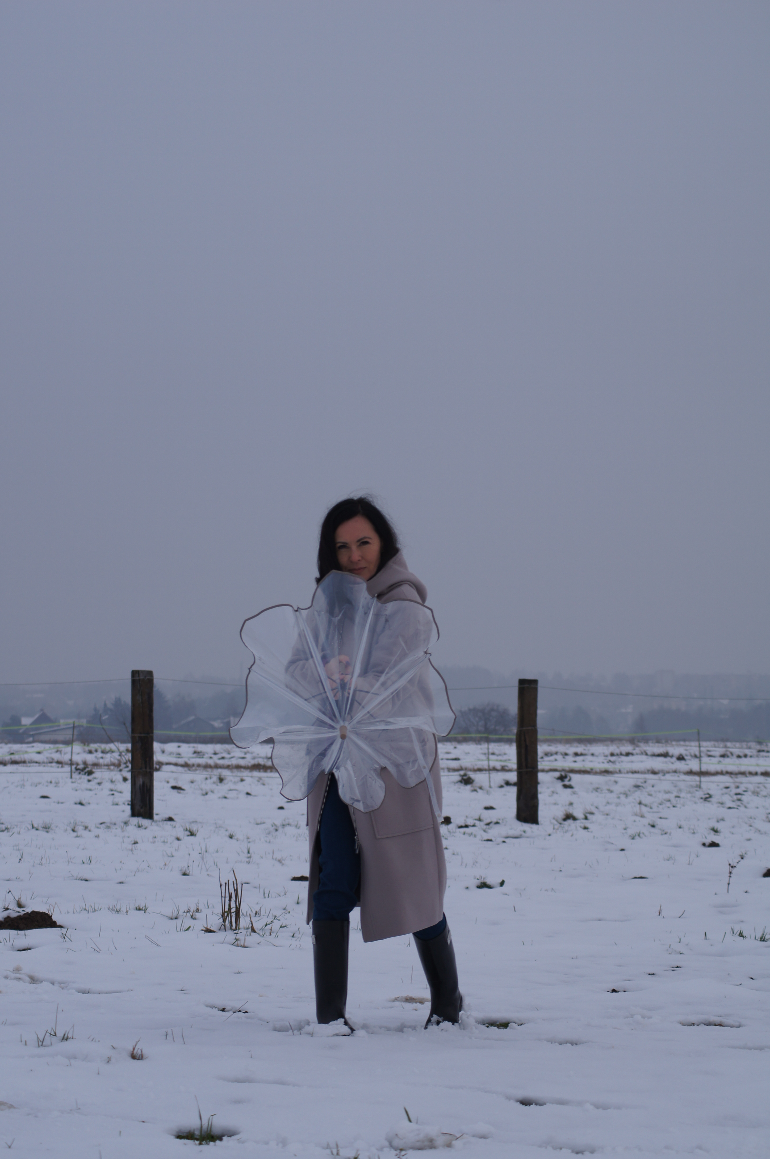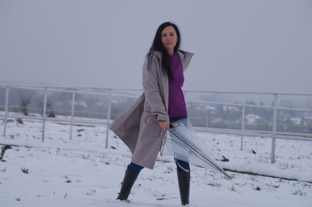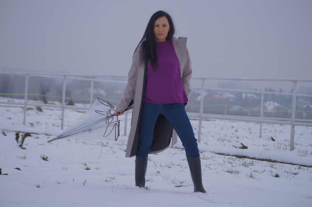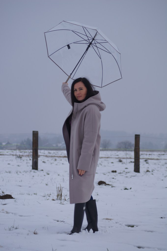 Wybierając weekendową stylizację z pewnością myślisz o wygodzie, ja myślę – sportowa elegancja, bo gdy podoba mi się look, to mimo niesprzyjającej aury jest jakoś piękniej. Mówi się, że nie ma złej pogody, jeśli jesteśmy właściwie ubrani. Wybrałam więc kalosze i parasol, który pozwala podziwiać widoki, jaensy i sweter w intensywnym kolorze. Zamiast kurtki, wełniany płaszcz o sportowym charakterze, zapinany na zamek błyskawiczny z kapturem i dużymi kieszeniami.