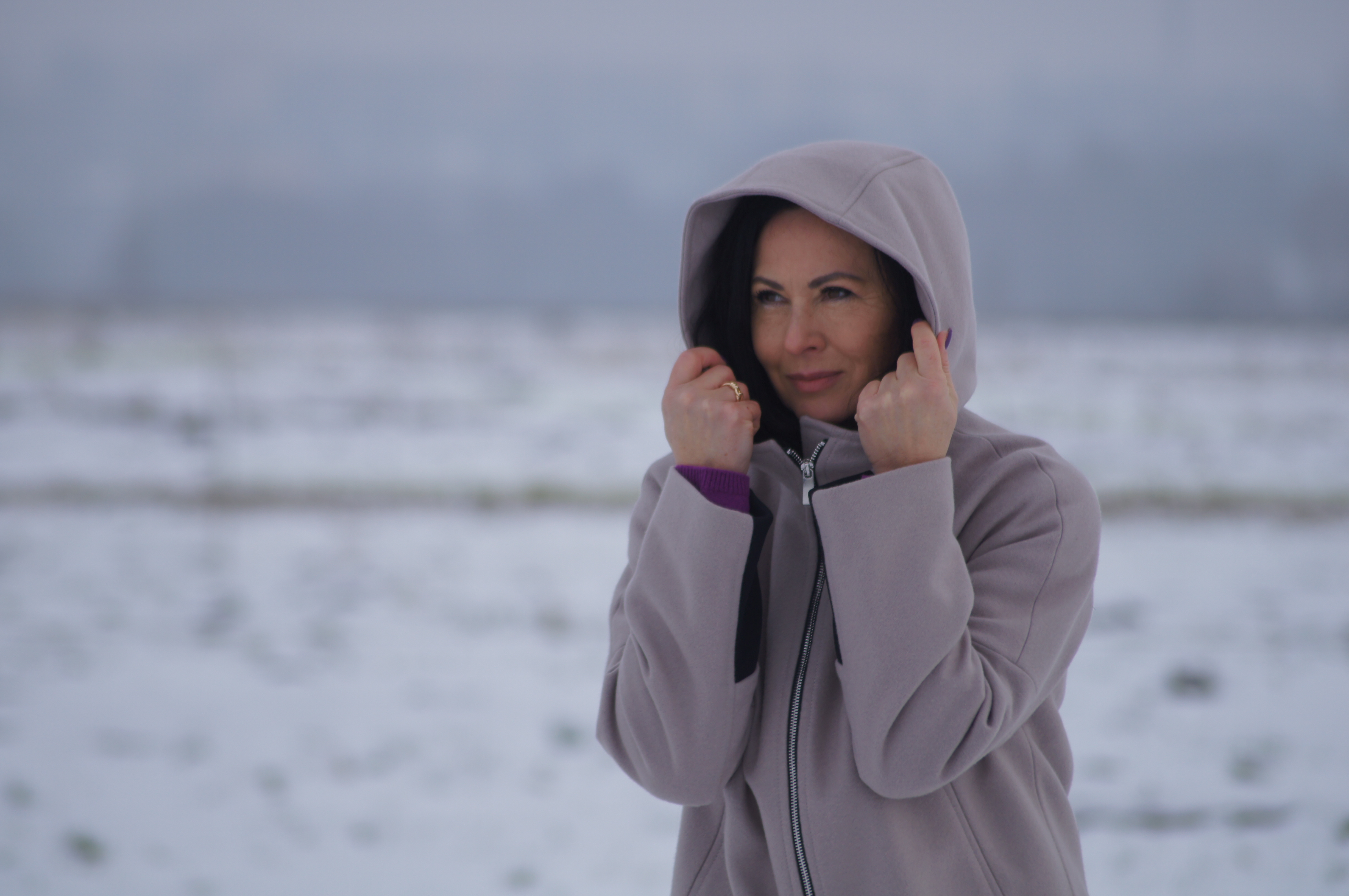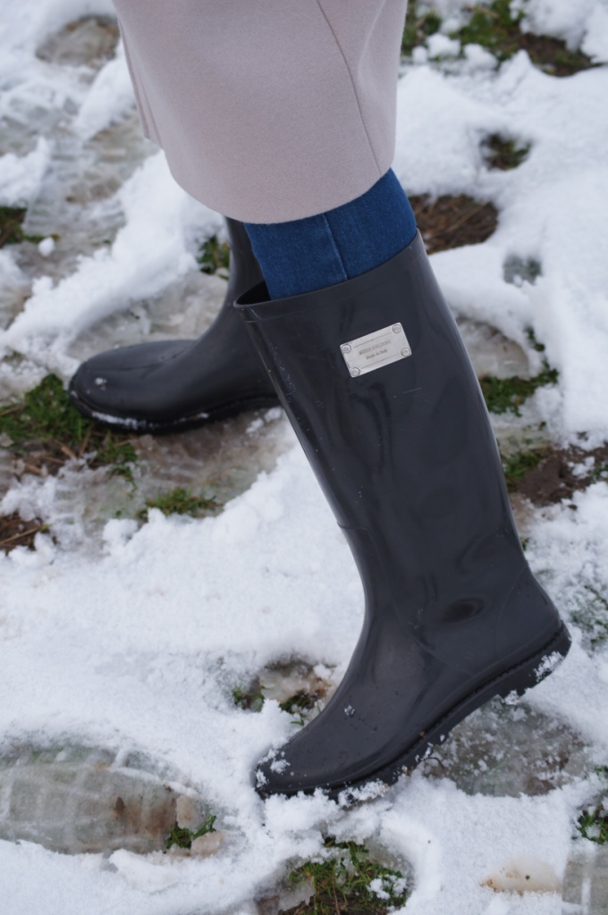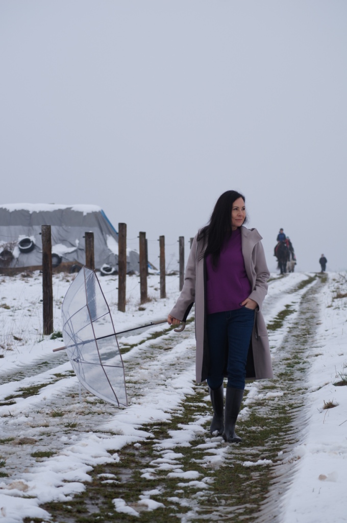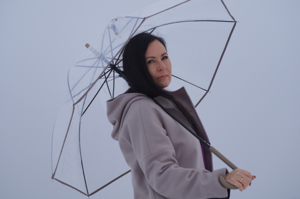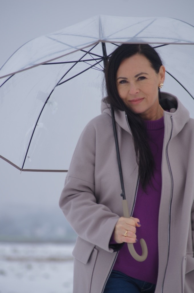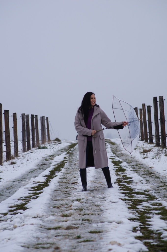 Wybierając weekendową stylizację z pewnością myślisz o wygodzie, ja myślę – sportowa elegancja, bo gdy podoba mi się look, to mimo niesprzyjającej aury jest jakoś piękniej. Mówi się, że nie ma złej pogody, jeśli jesteśmy właściwie ubrani. Wybrałam więc kalosze i parasol, który pozwala podziwiać widoki, jaensy i sweter w intensywnym kolorze. Zamiast kurtki, wełniany płaszcz o sportowym charakterze, zapinany na zamek błyskawiczny z kapturem i dużymi kieszeniami.