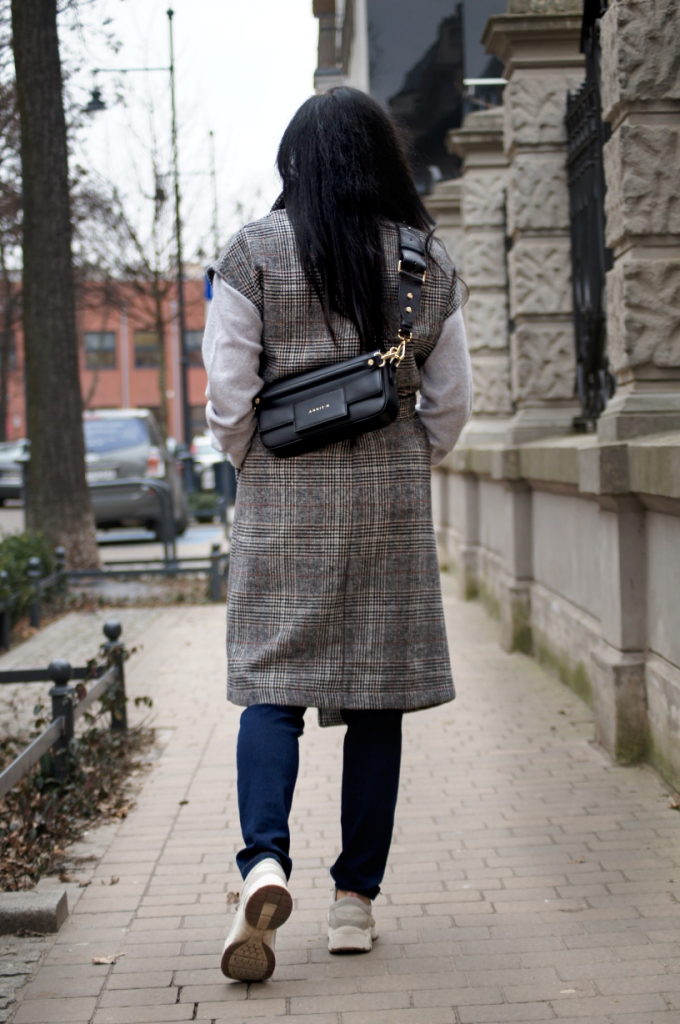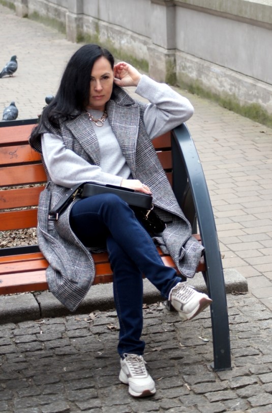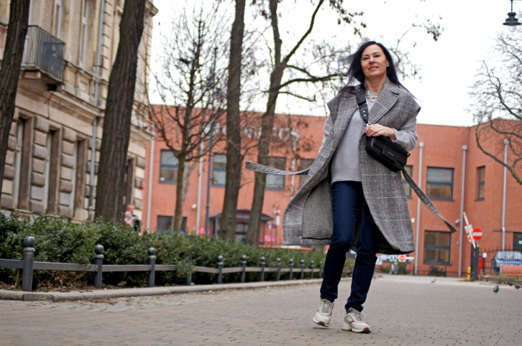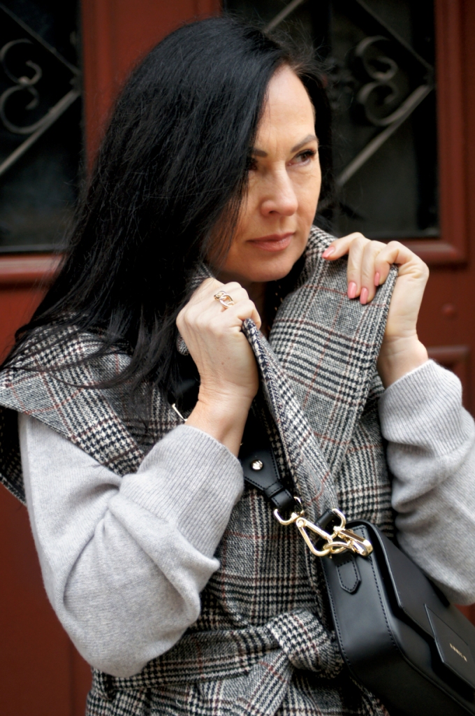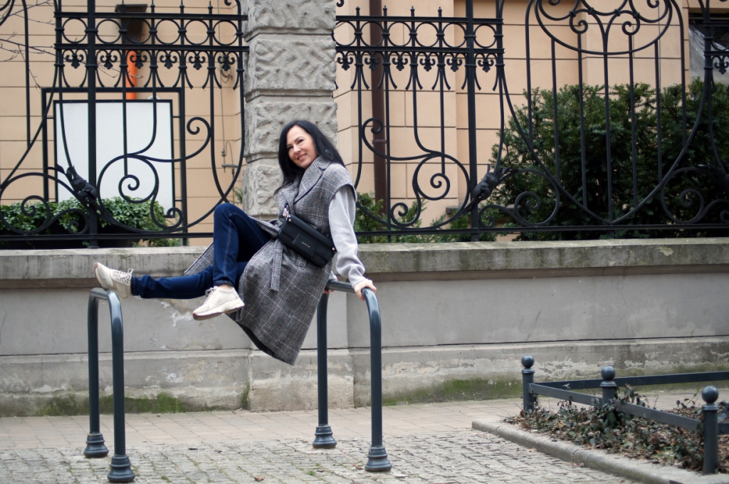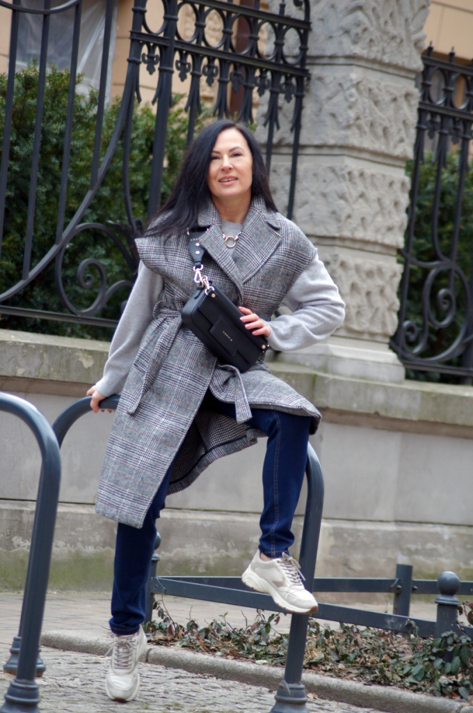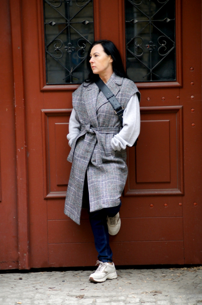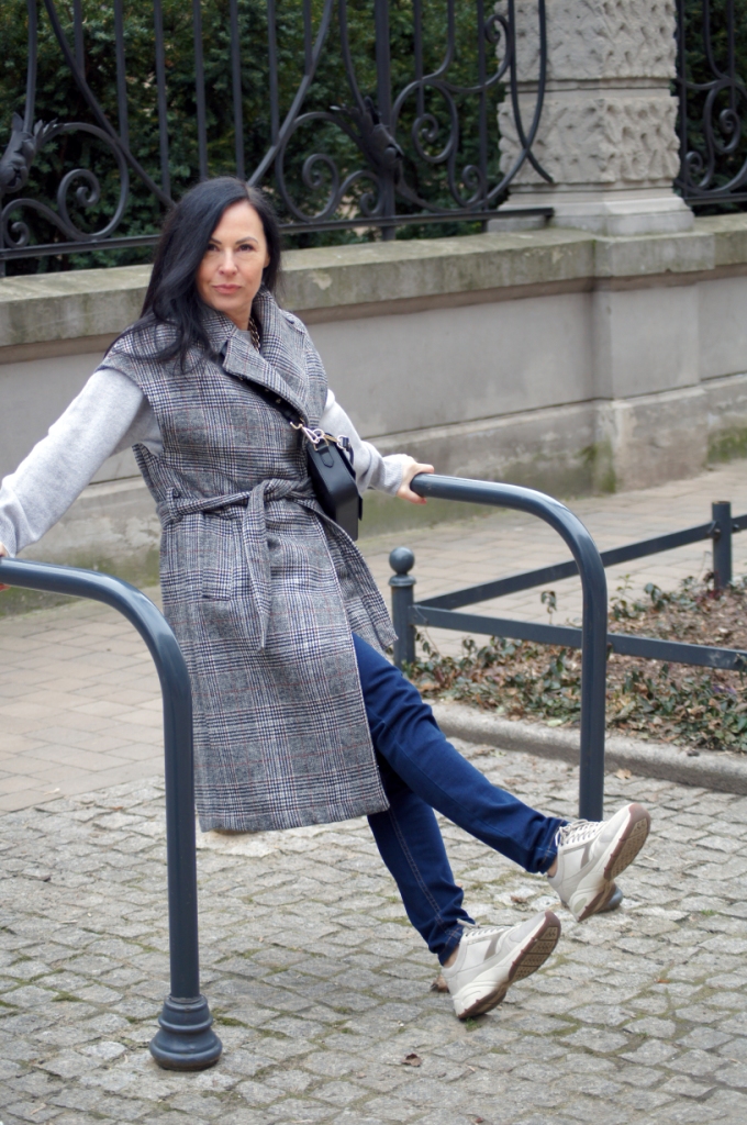 Płaszcz bez rękawów to propozycja dla kobiet, które uwielbiają bezrękawniki, a jednocześnie chcą wyglądać stylowo. W chłodne dni jak dziś zakładam go na ramoneskę lub sweter, jednak naprawdę zabójczo wygląda na białej koszuli. Mój kaszmirowy, szary sweter i granatowe jeansy to ponadczasowy zestaw, który jest świetnym tłem dla kraciastego płaszcza. Wiedząc, że dzień będzie bardzo aktywny, wybrałam sportowe buty i torbę cross-body.