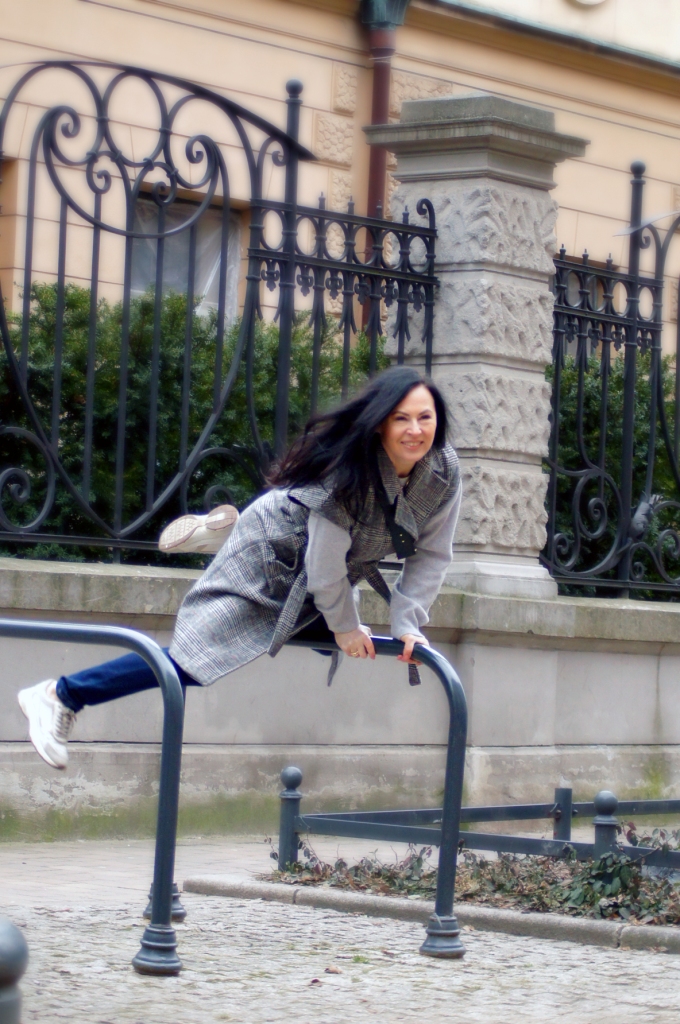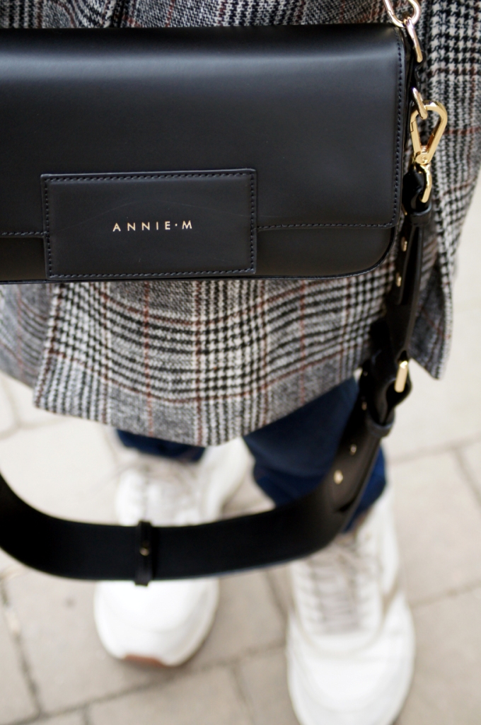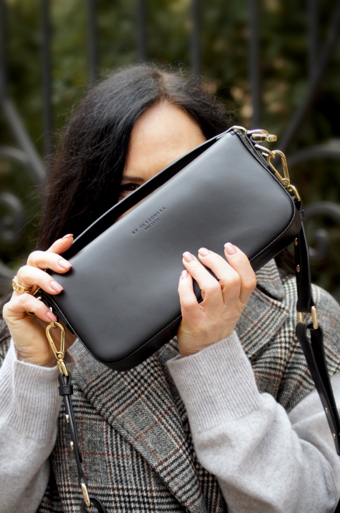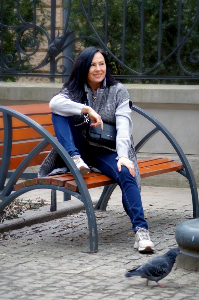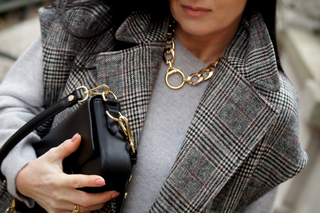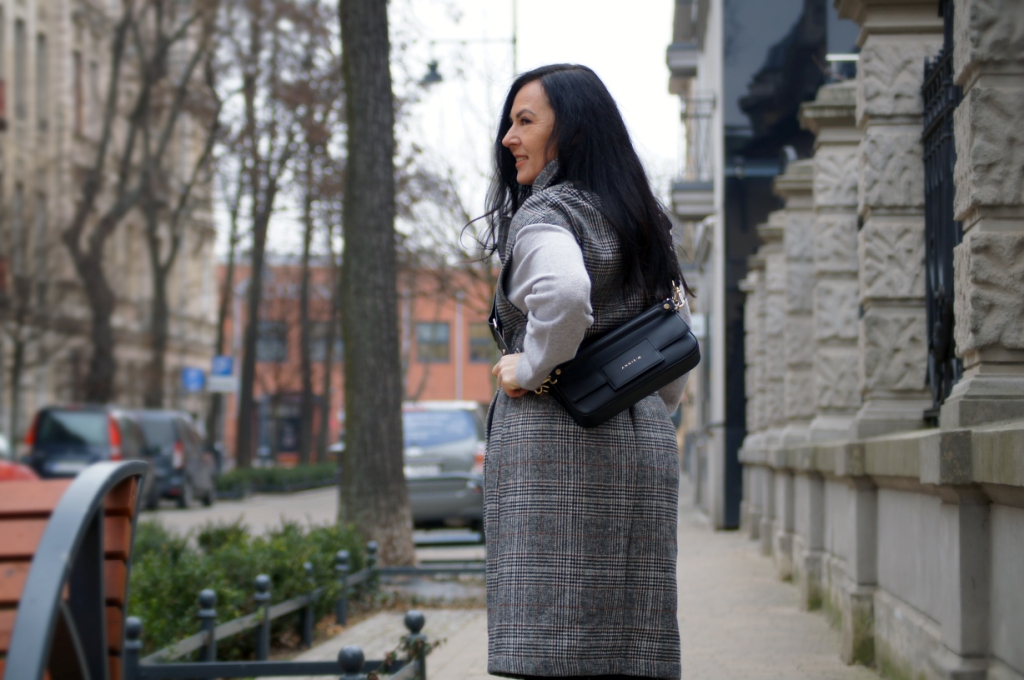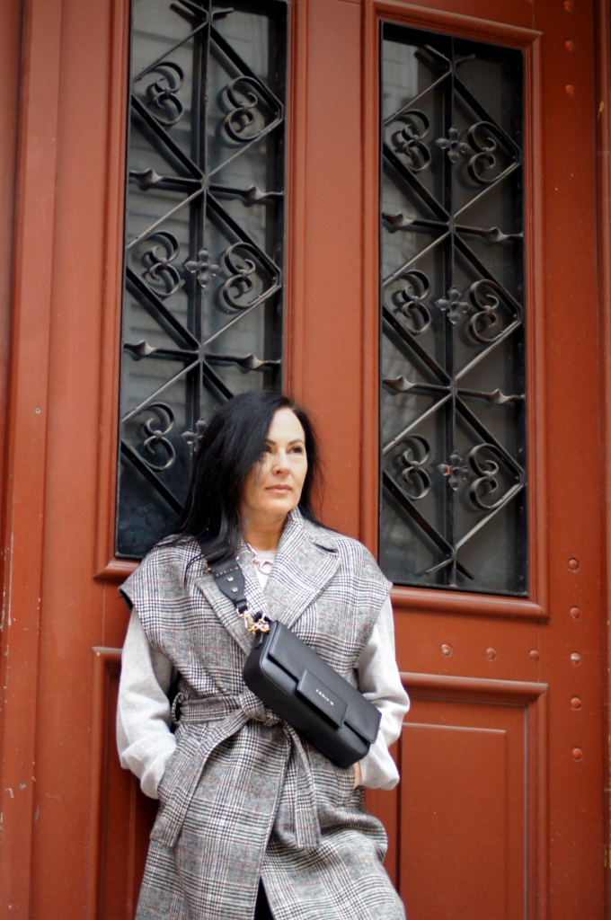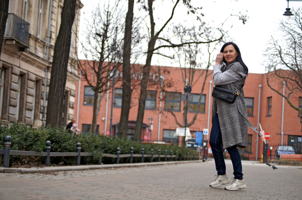 Płaszcz bez rękawów to propozycja dla kobiet, które uwielbiają bezrękawniki, a jednocześnie chcą wyglądać stylowo. W chłodne dni jak dziś zakładam go na ramoneskę lub sweter, jednak naprawdę zabójczo wygląda na białej koszuli. Mój kaszmirowy, szary sweter i granatowe jeansy to ponadczasowy zestaw, który jest świetnym tłem dla kraciastego płaszcza. Wiedząc, że dzień będzie bardzo aktywny, wybrałam sportowe buty i torbę cross-body.