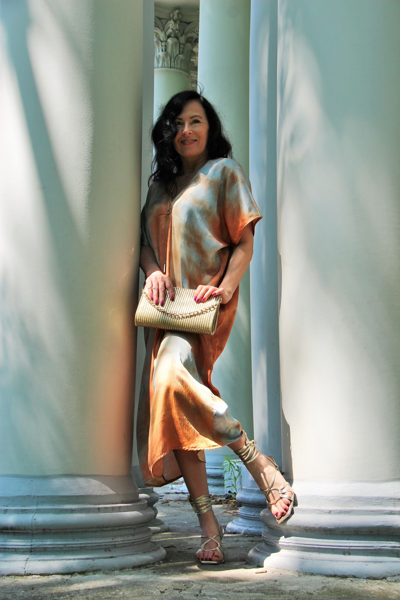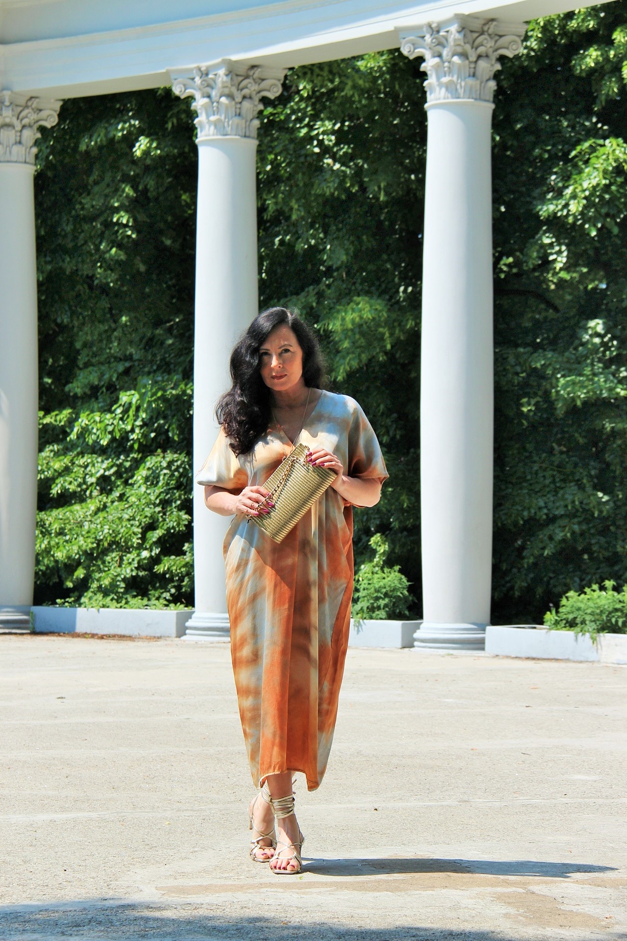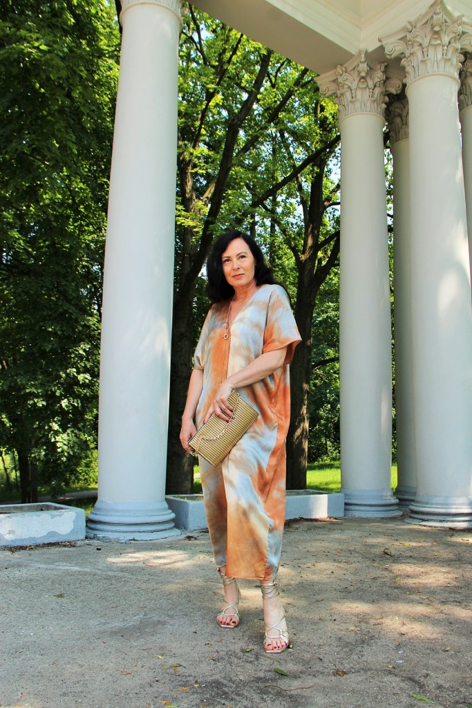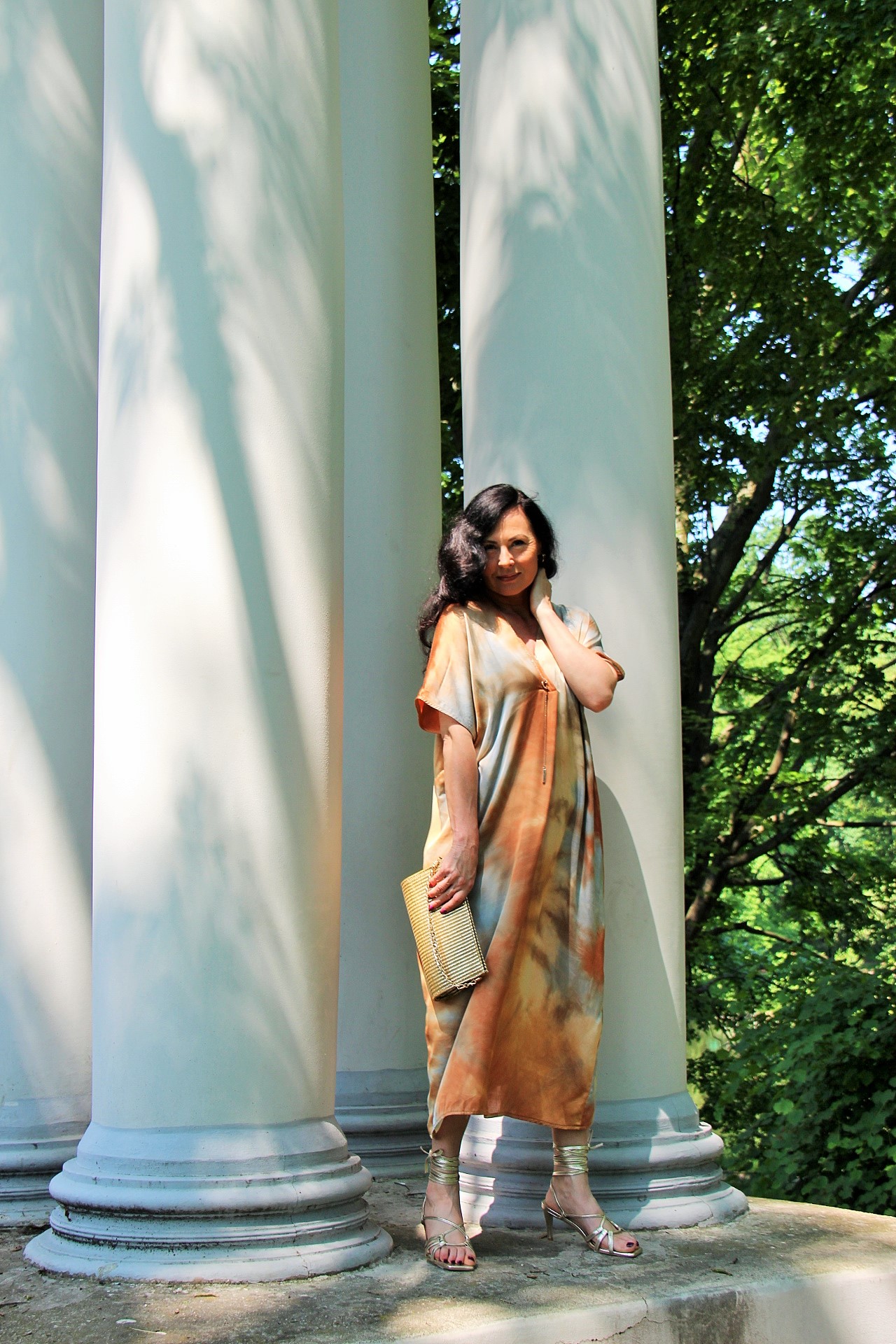 Sukienka w kolorach marmuru, to propozycja na letnie przyjęcie. Prosty fason i przewiewny materiał dają poczucie komfortu w upalne dni. Bosko pasują do niej złote i jednocześnie lekkie dodatki. Wybrałam złote sandały na obcasie wiązane w kostce i złotą kopertówkę z trawy morskiej.