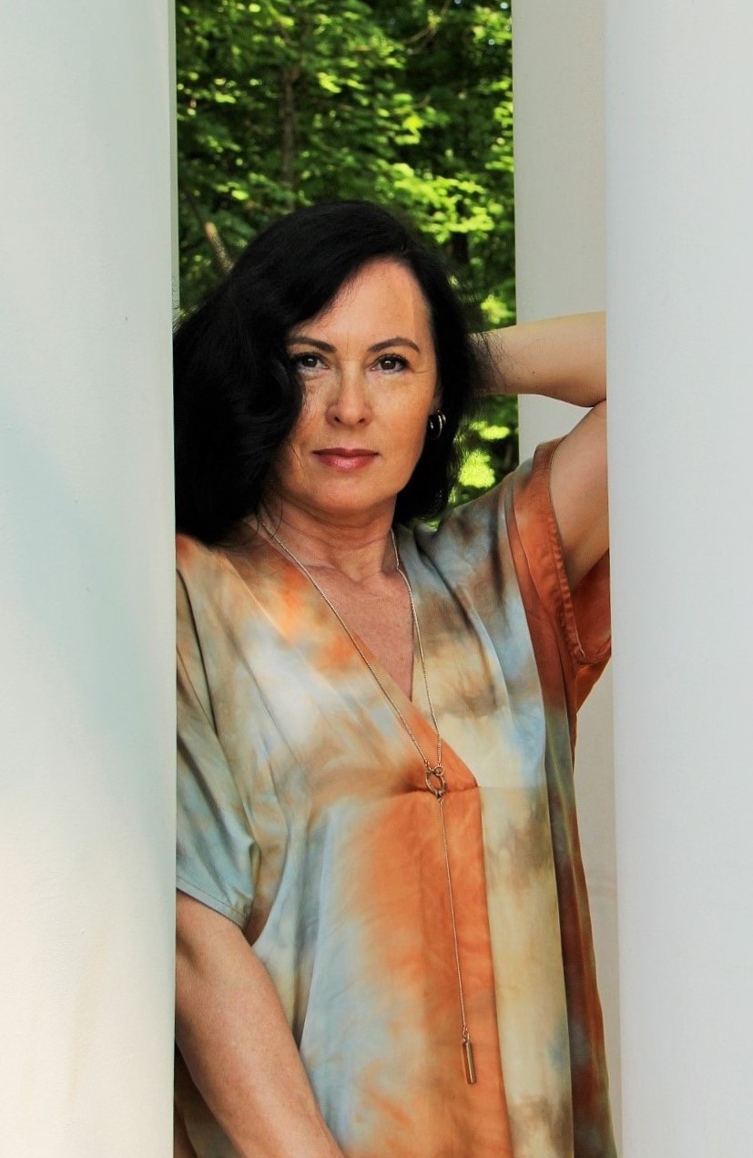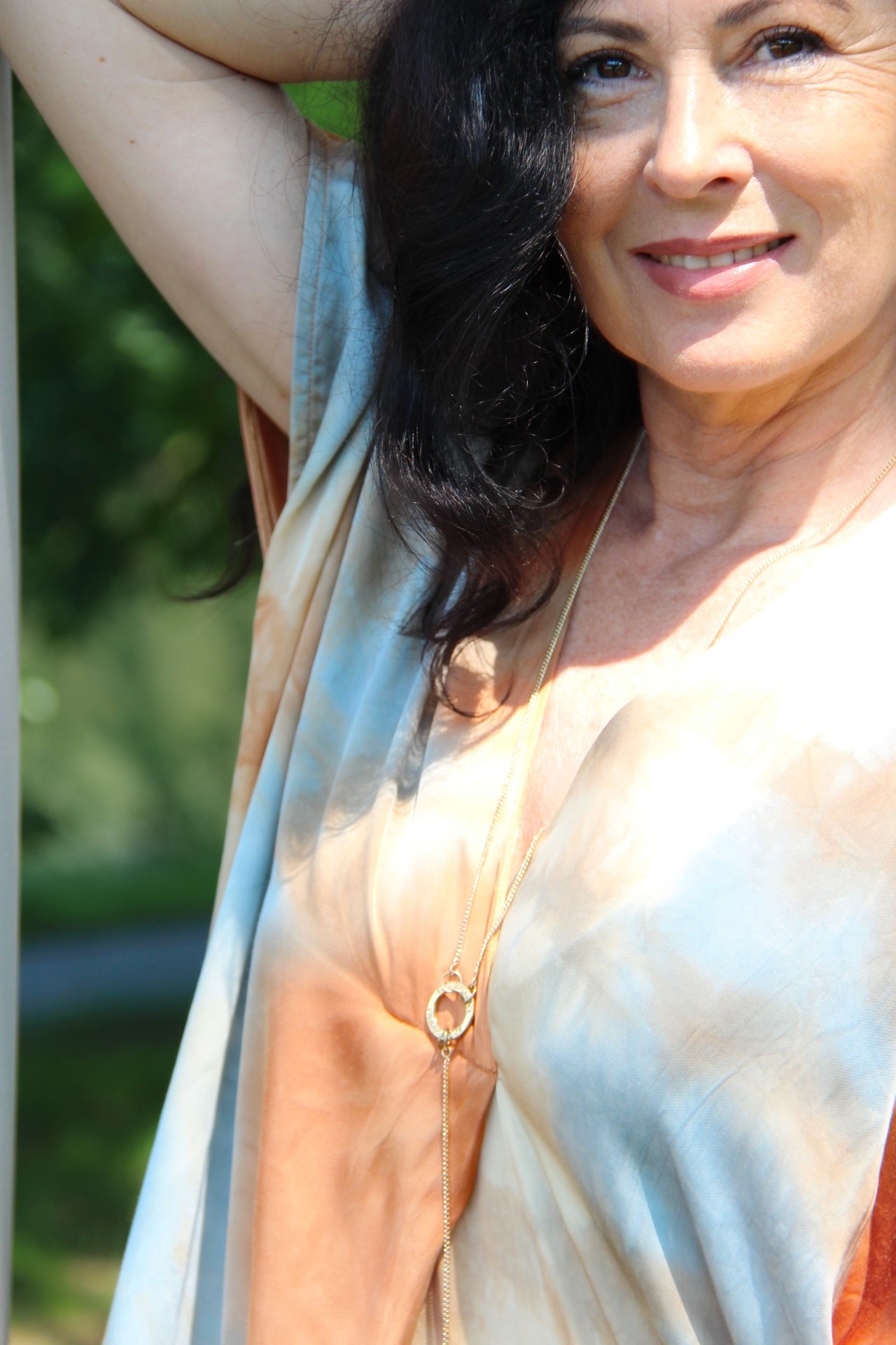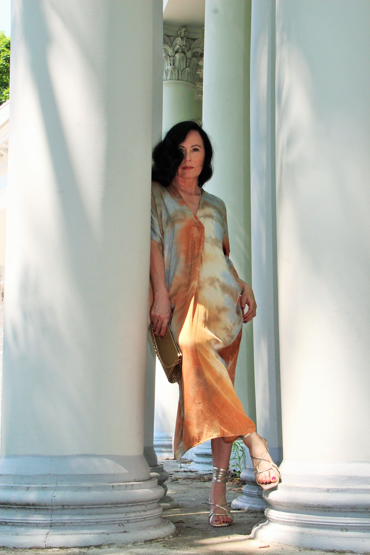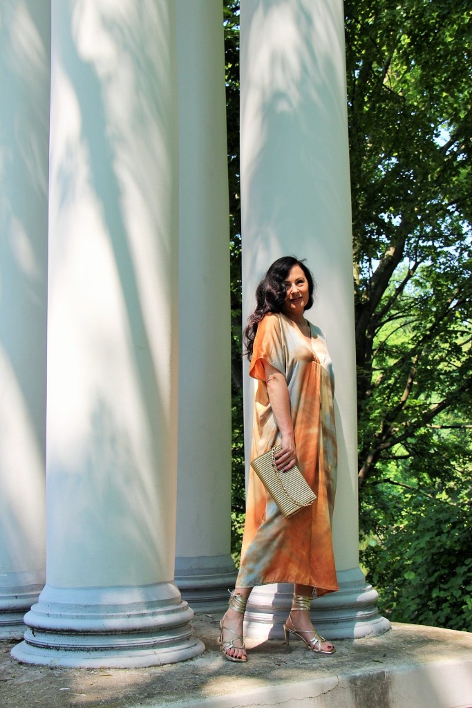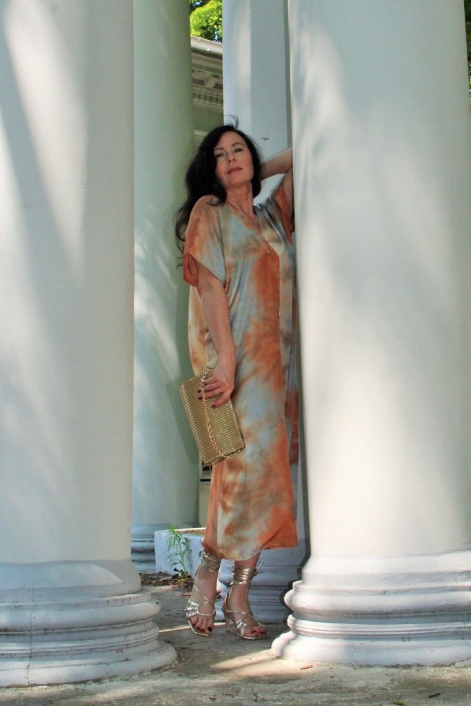 Sukienka w kolorach marmuru, to propozycja na letnie przyjęcie. Prosty fason i przewiewny materiał dają poczucie komfortu w upalne dni. Bosko pasują do niej złote i jednocześnie lekkie dodatki. Wybrałam złote sandały na obcasie wiązane w kostce i złotą kopertówkę z trawy morskiej.