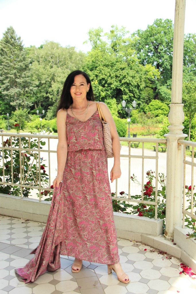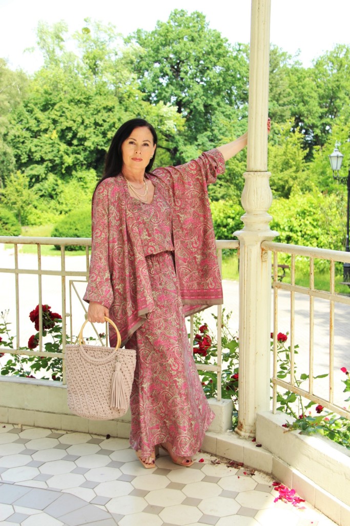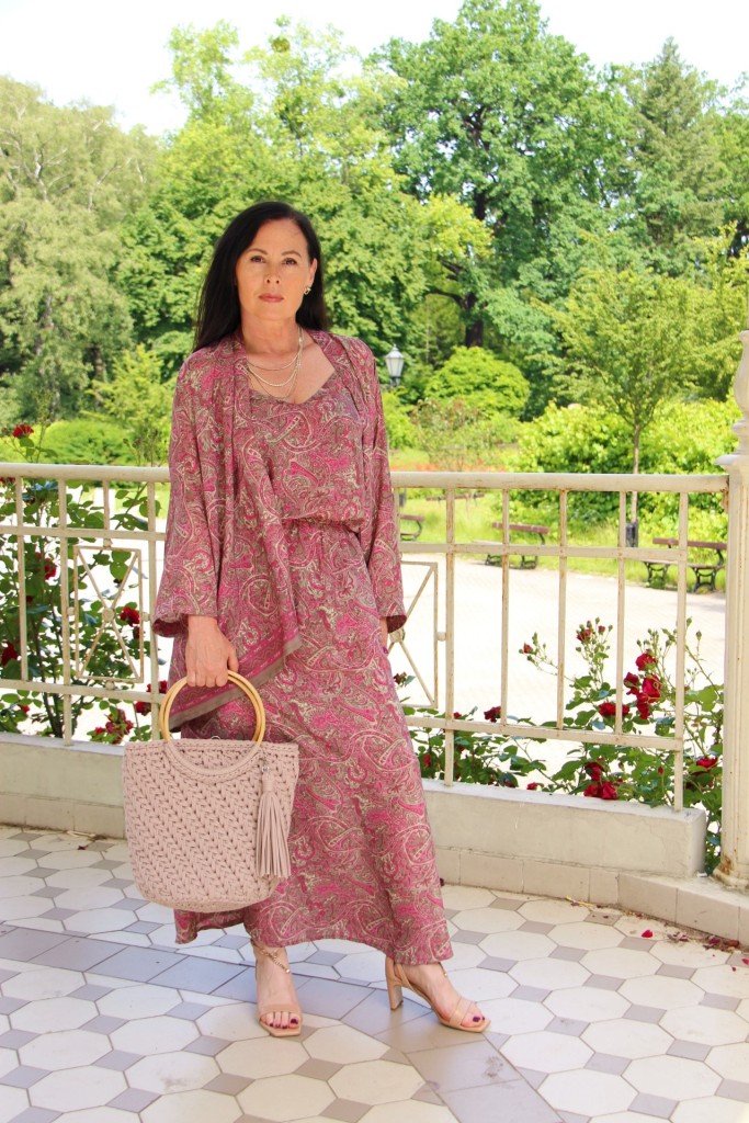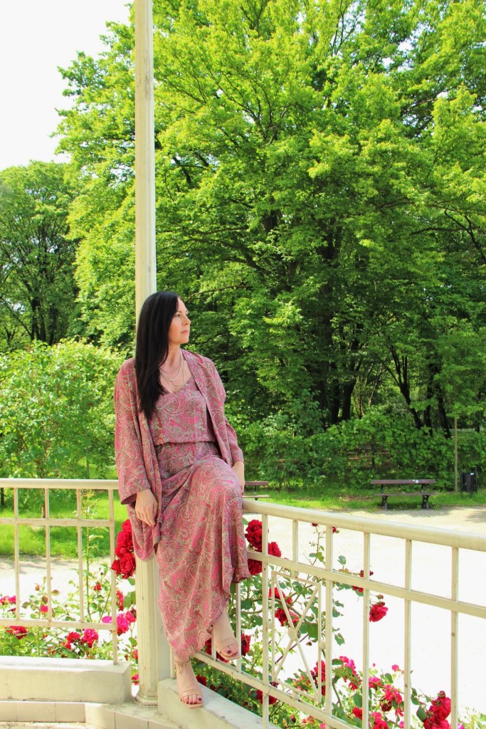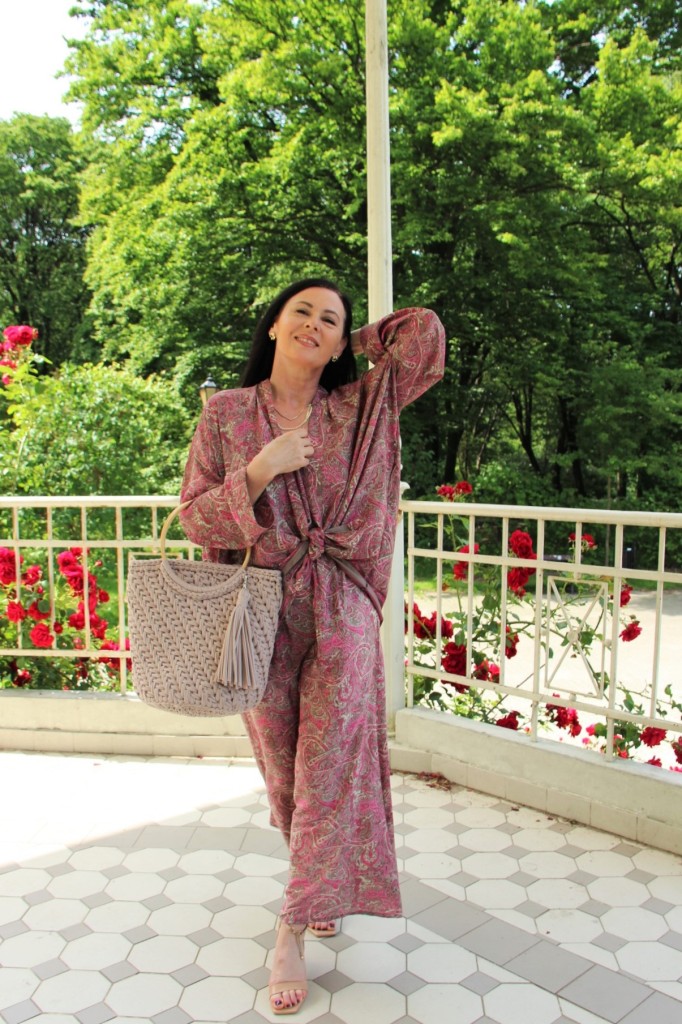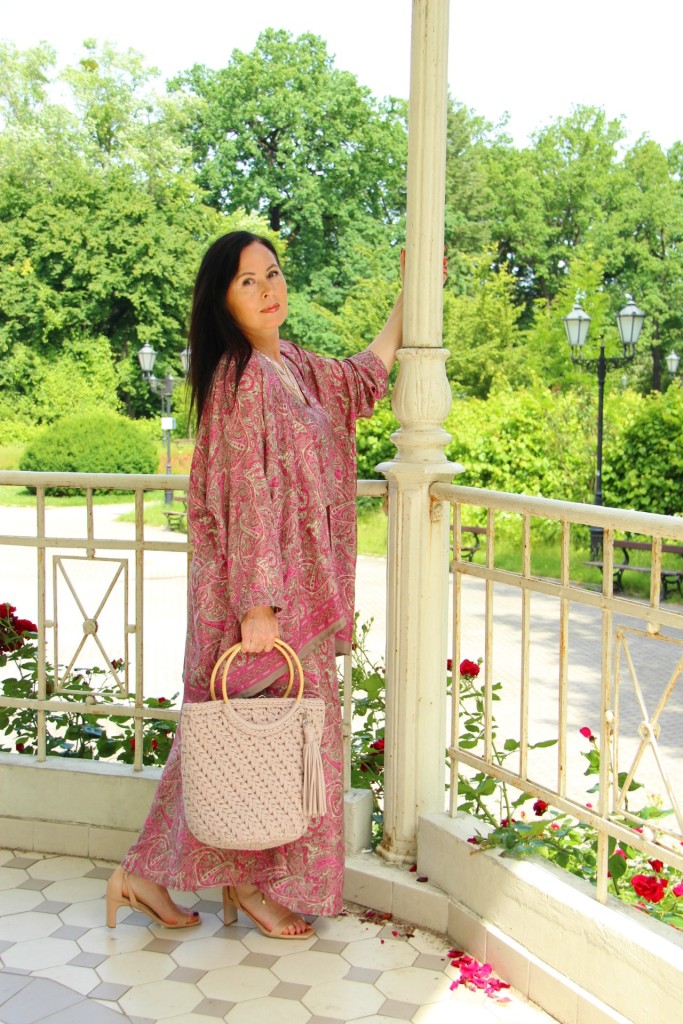 Różowa sukienka na ramiączkach i krótkie kimono, to mój wybór na bardzo upalny dzień. Ostatnio rozkochałam się we wszystkich odcieniach różu, więc tego lata jeszcze zobaczycie mnie w tym kolorze. Postawiłam dziś na dodatki w delikatnych odcieniach, które nie zdominują stylizacji, lecz jeszcze bardziej podkreślą jej charakter. Wybrałam więc, bawełniany kosz z bambusowymi rączkami w kolorze ivory i skórzane sandały na obcasie w odcieniu nude, a z biżuterii małe kolczyki i naszyjnik z łańcuszków.