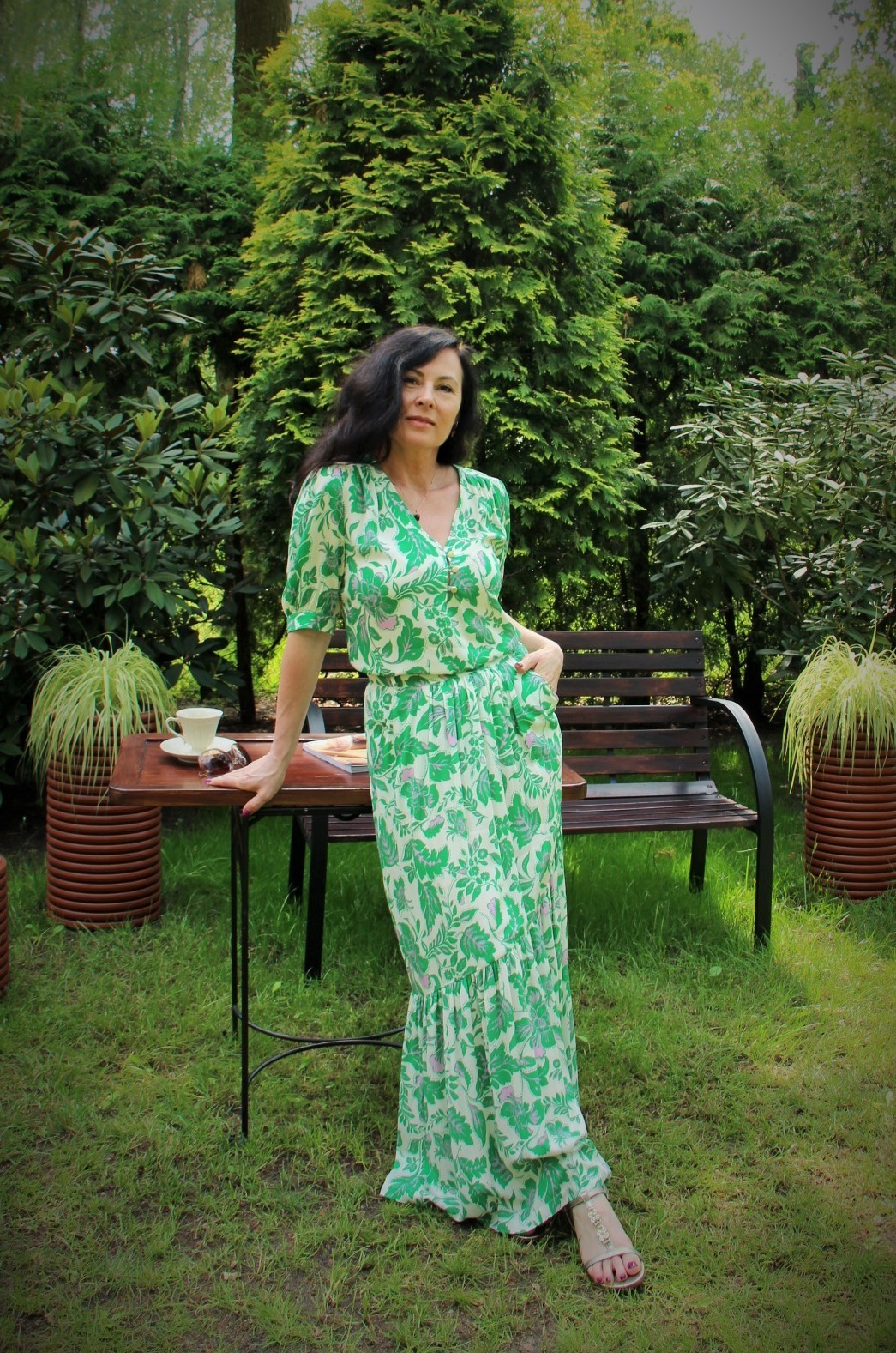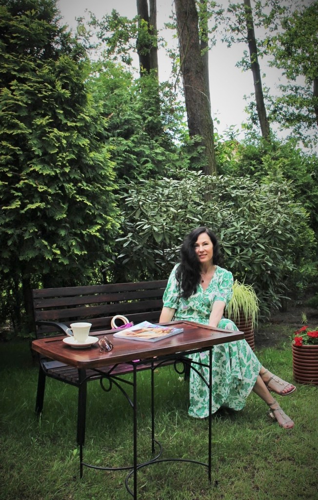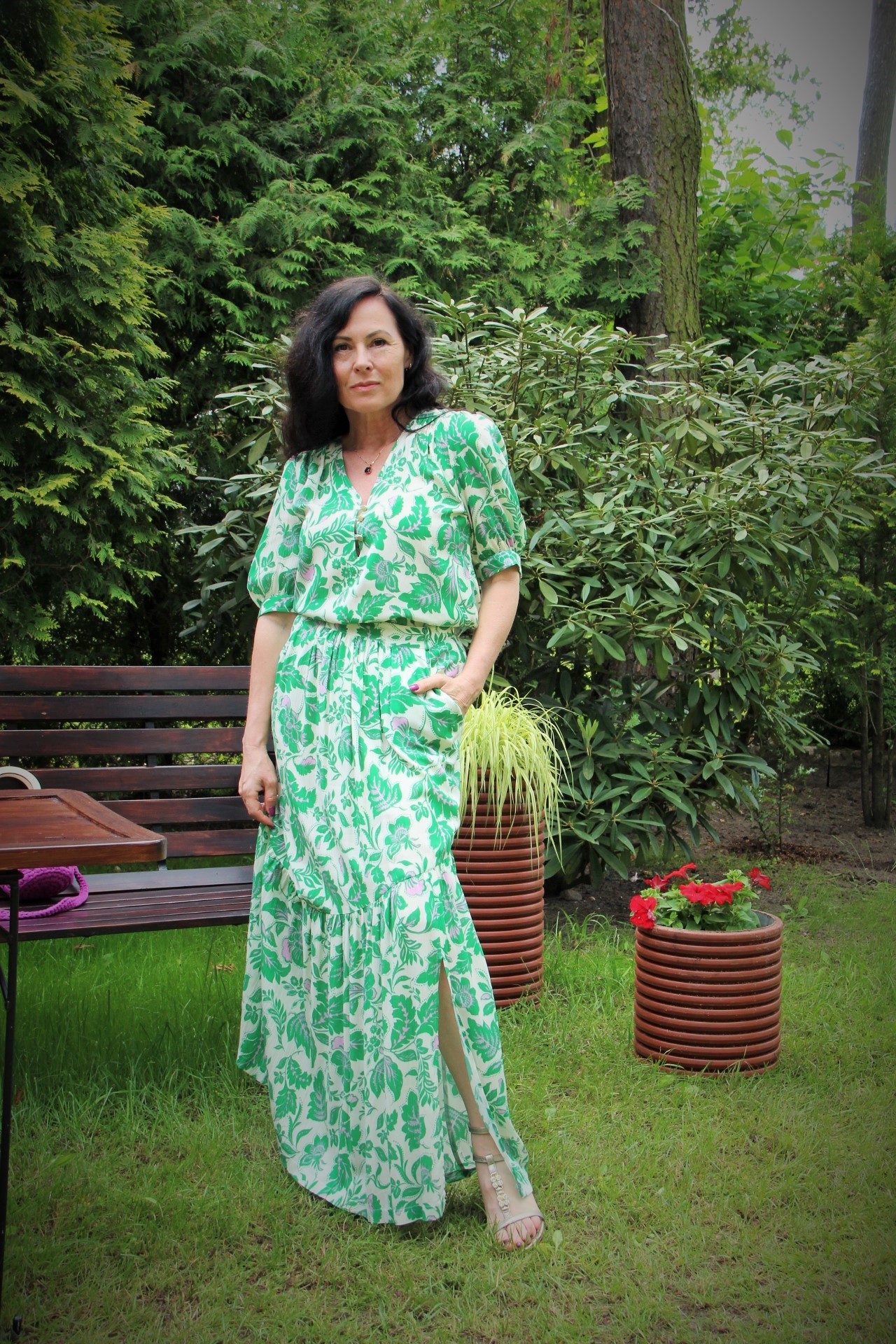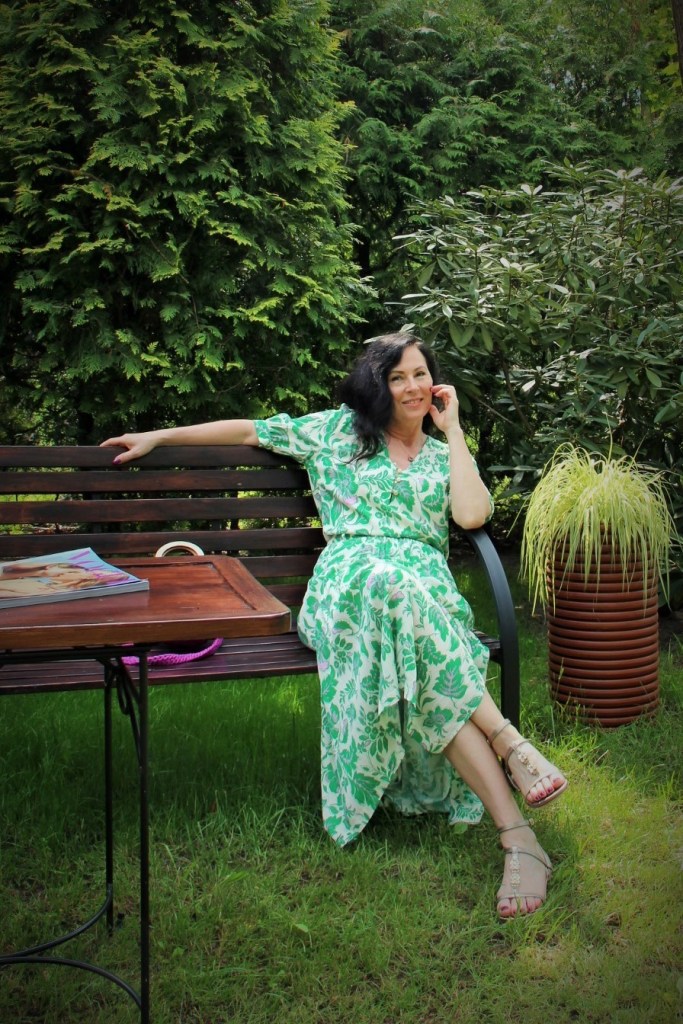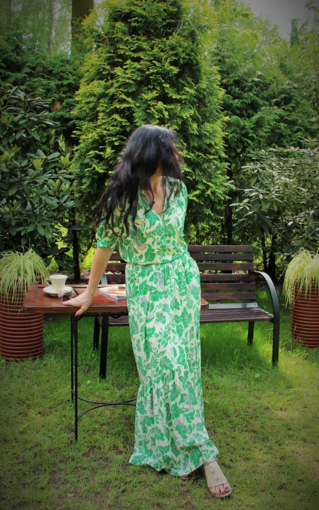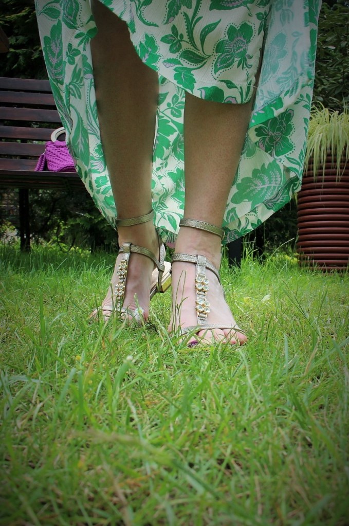 Zielono – lawendowe kwiaty na spódnicy maxi i bluzce, to moja romantyczna propozycja na powitanie lata. Kolczykami i wisiorkiem podkreśliłam retro charakter stylizacji. Do chodzenia po trawie wybrałam delikatne, lecz pięknie zdobione złote sandały.
