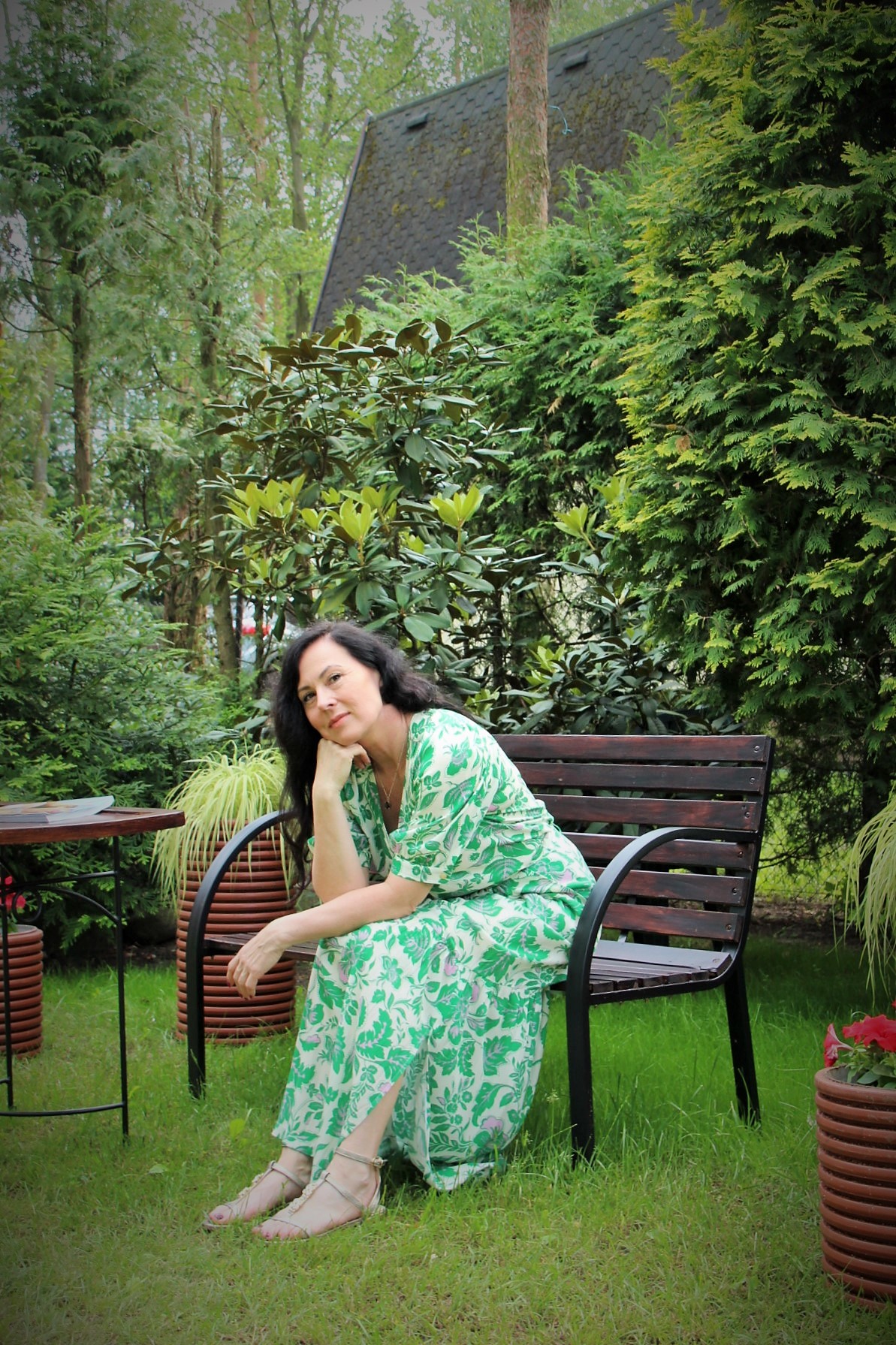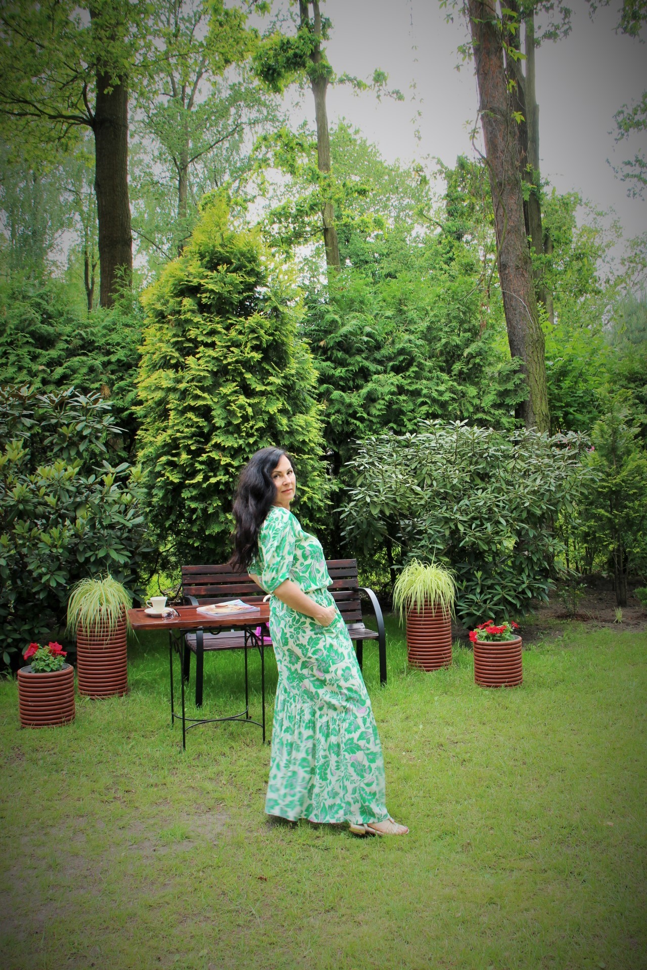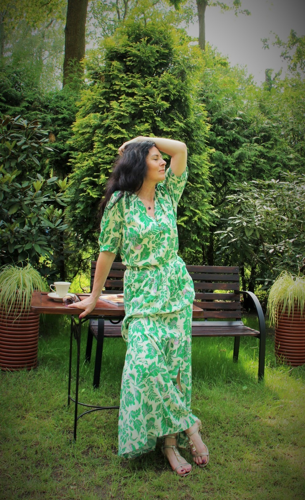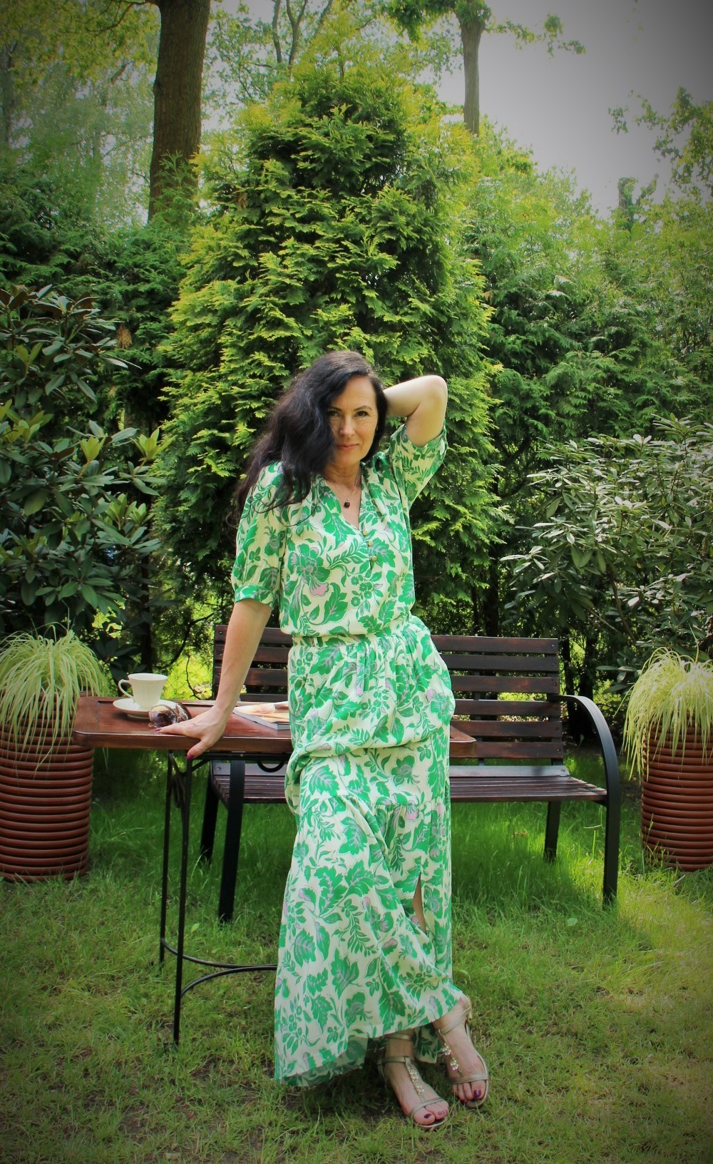 Zielono – lawendowe kwiaty na spódnicy maxi i bluzce, to moja romantyczna propozycja na powitanie lata. Kolczykami i wisiorkiem podkreśliłam retro charakter stylizacji. Do chodzenia po trawie wybrałam delikatne, lecz pięknie zdobione złote sandały.