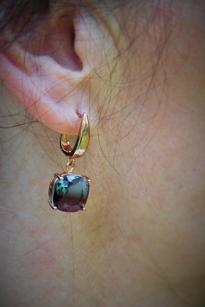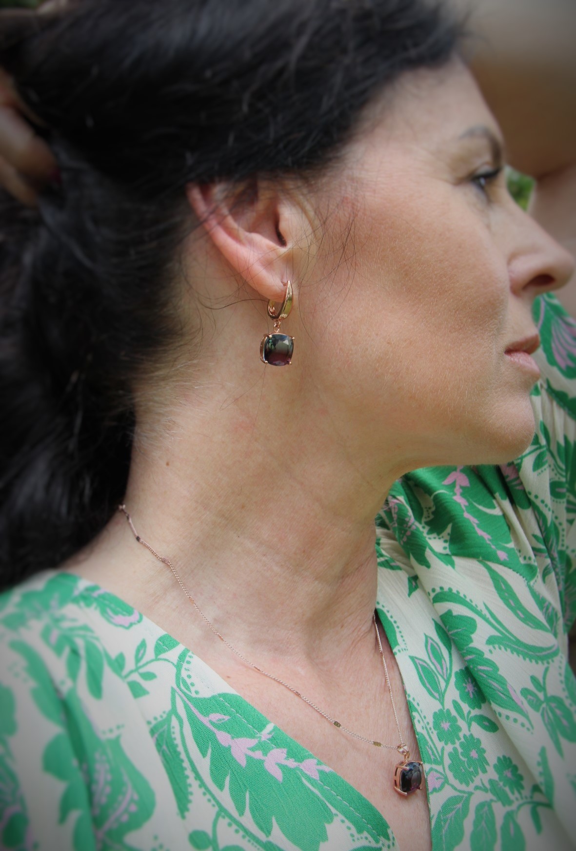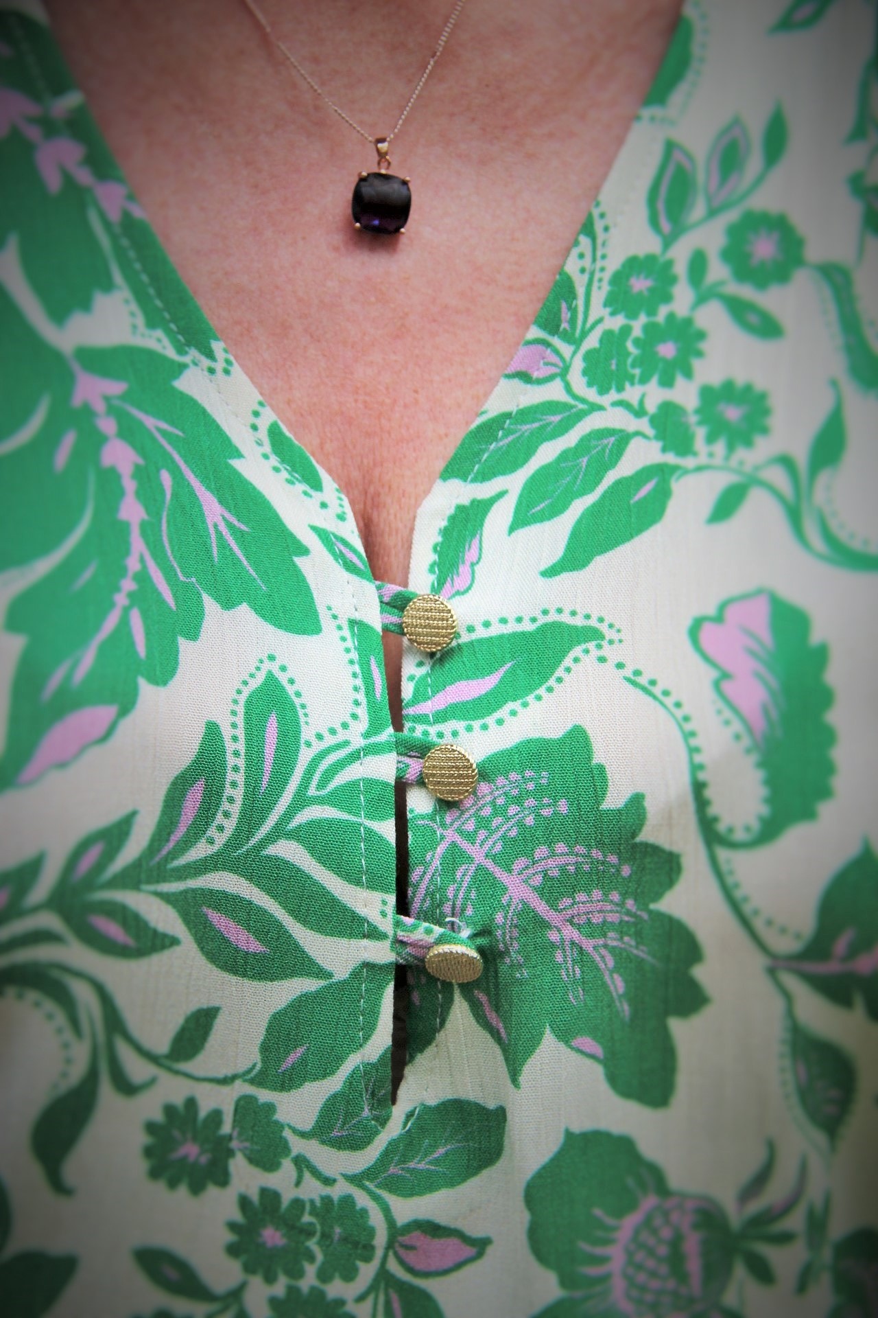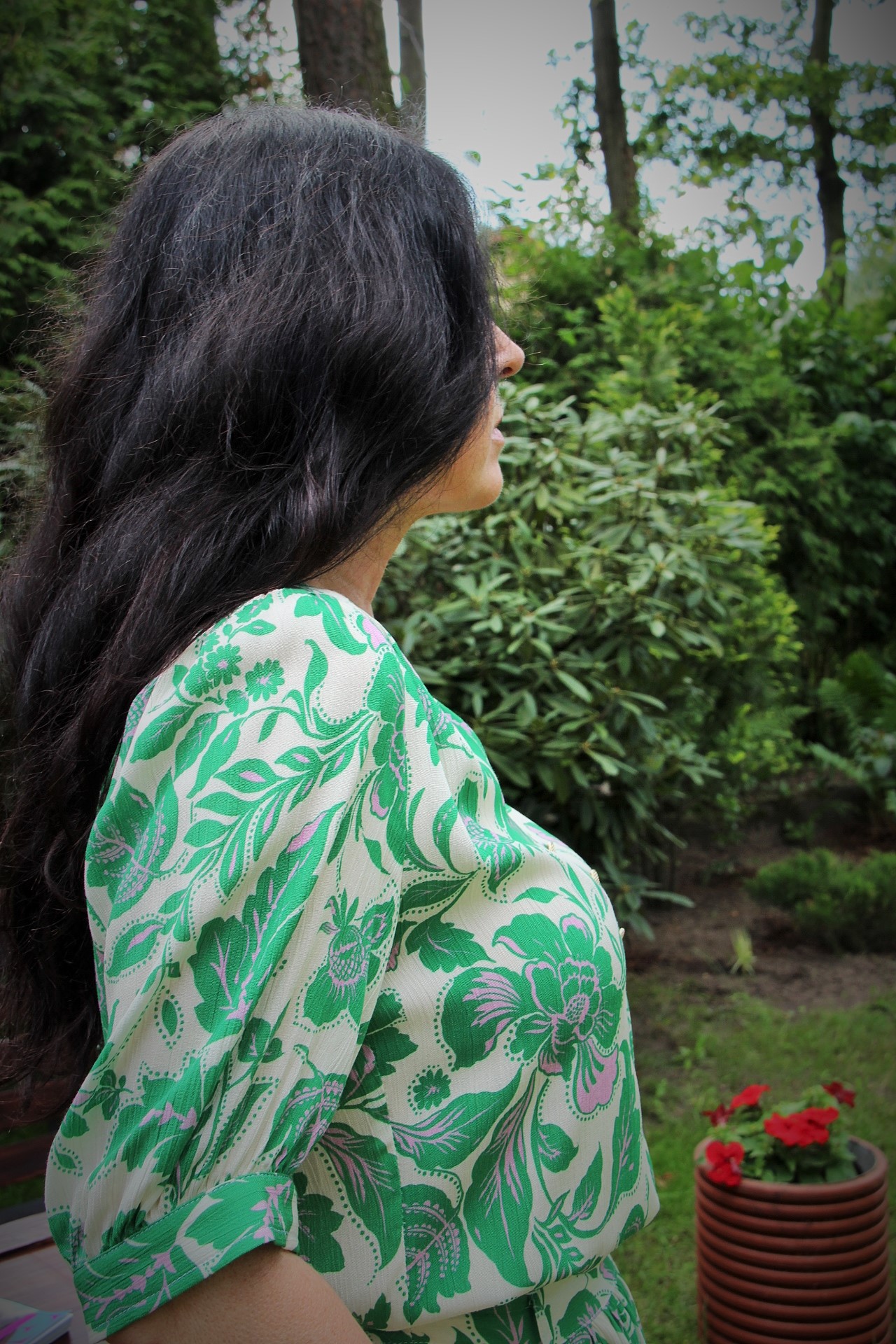 Zielono – lawendowe kwiaty na spódnicy maxi i bluzce, to moja romantyczna propozycja na powitanie lata. Kolczykami i wisiorkiem podkreśliłam retro charakter stylizacji. Do chodzenia po trawie wybrałam delikatne, lecz pięknie zdobione złote sandały.