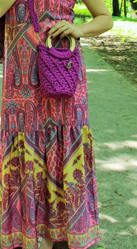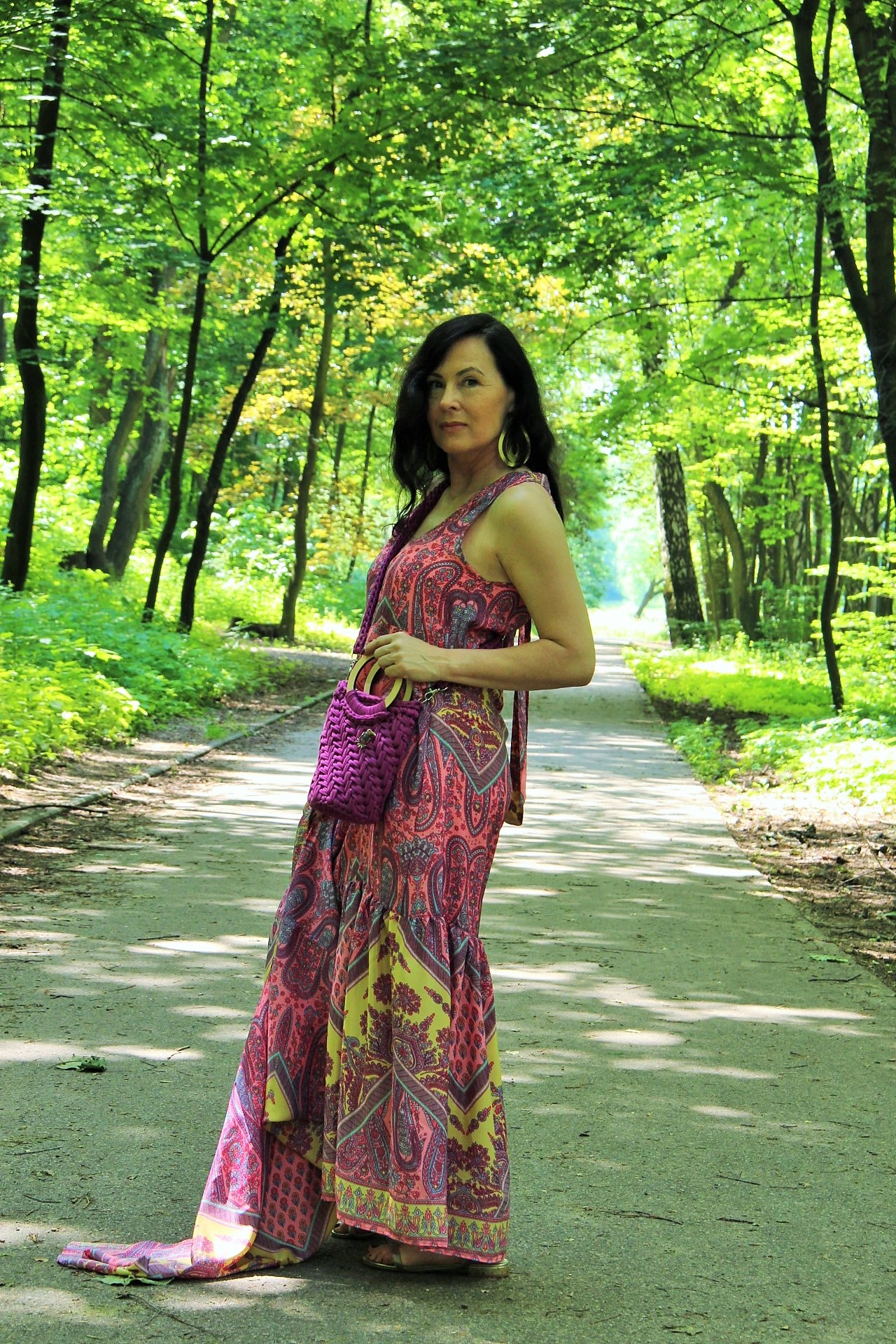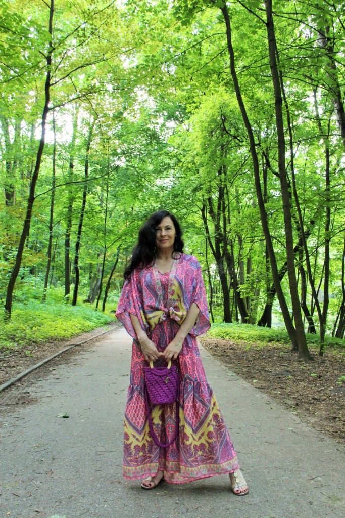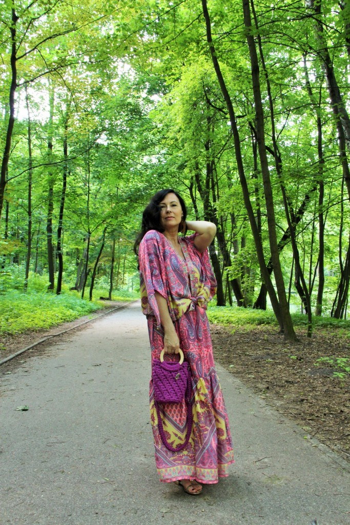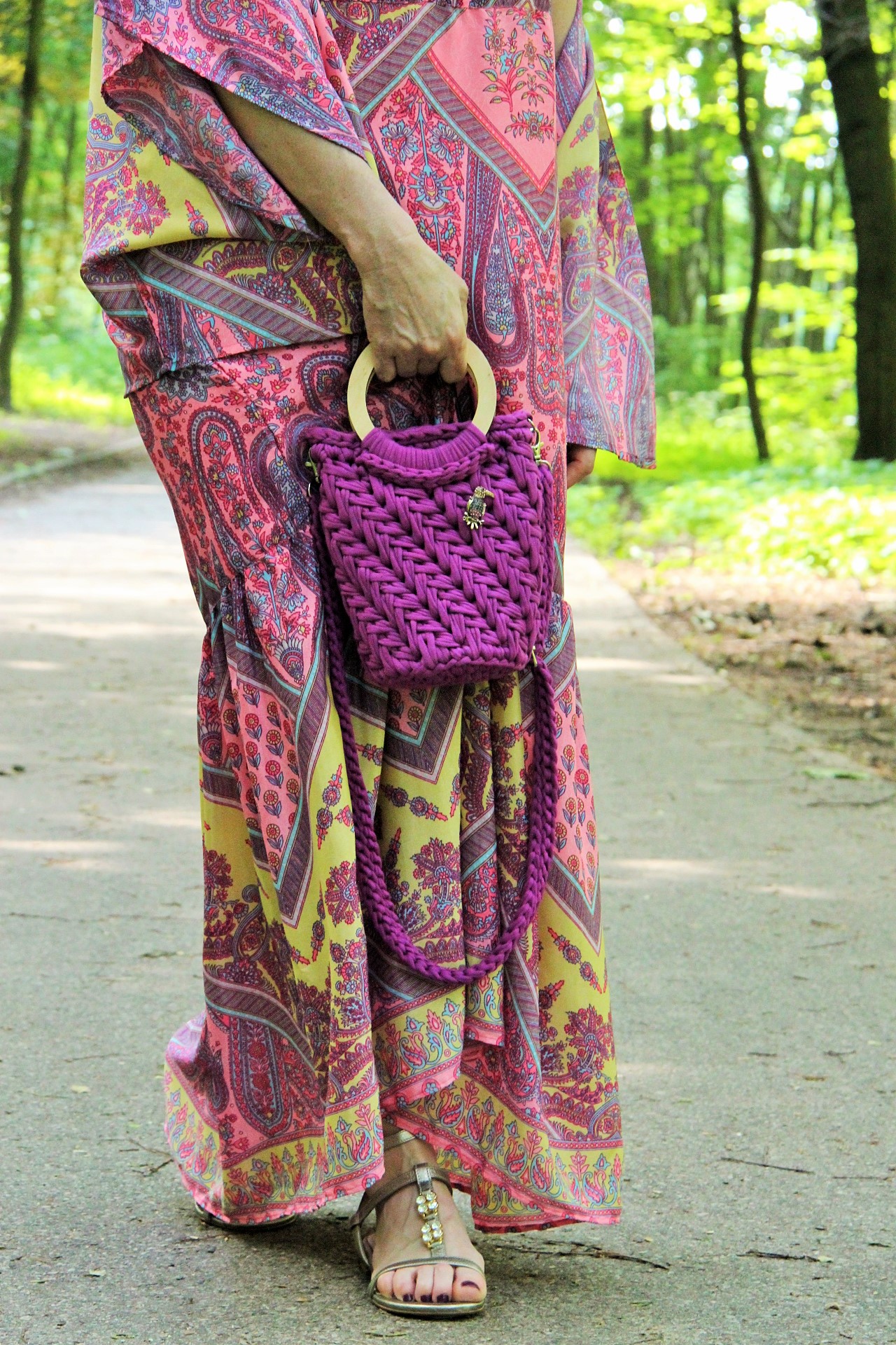 Sukienka w stylu Bollywood, lub jeśli wolisz w stylu boho sprawdzi się zarówno na garden party jak i również na weselu. W zestawie do sukienki jest krótkie kimono, które pomimo upałów może się przydać późnymi wieczorami. Aby look był bardziej orientalny, włożyłam duże, złote kolczyki oraz złote sandały, przyozdobione kryształami Swarovskiego. Z kolei wspaniałe uzupełnienie każdej stylizacji stanowią, kolorowe torebki marki Pleciuga, które ostatnio robią furorę nawet w Dubaju. Dlatego też wybrałam z tej marki, mały koszyk KARDAMON MINI w intensywnym kolorze.