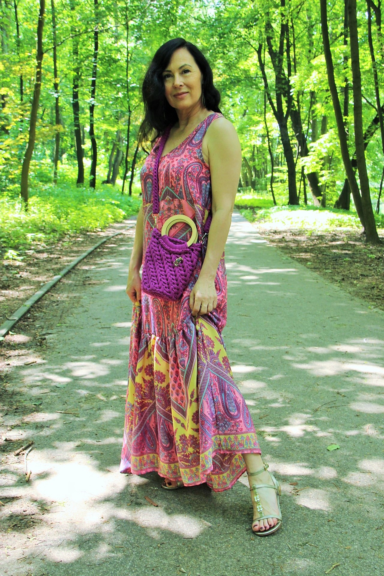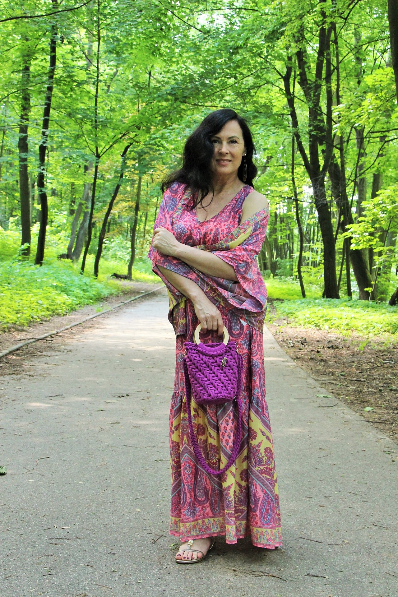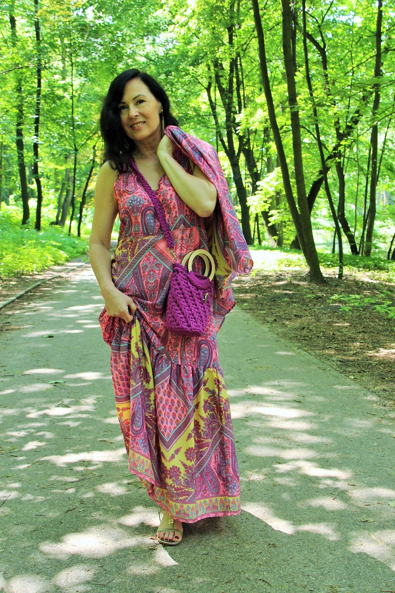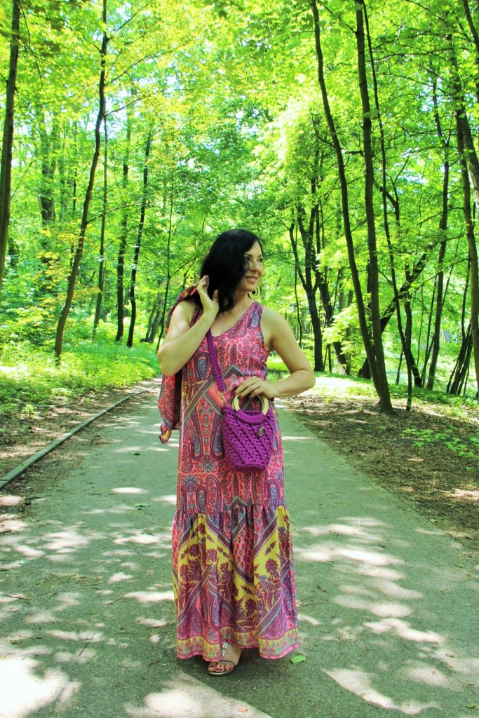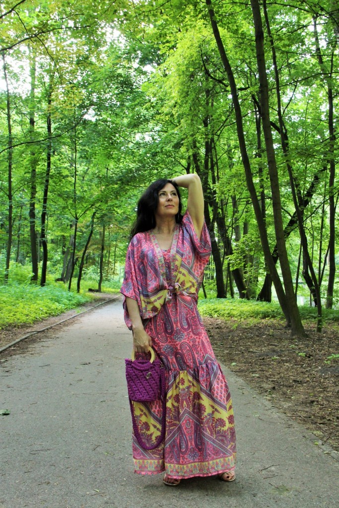 Sukienka w stylu Bollywood, lub jeśli wolisz w stylu boho sprawdzi się zarówno na garden party jak i również na weselu. W zestawie do sukienki jest krótkie kimono, które pomimo upałów może się przydać późnymi wieczorami. Aby look był bardziej orientalny, włożyłam duże, złote kolczyki oraz złote sandały, przyozdobione kryształami Swarovskiego. Z kolei wspaniałe uzupełnienie każdej stylizacji stanowią, kolorowe torebki marki Pleciuga, które ostatnio robią furorę nawet w Dubaju. Dlatego też wybrałam z tej marki, mały koszyk KARDAMON MINI w intensywnym kolorze.